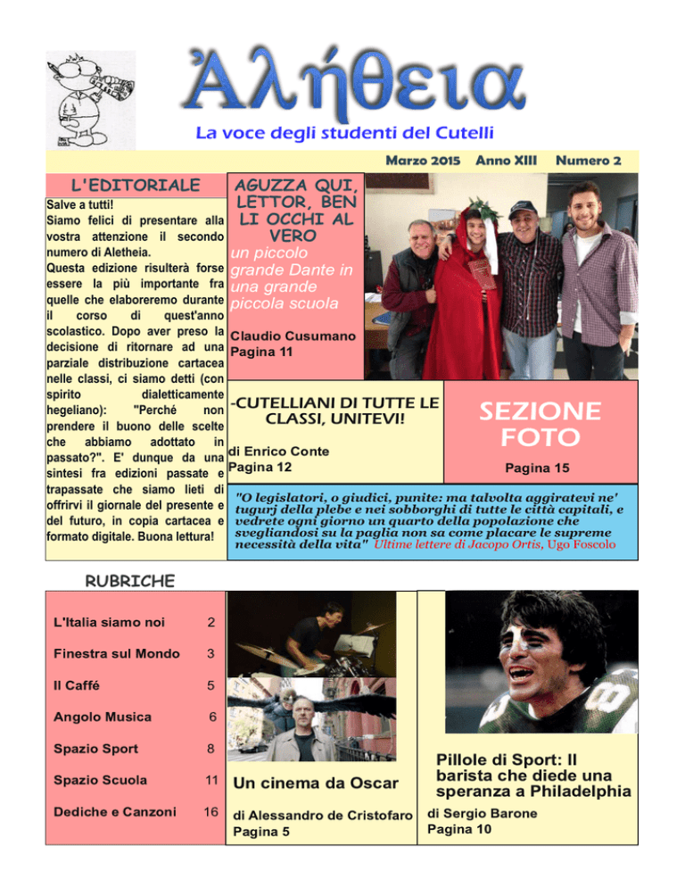 La voce degli studenti del Cutelli Marzo 2015 L'EDITORIALE Anno XIII Numero 2 AGUZZA QUI, LETTOR, BEN LI OCCHI AL VERO Salve a tutti! Siamo felici di presentare alla vostra attenzione il secondo numero di Aletheia. un piccolo Questa edizione risulterà forse grande Dante in essere la più importante fra una grande quelle che elaboreremo durante piccola scuola il corso di quest'anno scolastico. Dopo aver preso la Claudio Cusumano decisione di ritornare ad una Pagina 11 parziale distribuzione cartacea nelle classi, ci siamo detti (con spirito dialetticamente hegeliano): "Perché non -CUTELLIANI DI TUTTE LE CLASSI, UNITEVI! prendere il buono delle scelte che abbiamo adottato in passato?". E' dunque da una di Enrico Conte Pagina 1 5 sintesi fra edizioni passate e Pagina 1 2 trapassate che siamo lieti di "O legislatori, o giudici, punite: ma talvolta aggiratevi ne' offrirvi il giornale del presente e tugurj della plebe e nei sobborghi di tutte le città capitali, e del futuro, in copia cartacea e vedrete ogni giorno un quarto della popolazione che svegliandosi su la paglia non sa come placare le supreme formato digitale. Buona lettura! di SEZIONE FOTO necessità della vita" Ultime lettere di Jacopo Ortis, Ugo Foscolo RUBRICHE L'Italia siamo noi 2 Finestra sul Mondo 3 Il Caffé 5 Angolo Musica 6 Spazio Sport 8 Spazio Scuola 11 Dediche e Canzoni 1 6 di Alessandro de Cristofaro di Sergio Barone Un cinema da Oscar Pagina 5 Pillole di Sport: Il barista che diede una speranza a Philadelphia Pagina 1 0 Marzo 2015 LItalia siamo noi Anno XIII Numero 2 NON PROVATE A TOCCARE DI MATTEO Antonino Di Matteo (detto Nino) nasce a Palermo il 26 Aprile 1 961 . Nel 1 991 entra in magistratura presso la DDA di Caltanissetta. Divenuto Pubblico Ministero (PM), nel 1 999 inizia ad indagare sulle stragi di mafia in cui persero la vita i giudici Falcone e Borsellino insieme alla loro scorta. Nel corso della sua carriera si è occupato più volte dei rapporti tra criminalità ed esponenti delle istituzioni, e, ancora, della trattativa “Stato-mafia”. Nel Dicembre 201 3, l’allora ministro dell’interno Angelino Alfano ha elevato il grado di protezione del magistrato al massimo livello, poiché qualche mese prima era stata 2 intercettata una conversazione di Totò Riina con Alberto Lorusso (boss della Sacra Corona Unita) in cui lo stesso Riina recitava testuali parole, riferite al PM: “A questo ci faccio fare la stessa fine degli altri”. Il ministro Alfano, inoltre, fece installare nelle auto del magistrato il dispositivo “Bomb Jammer” (ovvero disturbatore di frequenze: questo dispositivo serve a troncare qualsiasi segnale nell’arco di 1 0 kilometri, in modo tale da evitare attentati tramite telecomandi), e diede a Di Matteo un mezzo blindato “Volvo Lince” (miglior blindato in commercio). Il PM, però, rifiutò l’assegnazione di questo blindato perché considerato da lui un vero e proprio “carro armato”, ritenendo impossibile il movimento in zone urbane. Il 1 9 Luglio 201 4, durante la commemorazione della strage di Via D’Amelio (nella quale persero la vita il giudice Borsellino e parte della sua scorta), Di Matteo ha espresso considerazioni assai critiche nei confronti di Giorgio Napolitano, Silvio Berlusconi e Matteo Renzi, le quali hanno provocato immediate reazioni da parte di esponenti politici di Forza Italia, Nuovo Centrodestra (NCD) e Scelta Civica. Christian La Russia Marzo 2015 Finestra sul Mondo Anno XIII Numero 2 UNA SEMPLICE PEDINA E IL COMMERCIO DELLA DROGA La testimonianza di un giovane ritrovatosi a vivere in carcere a causa della droga Zero prospettive per il futuro e disoccupazione spingono i ragazzi portoghesi,come tanti altri, ad entrare nel pericoloso tunnel della droga: molti infatti decidono di farsi reclutare da narcotrafficanti per commerciarla. La ricompensa è altissima, ma il rischio di finire dietro le sbarre non è da meno. Jonas è un ragazzo portoghese. All’età di quindici anni aveva iniziato a lavorare facendo l’aiutante pasticcere, dovendo mantenere il padre ex tossico dipendente. Con il suo misero stipendio riusciva a malapena a pagare l’affitto e le spese domestiche. Poi c’erano il cibo, le medicine. All’età di ventidue anni decise di intraprendere un viaggio che avrebbe cambiato la sua vita. Consegnato il suo documento all’algerino narcotrafficante, ha ricevuto un biglietto aereo, il piano del viaggio, un telefonino e mille euro per le spese. Jonas avrebbe riportato indietro dal Brasile un chilo di cocaina in piccole dosi distribuite tra il bagaglio a mano e il portadocumenti. Doveva inventare una storia, essere sicuro di sé e seguire le istruzioni scritte in codice o ricevute da voci a lui sconosciute. “Non sappiamo mai per chi lavoriamo, l’importante è avere fiducia.” Spiega Flavio, reclutatore algerino. Anche lui ha trasportato droga, è stato in Marocco, Spagna,Turchia. “In genere i reclutatori hanno fatto i corrieri in passato, ma non hanno il coraggio di ricominciare.” Flavio racconta di uno stile di vita difficile da abbandonare. Jonas è solo all’inizio. E’partito da Lisbona su un treno diretto a Bilbao, Spagna, per poi dirigersi a Natal, Brasile. La partenza da Bilbao serve solo a confondere le idee agli investigatori che indagano sul traffico di droga in Portogallo. “Oggi ci sono più reclutatori, ma soprattutto persone disposte a fare i corrieri” spiega Rui Sosa, ispettore capo dell’ Unità nazionale di combattimento per il traffico di stupefacenti. “Spesso è gente che non sa cosa fare nella vita, sono persone sposate con figli, madri disoccupate con figli malati. Oppure persone senza prospettive come me” spiega Jonas. In Brasile è stato accolto da alcuni colombiani che gli hanno consegnato la droga in un grande appartamento nella periferia di Malaus. “Mi hanno portato a vedere la città, siamo usciti la sera come dei turisti” racconta. Il decimo giorno i Colombiani gli hanno preparato lo zaino: dovev