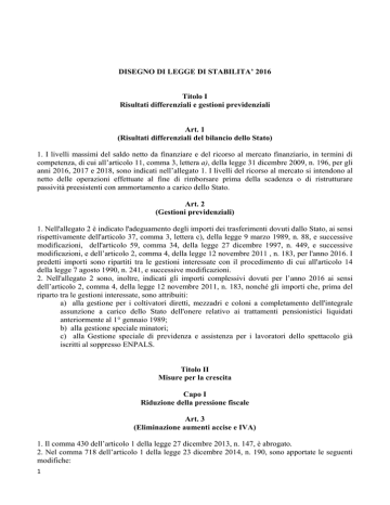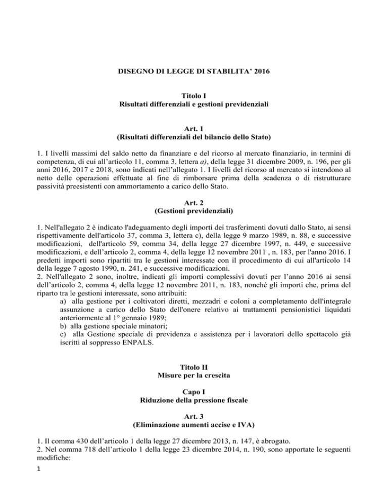 DISEGNO DI LEGGE DI STABILITA’ 2016 Titolo I Risultati differenziali e gestioni previdenziali Art. 1 (Risultati differenziali del bilancio dello Stato) 1. I livelli massimi del saldo netto da finanziare e del ricorso al mercato finanziario, in termini di competenza, di cui all’articolo 11, comma 3, lettera a), della legge 31 dicembre 2009, n. 196, per gli anni 2016, 2017 e 2018, sono indicati nell’allegato 1. I livelli del ricorso al mercato si intendono al netto delle operazioni effettuate al fine di rimborsare prima della scadenza o di ristrutturare passività preesistenti con ammortamento a carico dello Stato. Art. 2 (Gestioni previdenziali) 1. Nell'allegato 2 è indicato l'adeguamento degli importi dei trasferimenti dovuti dallo Stato, ai sensi rispettivamente dell'articolo 37, comma 3, lettera c), della legge 9 marzo 1989, n. 88, e successive modificazioni, dell'articolo 59, comma 34, della legge 27 dicembre 1997, n. 449, e successive modificazioni, e dell’articolo 2, comma 4, della legge 12 novembre 2011 , n. 183, per l'anno 2016. I predetti importi sono ripartiti tra le gestioni interessate con il procedimento di cui all'articolo 14 della legge 7 agosto 1990, n. 241, e successive modificazioni. 2. Nell'allegato 2 sono, inoltre, indicati gli importi complessivi dovuti per l’anno 2016 ai sensi dell’articolo 2, comma 4, della legge 12 novembre 2011, n. 183, nonché gli importi che, prima del riparto tra le gestioni interessate, sono attribuiti: a) alla gestione per i coltivatori diretti, mezzadri e coloni a completamento dell'integrale assunzione a carico dello Stato dell'onere relativo ai trattamenti pensionistici liquidati anteriormente al 1° gennaio 1989; b) alla gestione speciale minatori; c) alla Gestione speciale di previdenza e assistenza per i lavoratori dello spettacolo già iscritti al soppresso ENPALS. Titolo II Misure per la crescita Capo I Riduzione della pressione fiscale Art. 3 (Eliminazione aumenti accise e IVA) 1. Il comma 430 dell’articolo 1 della legge 27 dicembre 2013, n. 147, è abrogato. 2. Nel comma 718 dell’articolo 1 della legge 23 dicembre 2014, n. 190, sono apportate le seguenti modifiche: 1 a) alla lettera a) le parole “di due punti percentuali a decorrere dal 1° gennaio 2016 e di un ulteriore punto percentuale dal 1 gennaio 2017” sono sostituite dalle seguenti “di tre punti percentuali dal 1° gennaio 2017”; b) alla lettera b) le parole “di due punti percentuali a decorrere dal 1° gennaio 2016, di un ulteriore punto percentuale dal 1° gennaio 2017 e di ulteriori 0,5 punti percentuali dal 1° gennaio 2018” sono sostituite dalle seguenti “di due punti percentuali dal 1° gennaio 2017 e di un ulteriore punto percentuale dal 1° gennaio 2018”; c) nella lettera c) le parole “700 milioni per l'anno 2018” sono sostituite dalle seguenti “350 milioni per l’anno 2018”. 3. Nel comma 632 dell’articolo 1 delle legge 23 dicembre 2014, n. 190, al terzo periodo, le parole da “con provvedimento del direttore dell’Agenzia delle dogane e dei monopoli” fino alla fine sono soppresse. Art. 4 (Esenzione per l’abitazione principale, i macchinari imbullonati, i terreni agricoli) 1. All’articolo 13 del decreto legge 6 dicembre 2011, n. 201, convertito, con modificazioni dalla legge 22 dicembre 2011, n. 214: a) al comma 5 il secondo periodo è abrogato; b) il comma 8-bis è abrogato; c) al comma 13-bis le parole: “21 ottobre” sono sostituite dalle seguenti “termine perentorio del 14 ottobre”; 2. Al comma 8 dell’articolo 9 del decreto legislativo 14 marzo 2011, n. 23 l’ultimo periodo è abrogato. 3. A decorrere dall’anno 2016, l’esenzione dall'imposta municipale propria (IMU) prevista dalla lettera h) del comma 1 dell'articolo 7 del decreto legislativo 30 dicembre 1992, n. 504, si applica sulla base dei criteri individuati dalla circolare n. 9 del 14 giugno 1993, pubblicata nel supplemento ordinario n. 53 della Gazzetta Ufficiale n. 141 del 18 giugno 1993. Sono, altresì, esenti dall’IMU i terreni agricoli: a) posseduti e condotti dai coltivatori diretti e dagli imprenditori agricoli professionali di cui all'articolo 1 del decreto legislativo 29 marzo 2004, n. 99, iscritti nella previdenza agricola, indipendentemente dalla loro ubicazione; b) ubicati nei comuni delle isole minori di cui all'allegato A della legge 28 dicembre 2001, n. 448; c) a immutabile destinazione agro-silvo-pastorale a proprietà collettiva indivisibile e inusucapibile. A decorrere dall’anno 2016, sono abrogati i commi da 1 a 9-bis dell’articolo 1 del decreto-legge 24 gennaio 2015, n. 4, convertito, con modificazioni, dalla legge 24 marzo 2015, n. 34. 4. All’articolo 1 della legge 27 dicembre 2013, n. 147: a) al comma 639 le parole: “a carico sia del possessore che dell'utilizzatore dell'immobile” sono sostituite dalle seguenti: “a carico, sia del possessore che dell'utilizzatore dell'immobile, escluse le unità immobiliari destinate ad abitazione principale dal possessore nonché dall’utilizzatore e dal suo nucleo familiare, ad eccezione di quelle classificate nelle categorie catastali A/1, A/8 e A/9.”; b) il comma 669 è sostituito dal seguente: “669. Il presupposto impositivo della TASI è il possesso o la detenzione, a qualsiasi titolo, di fabbricati e di aree edificabili, ad eccezione, in ogni caso, dei terreni agricoli e dell’abitazione principale, come definiti ai sensi 2 dell'imposta municipale propria, escluse quelle classificate nelle categorie catastali A/1, A/8 e A/9.”; c) al comma 678 è aggiunto in fine il seguente periodo: “Per i fabbricati costruiti e destinati dall'impresa costruttrice alla vendita, fintanto che permanga tale destinazione e non siano in ogni caso locati, l’aliquota è ridotta allo 0,1 per cento. I comuni possono modificare la suddetta aliquota, in aumento, sino allo 0,25 per cento o, in diminuzione, fino all’azzeramento.”; d) al comma 681, sono aggiunti in fine i seguenti pe