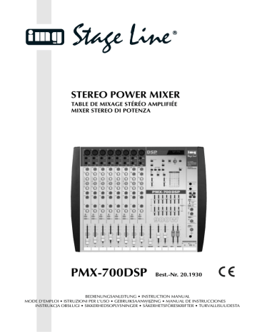 STEREO POWER MIXER TABLE DE MIXAGE STÉRÉO AMPLIFIÉE MIXER STEREO DI POTENZA PMX-700DSP Best.-Nr. 20.1930 BEDIENUNGSANLEITUNG • INSTRUCTION MANUAL MODE D’EMPLOI • ISTRUZIONI PER L’USO • GEBRUIKSAANWIJZING • MANUAL DE INSTRUCCIONES INSTRUKCJA OBSLUGI • SIKKERHEDSOPLYSNINGER • SÄKERHETSFÖRESKRIFTER • TURVALLISUUDESTA D Bevor Sie einschalten ... A Wir wünschen Ihnen viel Spaß mit Ihrem neuen Gerät von „img Stage Line“. Dabei soll Ihnen diese Bedienungsanleitung helfen, alle Funktionsmöglichkeiten kennen zu lernen. Die Beachtung der Anleitung vermeidet außerdem Fehlbedienungen und schützt Sie und Ihr Gerät vor eventuellen Schäden durch unsachgemäßen Gebrauch. Den deutschen Text finden Sie auf den Seiten 4 – 16. CH F Avant toute mise en service ... B Nous vous remercions d’avoir choisi un appareil “img Stage Line” et vous souhaitons beaucoup de plaisir à l’utiliser. Cette notice a pour objectif de vous aider à mieux connaître les multiples facettes de l’appareil et à vous éviter toute mauvaise manipulation. CH GB We wish you much pleasure with your new unit by “img Stage Line”. With these operating instructions you will be able to get to know all functions of the unit. By following these instructions false operations will be avoided, and possible damage to you and your unit due to improper use will be prevented. You will find the English text on the pages 4 – 16. I Voordat u inschakelt ... B Wij wensen u veel plezier met uw nieuw toestel van “img Stage Line”. Met behulp van bijgaande gebruiksaanwijzing zal u alle functiemogelijkheden leren kennen. Door deze instructies op te volgen zal een slechte werking vermeden worden, en zal een eventueel letsel aan uzelf en schade aan uw toestel tengevolge van onzorgvuldig gebruik worden voorkomen. U vindt de nederlandstalige tekst op de pagina’s 30 – 42. PL Przed uruchomieniem … Prima di accendere ... Vi auguriamo buon divertimento con il Vostro nuovo apparecchio “img Stage Line”. Le istruzioni per l’uso Vi possono aiutare a conoscere tutte le possibili funzioni. E rispettando quanto spiegato nelle istruzioni, evitate di commettere degli errori, e così proteggete Voi stessi, ma anche l’apparecchio, da eventuali rischi per uso improprio. Il testo italiano lo potete trovare alle pagine 17 – 29. La version française se trouve pages 17 – 29. NL Before you switch on ... E Antes de cualquier instalación ... Tenemos de agradecerle el haber adquirido un aparato “img Stage Line” y le deseamos un agradable uso. Este manual quiere ayudarle a conocer las multiples facetas de este aparato. La observación de las instrucciones evita operaciones erróneas y protege Vd. y vuestro aparato contra todo daño posible por cualquier uso inadecuado. La versión española se encuentra en las páginas 30 – 42. DK Życzymy zadowolenia z nowego produktu “ img Stage Line”. Dzięki tej instrukcji obsługi będą państwo w stanie poznać wszystkie funkcje tego urządzenia. Stosując się do instrukcji unikną państwo błędów i ewentualnego uszkodzenia urządzenia na skutek nieprawidłowego użytkowania. Inden De tænder for apparatet ... Vi ønsker Dem god fornøjelse med Deres nye “img Stage Line” apparat. Læs oplysningerne for en sikker brug af apparatet før ibrugtagning. Følg sikkerhedsoplysningerne for at undgå forkert betjening og for at beskytte Dem og Deres apparat mod skade på grund af forkert brug. Sikkerhedsoplysningerne finder De på side 52. Tekst polski znajduje się na stronach 43 – 49. S Förskrift Vi önskar dig mycket nöje med din nya enhet från “img Stage Line”. Läs gärna säkerhetsinstruktionerna innan du använder enheten. Genom att följa säkerhetsinstruktionerna kan många problem undvikas, vilket annars kan skada enheten. Du finner säkerhetsinstruktionerna på sidan 52. FIN Ennen virran kytkemistä ... Toivomme, että uusi “img Stage Line”-laitteesi tuo sinulle paljon iloa ja hyötyä. Ole hyvä ja lue käyttöohjeet ennen laitteen käyttöönottoa. Luettuasi käyttöohjeet voit käyttää laitetta turvallisesti ja vältyt laitteen väärinkäytöltä. Käyttöohjeet löydät sivulta 52. w w w.imgstageline.com 2 39 MIC MIC 1 1 1 5 BPM – 52 1 mS 2 3 4 5 LINE INSERT RIGHT TIP: SEND RING: RTN M1 1 GAIN GAIN 20 30 10 60dB 6 MIC 20 30 10 50dB 40 40 7 8 0 HI 12kHz –15 22 23 24 25 26 27 28 29 30 31 LEFT/ MONO LINE GAIN +5 LINE 0 +10 -10 +15 0 +20dB 0 HI 12kHz 9 40 EFFECT TYPE PGM EDIT RECALL F /S PARAMETER HELP 41 PGM CHECK AUX MUTE DATA ENTRY DELAY 42 USER PRESETS 1 2 3 PEAK WARM ON BRIGHT 4 STANDBY 43 44 AMP CLIP ON +8 6 EFFECT EFFECT EQ 4 REGEN 2 MAX MAX 45 0dB 3 –15 MID 32 MID 2k5 350 –15 0 0 10 MIN 45Hz 12 +15 +15 PFL SLIT RIGHT FB 46 AUX INPUT 0 10 R PMX-700 DSP TAPE REC 47 L R + 12 AUX 48 9 14 0 LEFT L/ R 33 13 AUX MIN EFFECT TO FB –15 EFF EFF L/MONO -20 +15 0 LO –15 9 12 6kHz 60Hz 6 2.5kHz 11 5k 450 LO +15 0 1k8 1k 10 –15 +15 6 3 0 10 10 L/R LEFT 0 dB 49 TAPE PLAY 3 6 PHANTOM POWER +48V 9 - 12 FB FB 34 15 0 0 10 50Hz SPLIT 150Hz 330Hz 1k 2k5 5k ASSIGN 10 AUX IN 9 BAL PAN 16 3 FB 0 RIGHT 0 dB 3 L R 18 19 20 PEAK PFL L-R GROUP 52 LEVEL 6 17 L 50 51 AMP L-R GROUP 10k GRAPHIC EQ + 12 R 9 PEAK 10 AUX IN TO FB 6 - 12 53 0 10 PFL 900 W L-R GROUP 54 L-R SPLIT AMP LEVEL 55 NORM 56 L-R FB +10 +10 35 +5 +5 +5 +5 +5 +5 0dB 0dB 0dB 0dB METER/PHONES SELECT 57 21 0 36 PHONES –5 –5 –5 –5 –10 –10 –10 –10 –15 –15 –15 –15 –20 –20 –20 –20 –20 ∞ ∞ ∞ ∞ ∞ 0dB 0dB –5 –5 –10 –10 –20 ∞ 10 58 37 ACTIVE CROSSOVER NETWORK 150Hz FULL RANGE INTERNAL HP/SUB OUT 38 M1 1 GROUP ➀ FB EFFECT LEFT 59 RIGHT ➁ ➂ MIC MIC MIC MIC MIC MIC MIC MIC 1 1 5 BPM – 52 1 mS LINE LINE LINE LINE LINE LEFT/ MONO LINE LEFT/ MONO EFFECT TYPE PGM LINE INSERT INSERT TIP: SEND RING: RTN GAIN GAIN 30 20 GAIN 30 20 60dB 10 20 60dB 10 6 20 60dB 10 20 60dB 10 60dB 10 20 MIC HI 12 kHz GAIN 30 20 MIC 60dB 10 GAIN LINE 12 kHz 