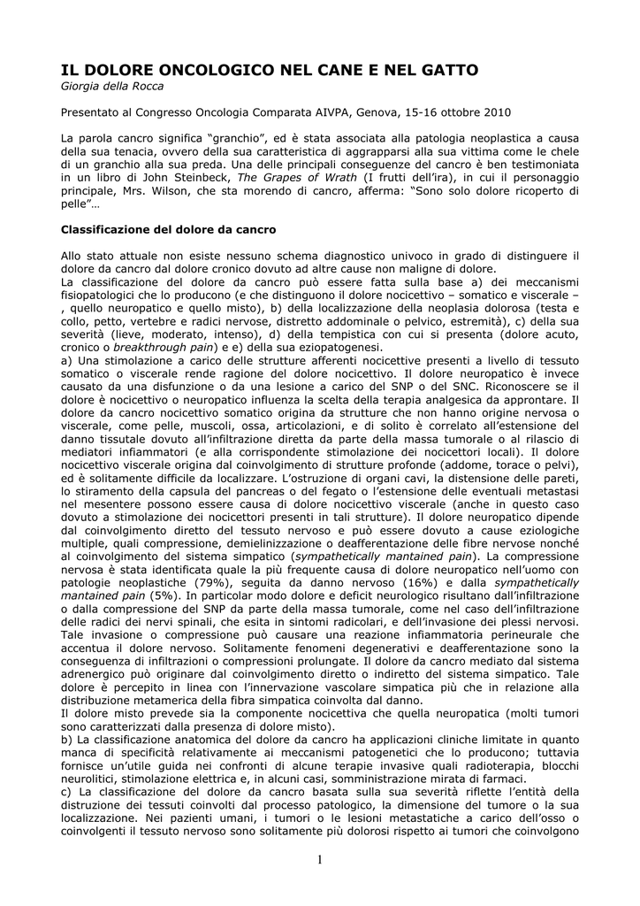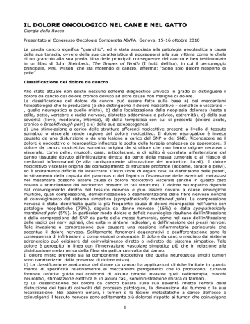 IL DOLORE ONCOLOGICO NEL CANE E NEL GATTO Giorgia della Rocca Presentato al Congresso Oncologia Comparata AIVPA, Genova, 15-16 ottobre 2010 La parola cancro significa “granchio”, ed è stata associata alla patologia neoplastica a causa della sua tenacia, ovvero della sua caratteristica di aggrapparsi alla sua vittima come le chele di un granchio alla sua preda. Una delle principali conseguenze del cancro è ben testimoniata in un libro di John Steinbeck, The Grapes of Wrath (I frutti dell’ira), in cui il personaggio principale, Mrs. Wilson, che sta morendo di cancro, afferma: “Sono solo dolore ricoperto di pelle”… Classificazione del dolore da cancro Allo stato attuale non esiste nessuno schema diagnostico univoco in grado di distinguere il dolore da cancro dal dolore cronico dovuto ad altre cause non maligne di dolore. La classificazione del dolore da cancro può essere fatta sulla base a) dei meccanismi fisiopatologici che lo producono (e che distinguono il dolore nocicettivo – somatico e viscerale – , quello neuropatico e quello misto), b) della localizzazione della neoplasia dolorosa (testa e collo, petto, vertebre e radici nervose, distretto addominale o pelvico, estremità), c) della sua severità (lieve, moderato, intenso), d) della tempistica con cui si presenta (dolore acuto, cronico o breakthrough pain) e e) della sua eziopatogenesi. a) Una stimolazione a carico delle strutture afferenti nocicettive presenti a livello di tessuto somatico o viscerale rende ragione del dolore nocicettivo. Il dolore neuropatico è invece causato da una disfunzione o da una lesione a carico del SNP o del SNC. Riconoscere se il dolore è nocicettivo o neuropatico influenza la scelta della terapia analgesica da approntare. Il dolore da cancro nocicettivo somatico origina da strutture che non hanno origine nervosa o viscerale, come pelle, muscoli, ossa, articolazioni, e di solito è correlato all’estensione del danno tissutale dovuto all’infiltrazione diretta da parte della massa tumorale o al rilascio di mediatori infiammatori (e alla corrispondente stimolazione dei nocicettori locali). Il dolore nocicettivo viscerale origina dal coinvolgimento di strutture profonde (addome, torace o pelvi), ed è solitamente difficile da localizzare. L’ostruzione di organi cavi, la distensione delle pareti, lo stiramento della capsula del pancreas o del fegato o l’estensione delle eventuali metastasi nel mesentere possono essere causa di dolore nocicettivo viscerale (anche in questo caso dovuto a stimolazione dei nocicettori presenti in tali strutture). Il dolore neuropatico dipende dal coinvolgimento diretto del tessuto nervoso e può essere dovuto a cause eziologiche multiple, quali compressione, demielinizzazione o deafferentazione delle fibre nervose nonché al coinvolgimento del sistema simpatico (sympathetically mantained pain). La compressione nervosa è stata identificata quale la più frequente causa di dolore neuropatico nell’uomo con patologie neoplastiche (79%), seguita da danno nervoso (16%) e dalla sympathetically mantained pain (5%). In particolar modo dolore e deficit neurologico risultano dall’infiltrazione o dalla compressione del SNP da parte della massa tumorale, come nel caso dell’infiltrazione delle radici dei nervi spinali, che esita in sintomi radicolari, e dell’invasione dei plessi nervosi. Tale invasione o compressione può causare una reazione infiammatoria perineurale che accentua il dolore nervoso. Solitamente fenomeni degenerativi e deafferentazione sono la conseguenza di infiltrazioni o compressioni prolungate. Il dolore da cancro mediato dal sistema adrenergico può originare dal coinvolgimento diretto o indiretto del sistema simpatico. Tale dolore è percepito in linea con l’innervazione vascolare simpatica più che in relazione alla distribuzione metamerica della fibra simpatica coinvolta dal danno. Il dolore misto prevede sia la componente nocicettiva che quella neuropatica (molti tumori sono caratterizzati dalla presenza di dolore misto). b) La classificazione anatomica del dolore da cancro ha applicazioni cliniche limitate in quanto manca di specificità relativamente ai meccanismi patogenetici che lo producono; tuttavia fornisce un’utile guida nei confronti di alcune terapie invasive quali radioterapia, blocchi neurolitici, stimolazione elettrica e, in alcuni casi, somministrazione mirata di farmaci. c) La classificazione del dolore da cancro basata sulla sua severità riflette l’entità della distruzione dei tessuti coinvolti dal processo patologico, la dimensione del tumore o la sua localizzazione. Nei pazienti umani, i tumori o le lesioni metastatiche a carico dell’osso o coinvolgenti il tessuto nervoso sono solitamente più dolorosi rispetto ai tumori che coinvolgono 1 i tessuti molli. La gravità del dolore da cancro è dinamica, cioè riflette il decorso della patologia e l’effetto delle terapie somministrate, pertanto è opportuno valutare la severità del dolore nel corso del tempo. d) La classificazione basata sul pattern temporale del dolore da cancro distingue il dolore acuto (quello che compare improvvisamente, è in genere piuttosto intenso ed ha un’estensione temporale limitata), quello cronico (in genere più sordo ma perdurante) e quello definito breakthrough pain, ovvero il transitorio aumento del dolore ad un livello di intensità severamassimale su un dolore continuo di fondo di intensità lieve-moderata o in un paziente senza dolore. e) Sicuramente la classificazione più valida del dolore da cancro in ragione delle importanti implicazioni diagnostiche e terapeutiche che possono scaturirne è quella basata sulla sua eziopatogenesi. Dal punto di vista eziopatogenetico il dolore da cancro può essere classificato in 4 differenti gruppi eziologici: - dolore direttamente prodotto dal tumore; - dolore dovuto alle varie modalità di trattamento; - dolore dovuto ad uno stato di debilitazione cronica che fa seguito alla pat