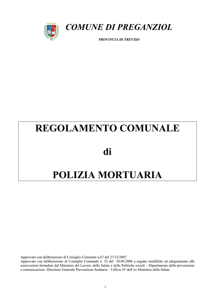 COMUNE DI PREGANZIOL PROVINCIA DI TREVISO REGOLAMENTO COMUNALE di POLIZIA MORTUARIA Approvato con deliberazione di Consiglio Comunale n.67 del 27/12/2007 Approvato con deliberazione di Consiglio Comunale n. 52 del 30.09.2008 a seguito modifiche ed adeguamento alle osservazioni formulate dal Ministero del Lavoro, della Salute e delle Politiche sociali – Dipartimento della prevenzione e comunicazione- Direzione Generale Prevenzione Sanitaria – Ufficio IV dell’ex Ministero della Salute 1 SOMMARIO TITOLO I - DISPOSIZIONI GENERALI ....................................................................................................... 4 CAPO I - DISPOSIZIONI GENERALI....................................................................................................... 4 Art. 1 - Oggetto ................................................................................................................................. 4 Art. 2 - Competenze ......................................................................................................................... 4 Art. 3 - Responsabilità ...................................................................................................................... 4 Art. 4 - Servizi gratuiti e servizi a pagamento................................................................................... 4 Art. 5 - Atti a disposizione del pubblico ............................................................................................ 5 CAPO II - DEPOSITI DI OSSERVAZIONE E OBITORI ........................................................................... 5 Art. 6 - Depositi di osservazione ed obitori....................................................................................... 5 CAPO III - FERETRI ................................................................................................................................. 5 Art. 7 - Deposizione della salma nel feretro ..................................................................................... 5 Art. 8 - Feretri per inumazione, tumulazione, cremazione e trasporti .............................................. 5 Art. 9 - Piastrina di riconoscimento................................................................................................... 6 CAPO IV - TRASPORTI FUNEBRI .......................................................................................................... 6 Art. 10 - Modalità dei trasporti ............................................................................................................ 6 Art. 11 - Orario dei trasporti e sepolture ............................................................................................. 6 Art. 12 - Norme generali per i trasporti ............................................................................................... 6 Art. 13 - Trasferimento di salme senza funerale ................................................................................ 7 Art. 14 - Morti per malattie infettive-diffusive o portatori di radioattività ............................................. 7 Art. 15 - Trasporto per e da altri Comuni per seppellimento o cremazione ....................................... 7 Art. 16 - Trasporti in luogo diverso dal cimitero.................................................................................. 7 Art. 17 - Trasporti all'estero o dall'estero............................................................................................ 7 Art. 18 - Trasporto di ceneri e resti..................................................................................................... 7 TITOLO II - CIMITERI................................................................................................................................... 8 CAPO I - CIMITERI................................................................................................................................... 8 Art. 19 - Elenco cimiteri ...................................................................................................................... 8 Art. 20 - Disposizioni generali – Vigilanza .......................................................................................... 8 Art. 21 - Ammissione nel cimitero....................................................................................................... 8 CAPO II - DISPOSIZIONI GENERALI E PIANO REGOLATORE CIMITERIALE .................................... 8 Art. 22 - Disposizioni generali............................................................................................................. 8 Art. 23 - Piano regolatore cimiteriale .................................................................................................. 9 CAPO III - INUMAZIONE E TUMULAZIONE ........................................................................................... 9 Art. 24 - Inumazione ........................................................................................................................... 9 Art. 25 - Lapidi e copritomba sulle inumazioni ................................................................................... 9 Art. 26 - Tumulazione ....................................................................................................................... 10 Art. 27 - Lampade votive, decorazioni ed iscrizioni sulle tumulazioni .............................................. 10 Art. 28 - Deposito provvisorio ........................................................................................................... 11 CAPO IV - ESUMAZIONI ED ESTUMULAZIONI ................................................................................... 11 Art. 29 - Esumazioni ordinarie .......................................................................................................... 11 Art. 30 - Avvisi di scadenza per esumazioni ordinarie ..................................................................... 12 Art. 31 - Esumazioni straordinarie .......