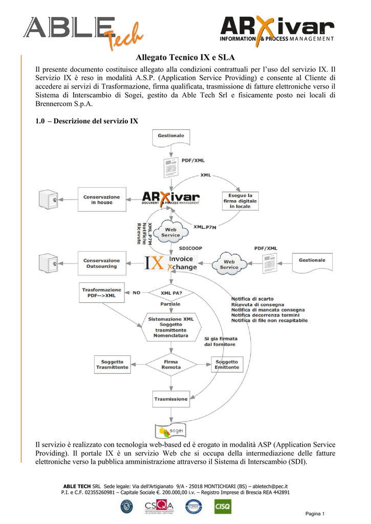 Allegato Tecnico IX e SLA Il presente documento costituisce allegato alla condizioni contrattuali per l’uso del servizio IX. Il Servizio IX è reso in modalità A.S.P. (Application Service Providing) e consente al Cliente di accedere ai servizi di Trasformazione, firma qualificata, trasmissione di fatture elettroniche verso il Sistema di Interscambio di Sogei, gestito da Able Tech Srl e fisicamente posto nei locali di Brennercom S.p.A. 1.0 – Descrizione del servizio IX Il servizio è realizzato con tecnologia web-based ed è erogato in modalità ASP (Application Service Providing). Il portale IX è un servizio Web che si occupa della intermediazione delle fatture elettroniche verso la pubblica amministrazione attraverso il Sistema di Interscambio (SDI). ABLE TECH SRL Sede legale: Via dell’Artigianato 9/A - 25018 MONTICHIARI (BS) – [email protected] P.I. e C.F. 02355260981 – Capitale Sociale €. 200.000,00 i.v. – Registro Imprese di Brescia REA 442891 Pagina 1 2.0 Caricamento dei file sul portale IX Il processo prevede l’acquisizione del documento fattura da diverse fonti, le quali caricheranno la fattura mediante una chiamata ad un servizio Web di IX. Le modalità di caricamento dei files (fatture) sul portale sono: - dal software di gestione documentale ARXivar; - dal software Gestionale che integra i web services di IX; - per mezzo di un Plugin client che monitorizza una cartella e carica in IX qualunque files depositato in tale cartella; - una modalità di caricamento delle fatture direttamente dal portale mediante una selezione manuale; La chiamata al Web Service per il caricamento del file verso IX, restituisce, indipendentemente dal sw utilizzato, il Riferimento Univoco assegnato dal Servizio IX al documento e l’HASH calcolato mediante algoritmo SHA256, del medesimo. Tale informazione rimane persistente anche sul Portale IX per qualunque attività di controllo. La procedura di caricamento dei files verso IX prevede la possibilità di inviare la fattura ed eventuali allegati (in qualunque formato). La dimensione massima accettata tra fattura e allegati deve essere inferiore ai 5 Mbyte. 3.0 Formati di files La FatturaPA è una fattura elettronica ai sensi dell'articolo 21, comma 1, del DPR 633/72 ed è la sola tipologia di fattura accettata dalle Amministrazioni che, secondo le disposizioni di legge, sono tenute ad avvalersi del Sistema di Interscambio. I formati dei files previsti dal sistema sono i seguenti: 1. XML nel formato FatturaPA firmata digitalmente dal soggetto emittente 2. XML nel formato FatturaPA ma non firmata digitalmente; 3. oppure in altri formati (es: PDF/XML/ASCII/EDI/UBL) per i quali si dovrà procedere alla trasformazione del file nel formato XML conforme FatturaPA. Nel caso (1) il software che produce l’XML ha l’onere di richiedere al Servizio IX le informazioni inerenti il soggetto Trasmittente (Able Tech Srl, p.iva 02355260981) e la Nomenclatura univoca da assegnare al file. Una volta completato il file XML con i dati ricevuti dal servizio IX, procederà alla firma digitale del documento e ad inviarlo al servizio IX per la trasmissione al SDI. In questo caso il Servizio IX si occuperà unicamente della trasmissione del documento e di ricevere e gestire i messaggi di SDI. Nel caso (2) il file è nel formato FatturaPA ma non firmato digitalmente dal soggetto emittente. In questo caso il servizio IX verifica il formato del file XML e in caso di esito positivo provvede autonomamente a completarlo con le informazioni del soggetto Trasmittente (Able Tech srl, p.iva 02355260981) e assegna la Nomenclatura univoca del file. A discrezione del cliente, il file così definito può essere firmato dal cliente mediante servizio di firma remota direttamente dal portale IX ed inviato a SDI. In alternativa il file può essere firmato da Able Tech srl, che diventa in tale circostanza Soggetto Emittente della fattura “per conto del fornitore”. Nel caso (3) il cliente ha sottoscritto un servizio opzionale di trasformazione del file che perviene al Servizio IX in un formato diverso dalla FatturaPA. In questo caso il file inviato dal cliente viene sottoposto ad un processo di conversione nel formato FatturaPA. Il file così ottenuto viene sottoposto a procedimento come nel caso (2). Il canale di comunicazione per la trasmissione al SDI da parte del servizio IX è il sistema SDICOOP (WebService) su protocollo HTTPS. ABLE TECH SRL Sede legale: Via dell’Artigianato 9/A - 25018 MONTICHIARI (BS) – [email protected] P.I. e C.F. 02355260981 – Capitale Sociale €. 200.000,00 i.v. – Registro Imprese di Brescia REA 442891 Pagina 2 4.0 Messaggi ricevuti dal SDI A fronte della spedizione a SDI della FatturaPA, il servizio IX riceverà dal medesimo SDI le ricevute o notifiche per mezzo di WebService esposti appositamente per le comunicazioni da SDI per il quale il servizio IX è stato accreditato. I messaggi ricevuti da SDI vengono allegati alla fatturePA trasmessa e resi disponibili per il download attraverso specifiche chiamate Web Service. E’ disponibile un Portale Web per la consultazione delle fatture elettroniche e dei relativi messaggi ricevuti da SDI per la consultazione ed esibizione. Dal SDI possono pervenire delle Notifiche di scarto che contengono il codice IPA da usare per la FatturaPA scartata, la quale è stata inoltrata con un codice IPA generico “999999” oppure usando il codice Ufficio. Solo nei casi in cui il Servizio IX è soggetto Emittente “per conto del fornitore” e trasmittente si occuperà di modificare il contenuto della fattura con il corretto codice IPA, di firmarla digitalmente con il certificato di Able Tech srl e di ritrasmetterla al SDI. 5.0 Definizione delle credenziali di accesso Per ogni soggetto anagrafico (P.iva) viene rilasciata una Username e password di accesso al portale. Tali credenziali saranno usate anche per l’autenticazione dei Web Service che saranno usati per il caricamento dei documenti. 6.0 Servizio O