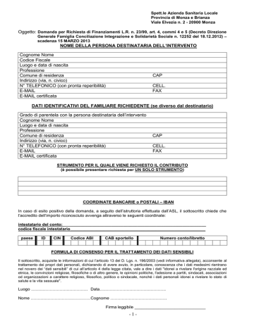 Spett.le Azienda Sanitaria Locale Provincia di Monza e Brianza Viale Elvezia n. 2 - 20900 Monza Oggetto: Domanda per Richiesta di Finanziamenti L.R. n. 23/99, art. 4, commi 4 e 5 (Decreto Direzione Generale Famiglia Conciliazione Integrazione e Solidarietà Sociale n. 12252 del 18.12.2012) – scadenza 15 MARZO 2013 NOME DELLA PERSONA DESTINATARIA DELL’INTERVENTO Cognome Nome Codice Fiscale Luogo e data di nascita Professione Comune di residenza Indirizzo (via, n. civico) N° TELEFONICO (con pronta reperibilità) E-MAIL E-MAIL certificata CAP CELL. FAX DATI IDENTIFICATIVI DEL FAMILIARE RICHIEDENTE (se diverso dal destinatario) Grado di parentela con la persona destinataria dell’intervento Cognome Nome Luogo e data di nascita Professione Comune di residenza Indirizzo (via, n. civico) N° TELEFONICO (con pronta reperibilità) E-MAIL E-MAIL certificata CAP CELL. FAX STRUMENTO PER IL QUALE VIENE RICHIESTO IL CONTRIBUTO (è possibile presentare richiesta per UN SOLO STRUMENTO) COORDINATE BANCARIE o POSTALI – IBAN In caso di esito positivo della domanda, a seguito dell’istruttoria effettuata dall’ASL, il sottoscritto chiede che l’accredito dell’importo riconosciuto avvenga attraverso le seguenti coordinate: intestatario del conto: ____________________________________________________________ codice fiscale intestatario_________________________________________________________ paese ID CIN Codice ABI CAB sportello Numero conto/libretto FORMULA DI CONSENSO PER IL TRATTAMENTO DEI DATI SENSIBILI Il sottoscritto, acquisite le informazioni di cui l’articolo 13 del D. Lgs. n. 196/2003 (vedi informativa allegata), acconsente al trattamento dei propri dati personali, dichiarando di avere avuto, in particolare, conoscenza che i dati medesimi rientrano nel novero dei “dati sensibili” di cui all’articolo 4 della legge citata, vale a dire i dati "idonei a rivelare l'origine razziale ed etnica, le convinzioni religiose, filosofiche o di altro genere, le opinioni politiche, l'adesione a partiti, sindacati, associazioni od organizzazioni a carattere religioso, filosofico, politico o sindacale, nonché i dati personali idonei a rivelare lo stato di salute e la vita sessuale". Luogo …………………………………. Data……………………….………………. Nome …………………………………… Cognome …………………………………. Firma leggibile ______________________________ -1- AUTOCERTIFICAZIONE / DICHIARAZIONE Il sottoscritto _________________________________ sotto la propria responsabilità - dichiara di non aver effettuato altre richieste di finanziamento pubblico o di messa a disposizione gratuita dell’ausilio oggetto della presente istanza; dichiara di accettare la quota di compartecipazione al costo come previsto dall’art. 4 – commi 4 e 5 della L.R. 23/99; autocertifica di non aver ricevuto negli ultimi 3 anni finanziamenti ai sensi dell’art. 4 – commi 4 e 5 della L.R. 23/99 (valido solo per l’acquisto di strumenti non legati all’area della domotica); dichiara la presenza dei seguenti ausili nonché del relativo supporto assistenziale già in dotazione alla persona disabile e/o alla sua famiglia: .……………………………………… …………………………………………………………………………………………………………………….…… …………………………………………..……………………………………………………… Consapevole che la non veridicità del contenuto delle suddette autocertificazioni/dichiarazioni comporta la decadenza dei benefici ottenuti in base alla dichiarazione non veritiera ai sensi dell’art. 75 del DPR 445/2000. Il dichiarante è consapevole che il rilascio di dichiarazioni mendaci è punito ai sensi del Codice Penale e delle leggi speciali in materia (art. 76 del DPR 445/2000). data________________ Firma____________________________________ RIEPILOGO DOCUMENTI DA PRESENTARE Il sottoscritto, sotto la propria responsabilità, dichiara di consegnare la seguente documentazione: 1) la prescrizione del medico specialista (pubblico o privato) che motivi la necessità e la conformità dello strumento/ausilio richiesto con il progetto sociale ed educativo individualizzato; 2) il progetto sociale ed educativo individualizzato; 3) fotocopia carta d'identità del firmatario del modulo; 4) dichiarazione sostitutiva di certificazione di invalidità o, a discrezione dell’utente, sua eventuale copia, oppure dichiarazione sostitutiva della certificazione di alunno disabile o, a discrezione dell’utente, sua eventuale copia, oppure certificazione dello specialista per patologie che causano disabilità e non siano necessariamente da accertare attraverso il verbale di invalidità o la certificazione di alunno disabile; dichiarazione sostitutiva di certificazione di legge 104/92 (se in possesso) o, a discrezione dell’utente, sua eventuale fotocopia; 5) fotocopia del preventivo o fotocopia della fattura/ricevuta fiscale/scontrino fiscale dettagliato rilasciato/a dalle aziende liberamente scelte, comprensivi delle specifiche tecniche e dei relativi costi degli strumenti (la fattura/ricevuta fiscale/scontrini non deve essere datata antecedentemente i 12 mesi dalla data di presentazione della domanda, eccetto i casi in cui la richiesta già presentata l’anno precedente non sia stata accolta per esaurimento fondi); in caso di ausili o strumenti acquistati tramite rateizzazione, qualora non fosse disponibile la fattura è possibile presentare anche copia del contratto di finanziamento rilasciato dalla ditta fornitrice o dalla finanziaria; si raccomanda di controllare che nella documentazione contabile sia esplicitato l’ammontare dell’IVA; 6) per gli ausili riconducibili al nomenclatore tariffario è indispensabile allegare copia del modello 03 autorizzato entro il 15.03.2013 dall’Ufficio Protesi del Distretto di residenza se cartaceo, o copia d