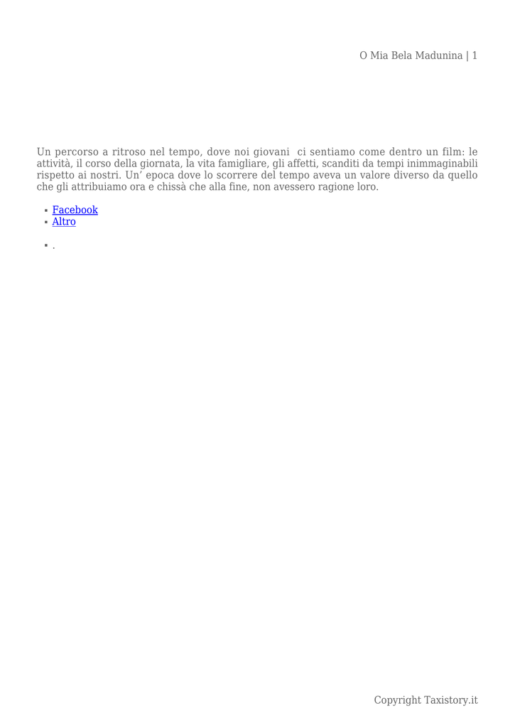 O Mia Bela Madunina | 1 Un percorso a ritroso nel tempo, dove noi giovani ci sentiamo come dentro un film: le attività, il corso della giornata, la vita famigliare, gli affetti, scanditi da tempi inimmaginabili rispetto ai nostri. Un’ epoca dove lo scorrere del tempo aveva un valore diverso da quello che gli attribuiamo ora e chissà che alla fine, non avessero ragione loro. Facebook Altro . Copyright Taxistory.it