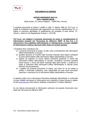 DOCUMENTO DI SINTESI AZIONI ORDINARIE AXA S.A. ISIN: FR0000120628 (Sede sociale: 25, avenue Matignon - 75008 Paris, Francia) Il presente documento di sintesi è redatto in data 11 ottobre 2006 da TLX S.p.A. in qualità di richiedente l’ammissione alla negoziazione sul mercato regolamentato TLX, in regime di esenzione dall’obbligo di pubblicazione del prospetto ai sensi dell’art. 57, comma 1, lettera h) del Regolamento Consob n. 11971/99. TLX S.p.A. nel redigere il presente documento ha preso in considerazione le informazioni presenti nel “Document de référence 2005” di Axa S.A. e le informazioni rese pubbliche dall’emittente in ottemperanza ai propri obblighi di informazione continua derivanti dallo status di società quotata. L’investitore deve considerare che: a) il presente documento di sintesi va letto come un'introduzione alle informazioni diffuse dall’emittente al mercato; b) qualsiasi decisione di investire negli strumenti finanziari deve basarsi sull'esame da parte dell'investitore delle informazioni diffuse dall’emittente al mercato; c) qualora sia proposto un ricorso dinanzi all'autorità giudiziaria in merito alle informazioni diffuse dall’emittente al mercato, l'investitore ricorrente potrebbe essere tenuto, a norma del diritto nazionale degli Stati membri, a sostenere le spese di traduzione delle informazioni diffuse dall’emittente al mercato prima dell'inizio del procedimento; d) i redattori del presente documento di sintesi, così come chi ne ha chiesto la notifica e l’eventuale traduzione, sono responsabili ove essa risulti fuorviante, imprecisa o incoerente con le informazioni diffuse dall’emittente al mercato. Si specifica inoltre che le informazioni finanziarie pubblicate dall’emittente in conformità ai propri obblighi permanenti di informazione sono reperibili in lingua francese e inglese sul sito www.axa.com nella sezione “Relations investisseurs”/“Investor Relations”. Se non indicato diversamente le informazioni contenute nel presente Documento sono tratte dal “Document de référence 2005”. TLX – Documento di sintesi azione Axa 1 A) Ultimi documenti pubblicati dall’Emittente utilizzati per la redazione del presente Documento Documento Document de référence 2005 (Documento di Registrazione 2005) Form 20-F (Bilancio d’esercizio 2005 pubblicato negli USA) Half Year 2006 Activity Report (Relazione semestrale 1° semestre 2006) Data 13.04.2006 29.06.2006 03.08.2006 B) Informazioni sulla società Axa S.A., di diritto francese, è capo dell’omonimo Gruppo che opera nel campo assicurativo e dell’asset management in Europa Occidentale, in Nord America, nella regione Asia-Pacifico, in Medio Oriente e in Africa. Axa trae origine dall’associazione di alcune Mutue regionali di assicurazione, le Mutuelles Unies che nel 1982 assumono il controllo del gruppo Drouot prendendo la denominazione di Axa. Dal 1986 al 2002 Axa, attraverso acquisizioni, fusioni e dismissioni rafforza la sua posizione in Europa e diventa un gruppo di dimensioni internazionali. Nel 2004, Axa acquisisce il gruppo americano MONY (società operante nel campo dei servizi finanziari e assicurativi). Nel dicembre 2005, Axa semplifica la sua struttura di Gruppo tramite l’acquisizione di FINAXA. Nel giugno 2006 acquisisce Winterthur da Credit Suisse (Fonte: Activity Report HY 2006). L’attività di Axa è organizzata in cinque segmenti: • Vita; • Danni; • Assicurazione Internazionale (inclusa l’attività di riassicurazione); • Asset Management; • Altri Servizi Finanziari (incluse banche). TLX – Documento di sintesi azione Axa 2 C) Informazioni chiave Capitale sociale Capitale sociale al 31.12.2005: 5.053.311.984,24 euro composto da 2.206.686.456 azioni del valore nominale di 2,29 euro ciascuna. Informazioni finanziarie selezionate Patrimonio netto di competenza del Gruppo (in milioni di euro) Dividend per share (in euro) EPS (earnings per share, in euro) Adjusted ROE (return on equity) 2005 2004 33.847 28.523 0,88 2,22 18,4% 0,61 2,07 18,1% Si veda il paragrafo G) Informazioni finanziarie. Mercati di quotazione Il mercato di prima quotazione per le azioni di Axa è Euronext Paris. La capitalizzazione di mercato al 31.12.2005 è pari a 51 miliardi di euro. Indici che includono le azioni Axa CAC-40, Dow Jones EURO STOXX 50, Dow Jones EURO STOXX Insurance, Euronext 100 (fonte: Form 20-F). Politica dei dividendi Dati storici in euro: 2005 0,88 Dividendo per azione 2004 0,61 2003 0,38 2002 0,34 2001 0,56 Rating di Axa S.A. (aggiornato al 11.10.2006 – Fonte: Agenzie di rating ) Moody’s S&P Fitch Long term A2 A AA- Short Term P-1 A-1 F1 Outlook Stable Stable Stable Scala dei valori Long Term: Il valore del rating assegnato dalle agenzie Moody’s, S&P e Fitch esprime un giudizio in merito alla probabilità che l’emittente diventi insolvente e non sia quindi in grado di onorare gli impegni di pagamento. TLX – Documento di sintesi azione Axa 3 Fattori di Rischio comportanti effetti negativi sulla situazione economicopatrimoniale e finanziaria di Axa S.A. Fattori di rischio generici e specifici del titolo azionario In generale l’investimento in un titolo azionario espone l’investitore ai seguenti due rischi: rischio generico (o sistematico) e rischio specifico Il rischio generico rappresenta quella parte di variabilità del prezzo di ciascun titolo che dipende dalle fluttuazioni del mercato e non può essere eliminato per il tramite della diversificazione. Il rischio sistematico per i titoli di capitale racchiude tra l’altro fattori quali la politica economica di un governo, l’inflazione, la svalutazione, la variazione dei tassi d’interesse e le condizioni socio-politiche in generale; Il rischio specifico dipende dalle caratteristiche peculiari dell'emittente: è fondamentale apprezzare la solidità patrimoniale delle società emittenti e le prospettive economiche delle medesime tenuto conto delle caratteristiche dei settori in cui le