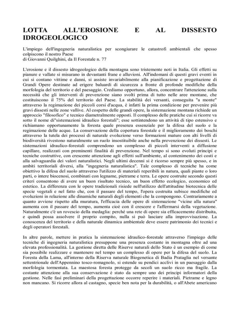 LOTTA ALL'EROSIONE IDROGEOLOGICO E AL DISSESTO L'impiego dell'ingegneria naturalistica per scongiurare le catastrofi ambientali che spesso colpiscono il nostro Paese di Giovanni Quilghini, da Il Forestale n. 77 L'erosione e il dissesto idrogeologico della montagna sono tristemente noti in Italia. Gli effetti su pianure e vallate si misurano in devastanti frane e alluvioni. All'indomani di questi gravi eventi in cui si contano vittime e danni, si assiste invariabilmente alla pianificazione e progettazione di Grandi Opere destinate ad erigere baluardi di sicurezza a fronte di profonde modifiche della morfologia del territorio e del paesaggio. Crediamo opportuno, allora, concentrare l'attenzione sulla necessità che gli interventi di prevenzione siano svolti prima di tutto nelle aree montane, che costituiscono il 75% del territorio del Paese. La stabilità dei versanti, conseguita "a monte" attraverso la regimazione dei piccoli corsi d'acqua, è infatti la prima condizione per prevenire più gravi dissesti nelle zone vallive. Al cospetto delle grandi opere, la sistemazione montana richiede un approccio "filosofico" e tecnico diametralmente opposti. Il complesso delle pratiche cui si ricorre va sotto il nome di"sistemazioni idraulico forestali"; esse sottintendono un attività di tipo estensivo e richiamano opportunamente la foresta quale presenza essenziale per la difesa del suolo e la regimazione delle acque. La conservazione della copertura forestale e il miglioramento dei boschi attraverso la tutela dei processi di naturale evoluzione verso formazioni mature con alti livelli di biodiversità rivestono naturalmente un ruolo insostituibile anche nella prevenzione dei dissesti. Le sistemazioni idraulico-forestali comprendono un complesso di piccoli interventi a diffusione capillare, realizzati con preminenti finalità di prevenzione. Nel tempo si sono evoluti principi e tecniche costruttive, con crescente attenzione agli effetti sull'ambiente, al contenimento dei costi e alla salvaguardia dei valori naturalistici. Negli ultimi decenni si è ricorso sempre più spesso, e in ambiti territoriali diversi, alla "ingegneria naturalistica". Tale complesso di tecniche ha come obiettivo la difesa del suolo attraverso l'utilizzo di materiali reperibili in natura, quali piante o loro parti, o intere biocenosi, combinati con legname, pietrame e terra. Le opere costruite secondo questi criteri consentono di avere un buon risultato tecnico, un buon effetto ecologico, economico ed estetico. La differenza con le opere tradizionali risiede nell'utilizzo dell'attitudine biotecnica delle specie vegetali e nel fatto che, con il passare del tempo, l'opera costruita subisce modifiche ed evoluzioni in relazione alle dinamiche naturali degli elementi che la compongono. Contrariamente a quanto avviene rispetto alla muratura, l'efficacia delle opere di sistemazione "vicine alla natura" aumenta con il passare del tempo, aumenta cioè con il crescere e l'affermarsi della vegetazione. Naturalmente c'è un rovescio della medaglia: perché una rete di opere sia efficacemente distribuita, e quindi possa assolvere il proprio compito, nulla si può lasciare alla improvvisazione. La conoscenza del territorio e della naturale dinamica ambientale deve essere patrimonio dei tecnici e degli operatori forestali. In altre parole, mettere in pratica la sistemazione idraulico-forestale attraverso l'impiego delle tecniche di ingegneria naturalistica presuppone una presenza costante in montagna oltre ad una elevata professionalità. La gestione diretta delle Riserve naturali dello Stato è un esempio di come sia possibile realizzare e mantenere nel tempo un complesso di opere per la difesa del suolo. La Foresta della Lama, all'interno della Riserva naturale Biogenetica di Badia Prataglia nel versante settentrionale dell'Appennino tosco-romagnolo, si estende su pendici acclivi in un paesaggio dalla morfologia tormentata. La maestosa foresta protegge da secoli un suolo ricco ma fragile. La costante attenzione alla sua conservazione è stato da sempre uno dei principi informatori della gestione. Nelle fasi preliminari della progettazione occorre reperire i materiali. Pietrame e legno non mancano. Si ricorre allora al castagno, specie ben nota per la durabilità, o all'Abete americano (douglasia) presente nella foresta in diffusi piccoli rimboschimenti. Talee di salice bianco sono pronte all'uso per il completamento dei manufatti e per le piccole opere di regimazione superficiale. Il campo di applicazione spazia dal consolidamento di pendici alla regimazione dei corsi d'acqua, al ripristino della vegetazione in piccole aree in erosione. Vi sono inoltre numerose occasioni di realizzazione di vere opere di sostegno della viabilità forestale quale valida alternativa alla muratura con l'uso di cemento. Opere di sostegno di sottoscarpa o controripa Il consolidamento di pendici si ottiene costruendo una palificata, assimilabile ad un "contenitore" costituito da tronchi e riempito, durante la costruzione, di terra e pietrame. Tra i tronchi e la terra, verso l'interno, sarà disposto uno strato di pietrame che conferisce peso alla struttura (l'opera è classificabile tra quelle cosiddette "a gravità") e contribuisce a limitarne lo svuotamento in seguito al ruscellamento delle acque meteoriche, particolarmente insidioso nei primi tempi quando è ancora nulla o scarsa la copertura vegetale. Nel corpo della palificata, tra i giunti delle pietre, si mettono a dimora talee (porzioni di rami prelevate, durante il riposo vegetativo, su piante vive nelle vicinanze del lavoro) di specie autoctone, originarie della zona, che abbiano, come caratteristica ecologica, la capacità di emettere radici e nuovi getti verdi. Nel tempo, la coltre vegetale ricopre e rende sempre più stabile l'opera, attraverso la fitta trama delle radici. La copertura verde contribuisce efficacemente alla eduzione delle acque dal corpo della struttura. Ad intervento ultimato segue
