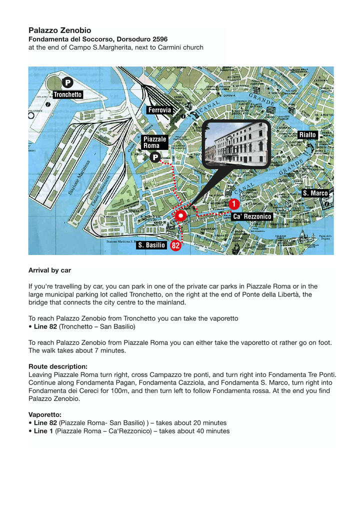 Palazzo Zenobio Fondamenta del Soccorso, Dorsoduro 2596 at the end of Campo S.Margherita, next to Carmini church P Tronchetto Ferrovia Rialto Piazzale Roma P S. Marco 1 • S. Basilio Ca’ Rezzonico 82 Arrival by car If you're travelling by car, you can park in one of the private car parks in Piazzale Roma or in the large municipal parking lot called Tronchetto, on the right at the end of Ponte della Libertà, the bridge that connects the city centre to the mainland. To reach Palazzo Zenobio from Tronchetto you can take the vaporetto • Line 82 (Tronchetto – San Basilio) To reach Palazzo Zenobio from Piazzale Roma you can either take the vaporetto ot rather go on foot. The walk takes about 7 minutes. Route description: Leaving Piazzale Roma turn right, cross Campazzo tre ponti, and turn right into Fondamenta Tre Ponti. Continue along Fondamenta Pagan, Fondamenta Cazziola, and Fondamenta S. Marco, turn right into Fondamenta dei Cereci for 100m, and then turn left to follow Fondamenta rossa. At the end you find Palazzo Zenobio. Vaporetto: • Line 82 (Piazzale Roma- San Basilio) ) – takes about 20 minutes • Line 1 (Piazzale Roma – Ca‘Rezzonico) – takes about 40 minutes