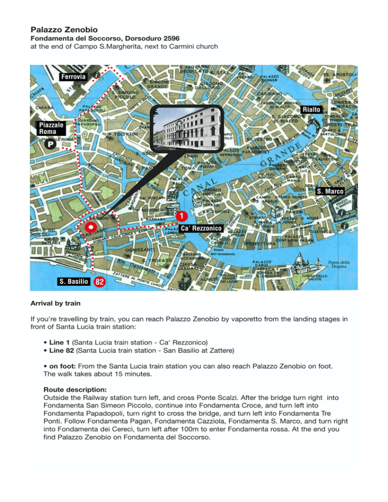 Palazzo Zenobio Fondamenta del Soccorso, Dorsoduro 2596 at the end of Campo S.Margherita, next to Carmini church Ferrovia Piazzale Roma Rialto Railway Station PPiazzale Roma S. Marco 1 • Ca’ Rezzonico S. Basilio 82 S. Basilio Arrival by train If you're travelling by train, you can reach Palazzo Zenobio by vaporetto from the landing stages in front of Santa Lucia train station: • Line 1 (Santa Lucia train station - Ca‘ Rezzonico) • Line 82 (Santa Lucia train station - San Basilio at Zattere) • on foot: From the Santa Lucia train station you can also reach Palazzo Zenobio on foot. The walk takes about 15 minutes. Route description: Outside the Railway station turn left, and cross Ponte Scalzi. After the bridge turn right into Fondamenta San Simeon Piccolo, continue into Fondamenta Croce, and turn left into Fondamenta Papadopoli, turn right to cross the bridge, and turn left into Fondamenta Tre Ponti. Follow Fondamenta Pagan, Fondamenta Cazziola, Fondamenta S. Marco, and turn right into Fondamenta dei Cereci, turn left after 100m to enter Fondamenta rossa. At the end you find Palazzo Zenobio on Fondamenta del Soccorso.