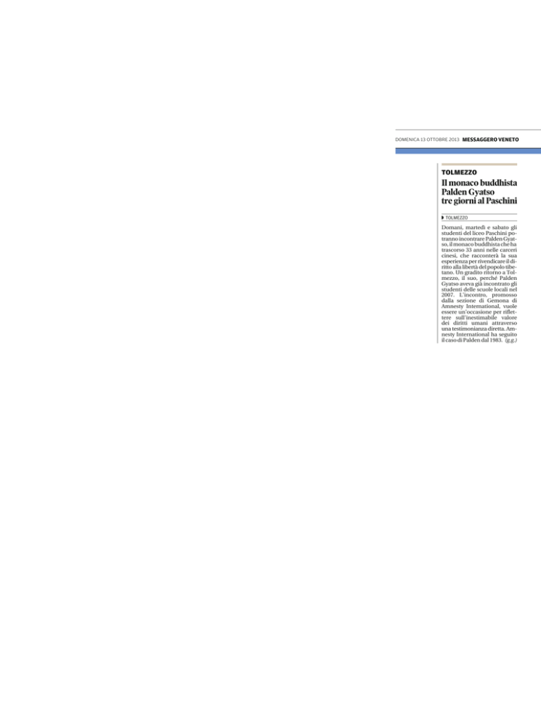 DOMENICA 13 OTTOBRE 2013 MESSAGGERO VENETO tolmezzo Il monaco buddhista Palden Gyatso tre giorni al Paschini ◗ TOLMEZZO Domani, martedì e sabato gli studenti del liceo Paschini potranno incontrare Palden Gyatso, il monaco buddhista che ha trascorso 33 anni nelle carceri cinesi, che racconterà la sua esperienza per rivendicare il diritto alla libertà del popolo tibetano. Un gradito ritorno a Tolmezzo, il suo, perché Palden Gyatso aveva già incontrato gli studenti delle scuole locali nel 2007. L’incontro, promosso dalla sezione di Gemona di Amnesty International, vuole essere un’occasione per riflettere sull’inestimabile valore dei diritti umani attraverso una testimonianza diretta. Amnesty International ha seguito il caso di Palden dal 1983. (g.g.)