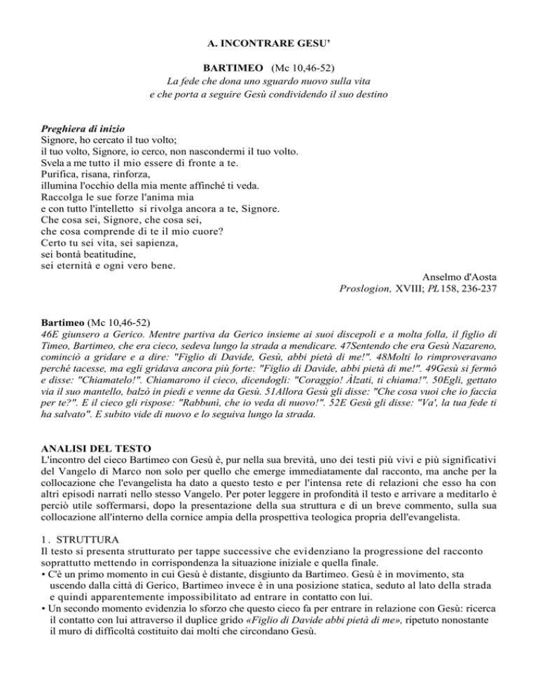 A. INCONTRARE GESU’ BARTIMEO (Mc 10,46-52) La fede che dona uno sguardo nuovo sulla vita e che porta a seguire Gesù condividendo il suo destino Preghiera di inizio Signore, ho cercato il tuo volto; il tuo volto, Signore, io cerco, non nascondermi il tuo volto. Svela a me tutto il mio essere di fronte a te. Purifica, risana, rinforza, illumina l'occhio della mia mente affinché ti veda. Raccolga le sue forze l'anima mia e con tutto l'intelletto si rivolga ancora a te, Signore. Che cosa sei, Signore, che cosa sei, che cosa comprende di te il mio cuore? Certo tu sei vita, sei sapienza, sei bontà beatitudine, sei eternità e ogni vero bene. Anselmo d'Aosta Proslogion, XVIII; PL 158, 236-237 Bartimeo (Mc 10,46-52) 46E giunsero a Gerico. Mentre partiva da Gerico insieme ai suoi discepoli e a molta folla, il figlio di Timeo, Bartimeo, che era cieco, sedeva lungo la strada a mendicare. 47Sentendo che era Gesù Nazareno, cominciò a gridare e a dire: "Figlio di Davide, Gesù, abbi pietà di me!". 48Molti lo rimproveravano perché tacesse, ma egli gridava ancora più forte: "Figlio di Davide, abbi pietà di me!". 49Gesù si fermò e disse: "Chiamatelo!". Chiamarono il cieco, dicendogli: "Coraggio! Àlzati, ti chiama!". 50Egli, gettato via il suo mantello, balzò in piedi e venne da Gesù. 51Allora Gesù gli disse: "Che cosa vuoi che io faccia per te?". E il cieco gli rispose: "Rabbunì, che io veda di nuovo!". 52E Gesù gli disse: "Va', la tua fede ti ha salvato". E subito vide di nuovo e lo seguiva lungo la strada. ANALISI DEL TESTO L'incontro del cieco Bartimeo con Gesù è, pur nella sua brevità, uno dei testi più vivi e più significativi del Vangelo di Marco non solo per quello che emerge immediatamente dal racconto, ma anche per la collocazione che l'evangelista ha dato a questo testo e per l'intensa rete di relazioni che esso ha con altri episodi narrati nello stesso Vangelo. Per poter leggere in profondità il testo e arrivare a meditarlo è perciò utile soffermarsi, dopo la presentazione della sua struttura e di un breve commento, sulla sua collocazione all'interno della cornice ampia della prospettiva teologica propria dell'evangelista. 1 . STRUTTURA Il testo si presenta strutturato per tappe successive che evidenziano la progressione del racconto soprattutto mettendo in corrispondenza la situazione iniziale e quella finale. • C'è un primo momento in cui Gesù è distante, disgiunto da Bartimeo. Gesù è in movimento, sta uscendo dalla città di Gerico, Bartimeo invece è in una posizione statica, seduto al lato della strada e quindi apparentemente impossibilitato ad entrare in contatto con lui. • Un secondo momento evidenzia lo sforzo che questo cieco fa per entrare in relazione con Gesù: ricerca il contatto con lui attraverso il duplice grido «Figlio di Davide abbi pietà di me», ripetuto nonostante il muro di difficoltà costituito dai molti che circondano Gesù. • Un terzo momento vede l'attuazione dell'incontro tra il cieco e Gesù. La sosta di Gesù e il suo appello permettono al cieco di venire a lui. • Un quarto momento sviluppa questo contatto tra Gesù e il cieco in un dialogo personale e significativo dove si evidenzia una domanda di Gesù, la risposta del cieco e la parola definitiva di Gesù che illumina retrospettivamente tutto il racconto «Va' la tua fede ti ha salvato». Una volta risolto positivamente il dialogo di relazione tra il cieco e Gesù c'è un permanente congiungimento tra questi due personaggi: il cieco ora segue Gesù sulla sua strada. Dalla struttura si coglie come l'aspetto più significativo che segnala il punto di partenza e il punto di arrivo dell'incontro tra Bartimeo e Gesù sono le espressioni con cui il cieco è descritto all'inizio e alla fine del racconto: all'inizio Bartimeo è cieco, sedeva (posizione statica), al lato della strada (fuori dell'itinerario di Gesù); alla fine vede, segue, sulla strada (è nel cammino insieme con Gesù). Il capovolgimento di queste tre situazioni iniziali delinea molto bene il percorso fatto da Bartimeo: dalla cecità alla vista, dall'immobilità al cammino, dall'esclusione alla partecipazione al destino stesso di Gesù, alla sua strada. Il percorso viene definito da Gesù come cammino di fede: «la tua fede ti ha salvato». La fede ha ridonato al cieco la vista, ha risolto il suo stato di immobilità in un movimento permanente, lo ha strappato dalla situazione di esclusione e di emarginazione e lo ha coinvolto nel cammino di Gesù. Marco, nel delineare la storia di questo incontro, intende offrire alla sua comunità cristiana un paradigma di fede. 2. TESTO STRUTTURATO 1. Situazione iniziale di disgiunzione E vengono a Gerico. E mentre egli usciva da Gerico assieme ai suoi discepoli e a molta folla, il figlio di Timeo, Bartimeo, cieco, sedeva a lato della strada mendicando 2. Ricerca del contatto personale E avendo udito che è Gesù Nazareno, cominciò a gridare e a dire: Figlio di Davide Gesù, abbi pietà di me E lo sgridavano molti perché tacesse quegli però ancor più gridava Figlio di Davide, abbi pietà di me. 3. Attuazione dell'incontro E fermatosi Gesù disse: chiamatelo! E chiamano il cieco dicendogli: Confida, svegliati, chiama te, E quegli, gettato il suo mantello, balzato su, venne da Gesù 4. Contatto personale nel dialogo E rispondendogli Gesù disse: che cosa vuoi che ti faccia? E il cieco gli disse: Rabbunì, che io riabbia la vista! E Gesù gli disse: va', LA TUA FEDE TI HA SALVATO. 5. Congiunzione finale • subito vide e lo seguiva sulla strada. 3 . SPIEGAZIONE «E vengono a Gerico. E mentre egli usciva da Gerico» Gesù arriva a Gerico ed esce da Gerico. Marco lo fa entrare e uscire quasi senza soluzione di continuità. La segnalazione della località «Gerico» è forse il ricordo dell'incontro reale che è avvenuto là tra Gesù e Bartimeo; nello stesso tempo segnala che Gesù nel suo camminare è ormai giunto vicino a Gerusalemme: il cammino di Gesù quindi sta arrivand