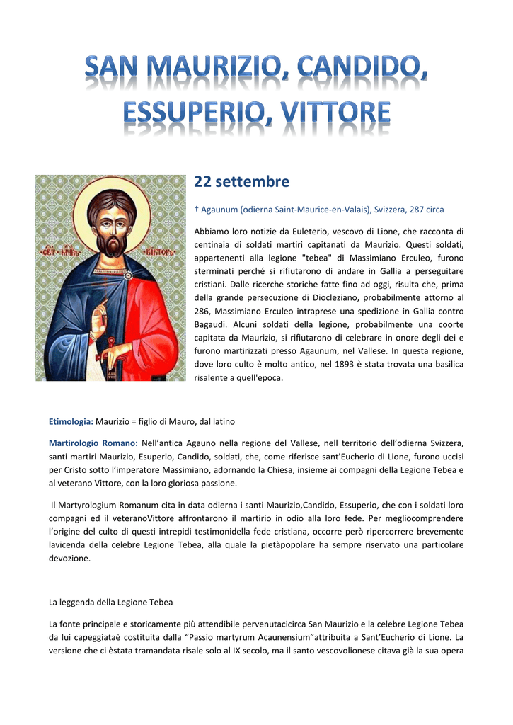 22 settembre † Agaunum (odierna Saint-Maurice-en-Valais), Svizzera, 287 circa Abbiamo loro notizie da Euleterio, vescovo di Lione, che racconta di centinaia di soldati martiri capitanati da Maurizio. Questi soldati, appartenenti alla legione "tebea" di Massimiano Erculeo, furono sterminati perché si rifiutarono di andare in Gallia a perseguitare cristiani. Dalle ricerche storiche fatte fino ad oggi, risulta che, prima della grande persecuzione di Diocleziano, probabilmente attorno al 286, Massimiano Erculeo intraprese una spedizione in Gallia contro Bagaudi. Alcuni soldati della legione, probabilmente una coorte capitata da Maurizio, si rifiutarono di celebrare in onore degli dei e furono martirizzati presso Agaunum, nel Vallese. In questa regione, dove loro culto è molto antico, nel 1893 è stata trovata una basilica risalente a quell'epoca. Etimologia: Maurizio = figlio di Mauro, dal latino Martirologio Romano: Nell’antica Agauno nella regione del Vallese, nell territorio dell’odierna Svizzera, santi martiri Maurizio, Esuperio, Candido, soldati, che, come riferisce sant’Eucherio di Lione, furono uccisi per Cristo sotto l’imperatore Massimiano, adornando la Chiesa, insieme ai compagni della Legione Tebea e al veterano Vittore, con la loro gloriosa passione. Il Martyrologium Romanum cita in data odierna i santi Maurizio,Candido, Essuperio, che con i soldati loro compagni ed il veteranoVittore affrontarono il martirio in odio alla loro fede. Per megliocomprendere l’origine del culto di questi intrepidi testimonidella fede cristiana, occorre però ripercorrere brevemente lavicenda della celebre Legione Tebea, alla quale la pietàpopolare ha sempre riservato una particolare devozione. La leggenda della Legione Tebea La fonte principale e storicamente più attendibile pervenutacicirca San Maurizio e la celebre Legione Tebea da lui capeggiataè costituita dalla “Passio martyrum Acaunensium”attribuita a Sant’Eucherio di Lione. La versione che ci èstata tramandata risale solo al IX secolo, ma il santo vescovolionese citava già la sua opera in una lettera indirizzata alvescovo Salvio verso il 440, affermando che a quel tempo latradizione orale in merito era già attestata da almeno unsecolo. Lo studioso tedesco D. Van Berchem negli anni ’40 del XX secoloesaminò l’antica “passio”, giungendo allaconclusione che la fonte del racconto orale fosse San Teodoro (dettoanche Teodulo) di Octoduro, primo vescovo del cantone svizzero delVallese nel IV secolo. Questi importò assai probabilmente laleggenda dall’Oriente, in base a cui Maurizio fu martirizzatocon i suoi soldati, forse né tebani né costituenti unavera e propria legione. Secondo la narrazione di Eucherio, arricchita di parecchi elementifantasiosi, l’imperatore romano Massimiano guidò unesercito per contrastare una rivolta fomentata da un gruppo di galli,i bagaudi, e giunto nei pressi di Octodurum (odierna cittàsvizzera di Martygny), oltre il passo alpino del Gran San Bernardo,diede ordine ai suoi uomini di compiere un sacrificio in onore deglidei per impetrare da loro il successo della spedizione in corso. Un’unità dell’esercito imperiale era appunto lafamigerata egione Tebea, i cui membri come dice il nome erano statireclutati nell’Egitto settentrinale ed erano di religionecristiana. Questi valorosi seguaci di Cristo, senza eccezioni,rifiutarono fermamente di sacrificare a degli dei pagani in cui noncredevano e si ritirarono dunque nella vicina Agaunum (odiernaSaint-Maurice-en-Valais), guidati dal loro “primicerius” eportavoce Maurizio. L’imperatore li invitò ripetutamenteinvano a tornare sui loro passi ed infine ordinò la lorodecimazione. Ma i soldati, incoraggiati da Maurizio e dagli altriufficiali, furono irremovibili dalla loro decisione sino alla fine.Conclusasi tale violenta persecuzione pare fossero stati uccisi ben6600 (o secondo alcune fonti 6666) soldati. Il Martyrologium Romanum,nella sua ultima edizione, si limita a citare esplicitamente i nomidi Maurizio, Candido, Essuperio e del veterano Vittore,quest’ultimo forse proveniente da un altra legione ma uccisoanch’egli in quanto dichiaratosi cristiano. Maurizio ed i suoi compagni avevano comunque scrittoall’imparatore una lettere onde spiegargli le valide motivazionidella loro ribellione: “Siamo tuoi soldati, ma anche servi diDio, cosa che noi riconosciamo francamente. A te dobbiamo il serviziomilitare, a lui l’integrità e la salute, da te abbiamopercepito il salario, da lui il principio della vita [...].Metteremo le nostre mani contro qualunque nemico, ma non lemacchieremo col sangue degli innocenti [...]. Noi facciamoprofessione di fede in Dio Padre Creatore di tutte le cose e crediamoche suo Figlio Gesù Cristo sia Dio. Siamo stati spruzzati dalsangue dei nostri fratelli e commilitoni, ma non ci affliggemmo,alzammo le nostre lodi perchè erano stati ritenuti degni dipartire per il loro Signore Dio. Ecco deponiamo le armi [...]preferiamo morire innocenti che uccidere e vivere colpevoli[...] non neghiamo di essere cristiani [...]perciò non possiamo perseguitare i cristiani”. Assaiprobabilmente Eucherio inventò le parole con cui imartirizzandi espressero le loro rimostranze, affermando cherifiutarono di uccidere dei cristiani che in realtà non eranonemici dell’autorità imperiale e non menzionando ibagaudi. Inoltre la “passio” più tardiva aggiunse algruppo i nomi di Innocenzo e Vitale, in quanto i loro corpi vennerorinvenuti dopo secoli nella vallata del Rodano. Comunque, anche se inumeri citati paiono esagerati ed alcuni dettagli della leggendafurono aggiunti nel V secolo, sembra effettivamente essersiverificato un effettivo spargimento di sangue cristiano alla basedella tradizione. Il culto ieri e oggi Il culto nei confronti dei martiri risalirebbe dunque al IV secolo,durante il quale il suddetto San Teodulo fece edificare la basilicaancora oggi esistente per ospitarne le reliquie. In occasione dellavisita d
