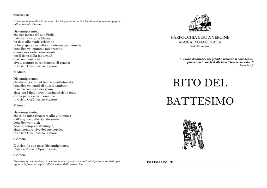BENEDIZIONE Il celebrante benedice le mamme, che tengono in braccio il loro bambino, quindi i papà e tutti i presenti, dicendo: Dio onnipotente, che per mezzo del suo Figlio, nato dalla vergine Maria, ha dato alle madri cristiane la lieta speranza della vita eterna per i loro figli, benedica voi mamme qui presenti; e come ora siete riconoscenti per il dono della maternità, così con i vostri figli vivete sempre in rendimento di grazie: in Cristo Gesù nostro Signore. PARROCCHIA BEATA VERGINE MARIA IMMACOLATA Sesto Fiorentino “...Prima di formarti nel grembo materno ti conoscevo, prima che tu uscissi alla luce ti ho consacrato...” Geremia 1,5 ® Amen. Dio onnipotente, che dona la vita nel tempo e nell’eternità, benedica voi padri di questi bambini; insieme con le vostre spose siate per i figli i primi testimoni della fede, con la parola e con l’esempio: in Cristo Gesù nostro Signore. ® Amen. RITO DEL BATTESIMO Dio onnipotente, che ci ha fatto rinascere alla vita nuova dall’acqua e dallo Spirito santo, benedica voi tutti; perché, sempre e dovunque, siate membra vive del suo popolo, in Cristo Gesù nostro Signore. ® Amen. E vi doni la sua pace Dio onnipotente, Padre e Figlio e Spirito santo. ® Amen. Conclusa la celebrazione, il celebrante con i genitori e i padrini si porta in sacristia per apporre le firme sui registri di Battesimo della parrocchia. Battesimo di _____________________________ RITO DELL’«EFFETA» Il celebrante tocca, con il pollice, le orecchie e le labbra dei singoli battezzati, dicendo: Il Signore Gesù, che fece udire i sordi e parlare i muti, ti conceda di ascoltare presto la sua parola, e di professare la tua fede, a lode a gloria di Dio Padre. ® Amen. Quindi genitori, padrini e battezzati vanno all’altare portando la candela accesa. RITI di CONCLUSIONE Genitori e padrini e battezzato si dispongono attorno alla mensa dell’altare: in mezzo a loro si pone il celebrante. PREGHIERA DEL SIGNORE Il celebrante rivolge ai genitori, ai padrini e ai presenti con queste parole: Fratelli carissimi, questo bambino, rinato nel Battesimo, viene chiamato e realmente è figlio di Dio. Nella Confermazione riceverà la pienezza dello Spirito santo; accostandosi all’altare del Signore parteciperà alla mensa del suo sacrificio, e nell’assemblea dei fratelli potrà rivolgersi a Dio chiamandolo Padre. Ora, in suo nome, nello Spirito di figli di Dio che tutti abbiamo ricevuto, preghiamo insieme, come il Signore ci ha insegnato: E tutti, insieme con il celebrante, dicono: Padre nostro che sei nei cieli… unendovi al suo popolo; egli stesso vi consacra con il crisma della salvezza, perché inseriti in Cristo, sacerdote, re e profeta, siate sempre membra del suo corpo per la vita eterna. INIZIAZIONE CRISTIANA ® Amen. Per mezzo del Battesimo essi, ottenuta la remissione dei peccati, dalla condizione umana in cui nascono sono trasferiti allo stato di figli adottivi; rinascendo dall’acqua e dallo Spirito santo, diventano nuova creatura: per questo vengono chiamati e sono realmente figli di Dio. Così, incorporati a Cristo, sono costituiti popolo di Dio. Quindi, senza proferire parola, il celebrante fa l’unzione col sacro crisma sul capo di ogni battezzato. CONSEGNA DELLA VESTE BIANCA E DEL CERO ACCESO La veste bianca simboleggia la nuova condizione di vita in cui si trovano ora i battezzati; il cero acceso ricorda l’impegno della testimonianza cristiana, di essere luce per il mondo. Mentre pone su ogni battezzato la veste bianca, il celebrante dice: N., sei diventato nuova creatura, e ti sei rivestito di Cristo. Questa veste bianca sia segno della tua nuova dignità: aiutato dalle parole e dall’esempio dei tuoi cari, portala senza macchia per la vita eterna. ® Amen. E si fa la consegna della veste bianca. Il celebrante presenta il cero pasquale, dicendo Ricevete la luce di Cristo. Il padre (oppure il padrino o la madrina) accende alla fiamma del cero pasquale la candela del battezzato; quindi il celebrante dice: A voi, genitori, e a voi, padrini e madrine, è affidato questo segno pasquale, fiamma che sempre dovete alimentare. Abbiate cura che il vostro bambino, illuminato da Cristo, viva sempre come figlio della luce; e perseverando nella fede, vada incontro al Signore che viene, con tutti i santi, nel regno dei cieli. ® Amen. Per mezzo dei sacramenti dell’iniziazione cristiana, gli uomini, uniti con Cristo nella morte, nella sua sepoltura e risurrezione, vengono liberati dal potere delle tenebre, ricevono lo Spirito di adozione a figli e celebrano, con tutto il popolo di Dio, il memoriale della morte e risurrezione del Signore. Nella Confermazione, che li segna con lo Spirito santo, dono del Padre, i battezzati ricevono una più profonda configurazione a Cristo e una maggiore abbondanza di Spirito santo, per essere capaci di portare al mondo la testimonianza dello stesso Spirito fino alla piena maturità del Corpo di Cristo. Infine, partecipando all’Eucaristia, i fedeli mangiano la carne del Figlio dell’uomo e bevono il suo sangue, per ricevere la vita eterna e manifestare l'unità del popolo di Dio. Offrendo se stessi con Cristo, si inseriscono nell’universale sacrificio, che è tutta l’umanità redenta offerta a Dio per mezzo di Cristo, sommo sacerdote; e pregano il Padre che effonda più largamente il suo Spirito, perché tutto il genere umano formi l’unica famiglia di Dio. I tre sacramenti dell’iniziazione cristiana sono così intimamente congiunti, che portano i fedeli a quella maturità cristiana per cui possono compiere nella Chiesa e nel mondo, la missione propria del popolo di Dio. BATTESIMO DEI BAMBINI La Chiesa, che ha ricevuto la missione di annunciare il Vangelo e di battezzare, fin dai primi secoli ha conferito il Battesimo non solo agli adulti, ma anche ai bambini. In forza della parola del Signore: “Se uno non rinasce da acqua e dallo Spirito santo, non può entrare nel regno di Dio”, la Chiesa ha sempre ritenuto che i ba
