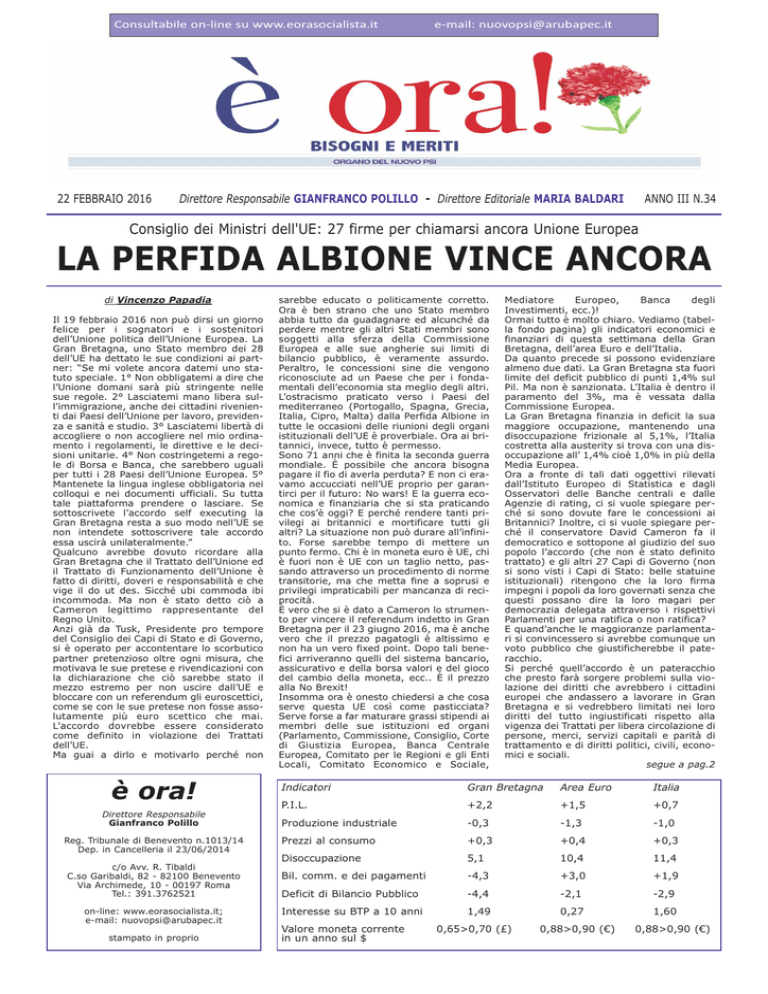 Consultabile on-line su www.eorasocialista.it 22 FEBBRAIO 2016 e-mail: [email protected] ANNO III N.34 Direttore Responsabile GIANFRANCO POLILLO - Direttore Editoriale MARIA BALDARI Consiglio dei Ministri dell'UE: 27 firme per chiamarsi ancora Unione Europea LA PERFIDA ALBIONE VINCE ANCORA di Vincenzo Papadia Il 19 febbraio 2016 non può dirsi un giorno felice per i sognatori e i sostenitori dell’Unione politica dell’Unione Europea. La Gran Bretagna, uno Stato membro dei 28 dell’UE ha dettato le sue condizioni ai partner: “Se mi volete ancora datemi uno statuto speciale. 1° Non obbligatemi a dire che l’Unione domani sarà più stringente nelle sue regole. 2° Lasciatemi mano libera sull’immigrazione, anche dei cittadini rivenienti dai Paesi dell’Unione per lavoro, previdenza e sanità e studio. 3° Lasciatemi libertà di accogliere o non accogliere nel mio ordinamento i regolamenti, le direttive e le decisioni unitarie. 4° Non costringetemi a regole di Borsa e Banca, che sarebbero uguali per tutti i 28 Paesi dell’Unione Europea. 5° Mantenete la lingua inglese obbligatoria nei colloqui e nei documenti ufficiali. Su tutta tale piattaforma prendere o lasciare. Se sottoscrivete l’accordo self executing la Gran Bretagna resta a suo modo nell’UE se non intendete sottoscrivere tale accordo essa uscirà unilateralmente.” Qualcuno avrebbe dovuto ricordare alla Gran Bretagna che il Trattato dell’Unione ed il Trattato di Funzionamento dell’Unione è fatto di diritti, doveri e responsabilità e che vige il do ut des. Sicché ubi commoda ibi incommoda. Ma non è stato detto ciò a Cameron legittimo rappresentante del Regno Unito. Anzi già da Tusk, Presidente pro tempore del Consiglio dei Capi di Stato e di Governo, si è operato per accontentare lo scorbutico partner pretenzioso oltre ogni misura, che motivava le sue pretese e rivendicazioni con la dichiarazione che ciò sarebbe stato il mezzo estremo per non uscire dall’UE e bloccare con un referendum gli euroscettici, come se con le sue pretese non fosse assolutamente più euro scettico che mai. L’accordo dovrebbe essere considerato come definito in violazione dei Trattati dell’UE. Ma guai a dirlo e motivarlo perché non è ora! Direttore Responsabile Gianfranco Polillo Reg. Tribunale di Benevento n.1013/14 Dep. in Cancelleria il 23/06/2014 c/o Avv. R. Tibaldi C.so Garibaldi, 82 - 82100 Benevento Via Archimede, 10 - 00197 Roma Tel.: 391.3762521 on-line: www.eorasocialista.it; e-mail: [email protected] stampato in proprio sarebbe educato o politicamente corretto. Ora è ben strano che uno Stato membro abbia tutto da guadagnare ed alcunché da perdere mentre gli altri Stati membri sono soggetti alla sferza della Commissione Europea e alle sue angherie sui limiti di bilancio pubblico, è veramente assurdo. Peraltro, le concessioni sine die vengono riconosciute ad un Paese che per i fondamentali dell’economia sta meglio degli altri. L’ostracismo praticato verso i Paesi del mediterraneo (Portogallo, Spagna, Grecia, Italia, Cipro, Malta) dalla Perfida Albione in tutte le occasioni delle riunioni degli organi istituzionali dell’UE è proverbiale. Ora ai britannici, invece, tutto è permesso. Sono 71 anni che è finita la seconda guerra mondiale. È possibile che ancora bisogna pagare il fio di averla perduta? E non ci eravamo accucciati nell’UE proprio per garantirci per il futuro: No wars! E la guerra economica e finanziaria che si sta praticando che cos’è oggi? E perché rendere tanti privilegi ai britannici e mortificare tutti gli altri? La situazione non può durare all’infinito. Forse sarebbe tempo di mettere un punto fermo. Chi è in moneta euro è UE, chi è fuori non è UE con un taglio netto, passando attraverso un procedimento di norme transitorie, ma che metta fine a soprusi e privilegi impraticabili per mancanza di reciprocità. È vero che si è dato a Cameron lo strumento per vincere il referendum indetto in Gran Bretagna per il 23 giugno 2016, ma è anche vero che il prezzo pagatogli è altissimo e non ha un vero fixed point. Dopo tali benefici arriveranno quelli del sistema bancario, assicurativo e della borsa valori e del gioco del cambio della moneta, ecc.. È il prezzo alla No Brexit! Insomma ora è onesto chiedersi a che cosa serve questa UE così come pasticciata? Serve forse a far maturare grassi stipendi ai membri delle sue istituzioni ed organi (Parlamento, Commissione, Consiglio, Corte di Giustizia Europea, Banca Centrale Europea, Comitato per le Regioni e gli Enti Locali, Comitato Economico e Sociale, Mediatore Europeo, Banca degli Investimenti, ecc.)! Ormai tutto è molto chiaro. Vediamo (tabella fondo pagina) gli indicatori economici e finanziari di questa settimana della Gran Bretagna, dell’area Euro e dell’Italia. Da quanto precede si possono evidenziare almeno due dati. La Gran Bretagna sta fuori limite del deficit pubblico di punti 1,4% sul Pil. Ma non è sanzionata. L’Italia è dentro il paramento del 3%, ma è vessata dalla Commissione Europea. La Gran Bretagna finanzia in deficit la sua maggiore occupazione, mantenendo una disoccupazione frizionale al 5,1%, l’Italia costretta alla austerity si trova con una disoccupazione all’ 1,4% cioè 1,0% in più della Media Europea. Ora a fronte di tali dati oggettivi rilevati dall’Istituto Europeo di Statistica e dagli Osservatori delle Banche centrali e dalle Agenzie di rating, ci si vuole spiegare perché si sono dovute fare le concessioni ai Britannici? Inoltre, ci si vuole spiegare perché il conservatore David Cameron fa il democratico e sottopone al giudizio del suo popolo l’accordo (che non è stato definito trattato) e gli altri 27 Capi di Governo (non si sono visti i Capi di Stato: belle statuine istituzionali) ritengono che la loro firma impegni i popoli da loro governati senza che questi possano dire la loro magari per democrazia delegata attraverso i rispettivi Parlamenti per una ratifica o non ratifica? E q