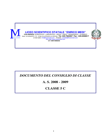 LICEO SCIENTIFICO STATALE “ENRICO MEDI” CON INDIRIZZI: SCIENTIFICO – LINGUISTICO – SOCIO * PSICO * PEDAGOGICO – CLASSICO Sede: VIA MAGENTA, 7/A - 37069 VILLAFRANCA dI VERONA - Tel. 045.7902067 Fax : 045.6300817 e-mail sede: [email protected] - Preside : [email protected] Sito http://www.liceomedi.com C.F. 80014060232 DOCUMENTO DEL CONSIGLIO DI CLASSE A. S. 2008 - 2009 CLASSE 5 C CONTENUTI DEL DOCUMENTO 1. Componenti del Consiglio di classe 2. Storia e giudizio complessivo sulla classe 3. Attività integrative svolte e attività di progetto 4. Obiettivi educativi e formativi comuni alla classe 5. Tematiche pluridisciplinari 6. Criteri di valutazione adottati dal Collegio dei Docenti 7. Relazioni e programmi disciplinari svolti 8. Griglie di valutazione 9. Testi di simulazione di terza prova e relativa griglia di valutazione 10. Griglie di valutazione in uso al Liceo Medi per l’esame di Stato 1. COMPONENTI DEL CONSIGLIO DI CLASSE Prof.ssa Rabbi Anna Maria (Italiano e Latino) Prof.ssa Icarelli Mariangela (Storia e Filosofia) Prof. ssa Poggi Barbara (Inglese) Prof. ssa Farina Alessandra (Matematica e Fisica) Prof. Enrico Lombardo (I.T.P. Fisica) Prof.ssa Nichele Stefania (Scienze) Prof.ssa Iannella Maria Teresa (Disegno) Prof.ssa Piona Elisabetta (Ed. fisica) Prof.ssa Colesbi Elena (Religione) Il Dirigente Scolastico Prof.Mario G.Bonini Villafranca di Verona, 15 maggio 2009 __________________________ 2. STORIA E GIUDIZIO COMPLESSIVO SULLA CLASSE Composizione delle classe 1. 2. 3. 4. 5. 6. 7. 8. 9. 10. 11. 12. 13. 14. 15. 16. 17. 18. 19. 20. 21. 22. 23. 24. Amadori Silvia Bonati Alessandro Bosco Nora Caldana Andrea Castagna Carlo Castioni Andrea Castioni Giada Cazzador Marco Cherubini Alberto Danieli Nicola De Martin Marco Franceschetto Nicole Giacopuzzi Massimo Gianfilippi Eleonora Gozzi Ariane Merlini Christopher Pietropoli Giovanni Pizzoli Marco Riggi Andrea Rigo Pierangelo Rotta Linda Spada Paolo Zanini Andrea Zenato Cecilia Numero di allievi/e nel quinquennio Classe 1° a.s. 2004-2005 La classe è composta da 21 alunni, alla fine dell’anno un alunno non viene ammesso alla classe successiva. Classe 2° a.s. 2005-2006 La classe è composta da 20 alunni. Nel primo quadrimestre un alunno si ritira. Allo scrutinio finale vengono tutti ammessi alla classe successiva. Classe 3° a.s. 2006-2007 La classe è composta da 29 alunni: 20 provenienti dalla classe ex 2C, 8 provenienti dalla classe ex 2L, 1 non promosso proveniente dalla classe ex 3F. Durante l’anno scolastico un alunno si trasferisce in altro istituto. Alla fine dell’anno scolastico quatto alunni non vengono ammessi alla classe successiva. Classe 4° a.s. 2007-2008 La classe è composta da.24 alunni. A metà anno un alunno si trasferisce in altro istituto ed alla fine dell’anno un alunno non viene ammesso alla classe successiva. Classe 5° a.s. 2008-2009 La classe è composta da 24 alunni di cui 22 provenienti dalla classe ex 4C, due non promosso provenienti dalla classe ex 5A e dalla classe ex 5C. Continuità dei docenti Religione Italiano Latino Geografia 1 Colesbi Elena Picicci Mariapia Picicci Mariapia Bellorio Flavio Storia Bellorio Flavio 2 Colesbi Elena Picicci Mariapia Picicci Mariapia 3 Colesbi Elena Rabbi Anna Rabbi Anna 4 Colesbi Elena Rabbi Anna Rabbi Anna 5 Colesbi Elena Rabbi Anna Rabbi Anna Rossignoli Mariateresa Ferrari Nuccia Icarelli Mariangela Icarelli Mariangela Poggi Barbara Farina Alessandra Farina Alessandra Nichele Stefania Castellini Roberta Nichele Stefania Icarelli Mariangela Icarelli Mariangela Poggi Barbara Farina Alessandra Farina Alessandra Basso Maddalena Nichele Stefania Nichele Stefania Piona Elisabetta Urbenti Andrea Piona Elisabetta Piona Elisabetta Filosofia Inglese Matematica Ferrari Nuccia Poggi Barbara Poggi Barbara Poggi Barbara Corghi Mariella Corghi Mariella Leoni Sara Fisica Disegno Scienze Ed. Fisica Leoni Sara Bertolini Bruno Dall’Aglio Annamaria Bertolini Bruno Ianella Nel corso del biennio la classe ha mantenuto sostanzialmente la continuità didattica in tutte le discipline ad eccezione di educazione fisica e storia; pure nel triennio si è mantenuta una discreta continuità a parte un avvicendamento in disegno ed educazione fisica. 2.1 GIUDIZIO COMPLESSIVO SULLA CLASSE Il percorso compiuto dalla classe 5C nel triennio è stato caratterizzato da un graduale peggioramento in relazione all’impegno e alla partecipazione all’attività scolastica. A differenza degli anni passati, l’impegno, quest’anno, è infatti risultato discontinuo e intensificato in prossimità delle prove di verifica. Questo ha portato, a volte, anche al raggiungimento di un profitto sufficiente, ma sul lungo periodo tale atteggiamento ha pesato sulla preparazione, che non sempre risulta ben consolidata. Anche la partecipazione degli alunni, alle attività proposte in classe, non è stata sempre attiva e interessata. È doveroso comunque segnalare quel gruppo di alunni che ha saputo maturare nel tempo buone capacità di autonoma gestione dello studio e profondità di apprendimento, avvalendosi di forti motivazioni interiori e di personale sensibilità culturale. Sostenuti da consapevolezza di intenti e costante dedizione tali alunni vanno, in particolare, segnalati per aver saputo proporre e perseguire modelli scolastici ed umani personali ed alternativi all’interno di un contesto-classe non sempre favorevole. La condotta è stata generalmente corretta, anche se alcuni docenti hanno rilevato un comportamento distaccato da parte di certi alunni e la necessità di interventi per sollecitare l’assolvimento degli impegni scolastici . Sul piano del profitto, i risultati ottenuti, in termini di conoscenze e abilità, sono così riassumibili: • un gruppo di studenti raggiunge risultati soddisfacenti e possiede una preparazione buona, in qualche caso eccellente; le conoscenze sono approfondite; le capacità di rielaborazione adeguate; l' espressione e l' uso della terminologia specifica corret