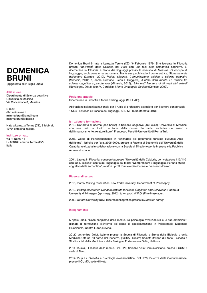 DOMENICA BRUNI Domenica Bruni è nata a Lamezia Terme (CZ) l’8 Febbraio 1979. Si è laureata in Filosofia presso l’Università della Calabria nel 2004 con una tesi sulla semantica cognitiva. E' ricercatrice in Filosofia e teoria dei linguaggi presso l'Università di Messina. Si occupa di linguaggio, evoluzione e natura umana. Tra le sue pubblicazioni come autrice, Storia naturale dell’amore (Carocci, 2010), Politici sfigurati. Comunicazione politica e scienza cognitiva (Mimesis, 2012) e, come curatrice, (con G.Ruggiero), Il ritmo della mente. La musica tra scienza cognitiva e psicoterapia (Mimesis, 2015); Like me? Mente e diritti negli altri animali (Novalogos, 2013); (con V. Cardella), Mente Linguaggio Società (Corisco, 2009). Affiliazione Dipartimento di Scienze cognitive Università di Messina Via Concezione 8, Messina Posizione attuale Ricercatrice in Filosofia e teoria dei linguaggi (M-FIL/05). (aggiornato al 21 luglio 2015) Abilitazione scientifica nazionale per il ruolo di professore associato per il settore concorsuale 11/C4 - Estetica e Filosofia dei linguaggi, SSD M-FIL/05 (tornata 2013). E-mail: [email protected] [email protected] [email protected] Istruzione e formazione 2010. Dottorato di ricerca (con borsa) in Scienze Cognitive (XXII ciclo), Università di Messina, con una tesi dal titolo: La forza della natura. Le radici evolutive del sesso e dell’innamoramento, relatore il prof. Francesco Ferretti (Università di Roma Tre). Nata a Lamezia Terme (CZ), 8 febbraio 1979, cittadina italiana. Indirizzo privato via P. Nenni 48 I – 88046 Lamezia Terme (CZ) Italia 2006. Corso di Perfezionamento in “Animatori del patrimonio turistico culturale Area dell’Istmo”, istituito per l’a.a. 2005-2006, presso la Facoltà di Economia dell’Università della Calabria, realizzata in collaborazione con la Scuola di Direzione per le Imprese e la Pubblica Amministrazione. v i a L u n f 2004. Laurea in Filosofia, conseguita presso l’Università della Calabria, con votazione 110/110 con lode. Tesi in Filosofia del linguaggio dal titolo: “Comprendere il linguaggio. Per uno studio cognitivo della semantica”, relatori i proff. Daniele Gambarara e Francesco Ferretti. Ricerca all'estero 2015, marzo. Visiting researcher. New York University, Department of Philosophy. 2012. Visiting researcher. Donders Institute for Brain, Cognition and Behaviour, Radboud University di Nijmegen (apr.-mag. 2012); tutor: prof. W.F.G. (Pim) Haselager. 2009. Oxford University (UK). Ricerca bibliografica presso la Bodleian library. Insegnamento 5 aprile 2014, "Cosa sappiamo della mente. La psicologia evoluzionista e le sue ambizioni", gionata di formazione all'interno del corso di specializzazione in Psicoterapia Sistemico Relazionale, Centro Eidos,Treviso. 20-22 settembre 2012, lezione presso la Scuola di Filosofia e Storia della Biologia e della MedicinaNettuno, "Il corpo del Piacere", (SISSA- Trieste; Società italiana di Storia, Filosofia e Studi sociali della Medicina e della Biologia), Fortezza san Gallo, Nettuno. 2014-15 (a.a.): Filosofia della mente, CdL L20, Scienze della Comunicazione, presso il CUMO, sede di Noto. 2014-15 (a.a.): Filosofia e psicologia evoluzionistica, CdL L20, Scienze della Comunicazione, presso il CUMO, sede di Noto. 2014-15 (a.a.): Psicopatologia evoluzionistica, CdL L20, Scienze della Comunicazione, presso il CUMO, sede di Noto. 2014-15 (a.a.): Filosofia e psicologia evoluzionistica, CdL L20, Scienze della Comunicazione, Dipartimento di Scienze cognitive della formazione e degli studi culturali, Università di Messina. 2014-15 (a.a.): Filosofia e psicologia evoluzionistica (Laboratori seminariali di Scienze cognitive), CdL LM55, Scienze cognitive, Dipartimento di Scienze cognitive della formazione e degli studi culturali, Università di Messina. 2013-14 (a.a.): Filosofia della mente, CdL L20, Scienze della Comunicazione, presso il CUMO, sede di Noto. 2013-14 (a.a.):Filosofia e psicologia evoluzionistica, CdL L20, Scienze della Comunicazione, presso il CUMO, sede di Noto. 2013-14 (a.a.): Psicopatologia evoluzionistica, CdL L20, Scienze della Comunicazione, presso il CUMO, sede di Noto. 2013-14 (a.a.): Filosofia e psicologia evoluzionistica, CdL L20, Scienze della Comunicazione, Dipartimento di Scienze cognitive, della Formazione e degli Studi Culturali, Università degli Studi di Messina. 2013-14 (a.a.): Psicolinguistica evoluzionistica (Laboratori seminariali di Scienze cognitive), CdL LM55, Scienze cognitive, Dipartimento di Scienze cognitive, della Formazione e degli Studi Culturali, Università degli Studi di Messina. 2012-13 (a.a.): docente a contratto di "Psicolinguistica evoluzionista", Corso di Laurea magistrale in Scienze cognitive, Dipartimento di Scienze cognitive della formazione e degli studi culturali, Università di Messina. 2012-13 (a.a.): docente a contratto di "Filosofia e psicologia evoluzionista", Corso di Laurea triennale (L-20), Dipartimento di Scienze cognitive della formazione e degli studi culturali,, Università di Messina. 2012-13 (a.a.): docente a contratto di "Psicopatologia evoluzionista", Corso di Laurea triennale (L-20), Dipartimento di Scienze cognitive della formazione e degli studi culturali,, Università di Messina (sede di Noto-SR). 2012-13 (a.a.): docente a contratto di "Filosofia e psicologia evoluzionista", Corso di Laurea triennale (L-20), Dipartimento di Scienze cognitive della formazione e degli studi culturali, Università di Messina (sede di Noto-SR). 2011-12 (a.a.): docente a contratto di “Psicopatologia evoluzionista”, Corso di Laurea magistrale in Scienze cognitive, Facoltà di Scienze della Formazione, Università di Messina. 2011-12 (a.a.): docente a contratto di “Psicopatologia evoluzionista”, Corso di Laurea triennale, Facoltà di Scienze della Formazione, Università di Messina (sede di Noto-SR). 2010-11 (a.a.): docente a contratto di “Psicolinguistica evoluzionista”, Corso di Laurea magistrale in Scienze co