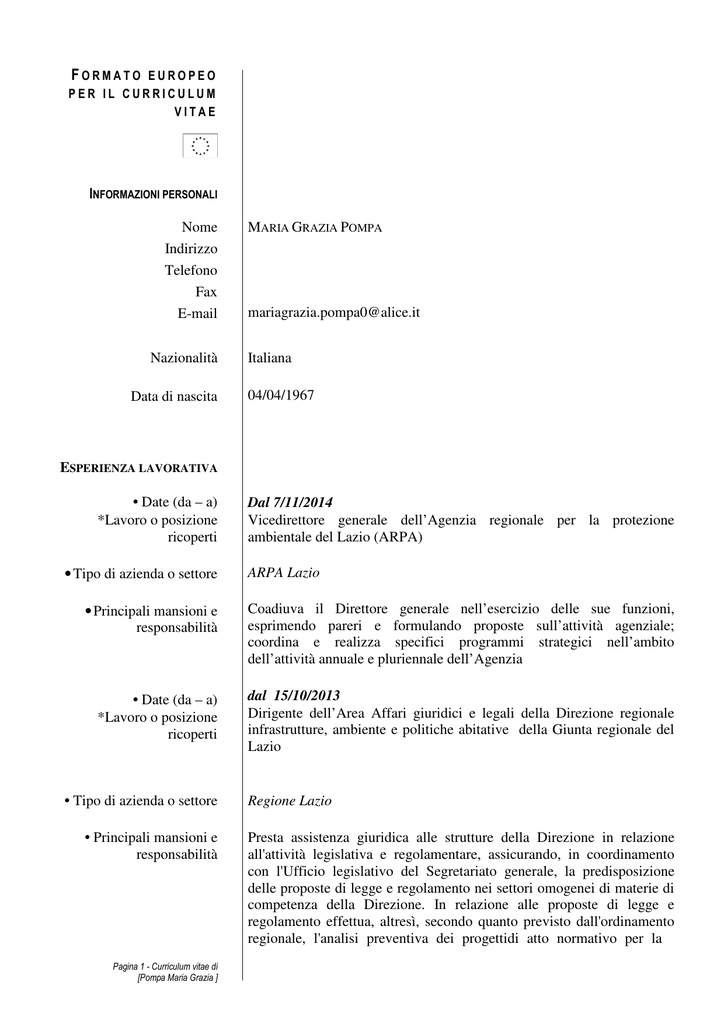 FORMATO EUROPEO PER IL CURRICULUM VITAE INFORMAZIONI PERSONALI Nome Indirizzo Telefono Fax E-mail Nazionalità Data di nascita MARIA GRAZIA POMPA [email protected] Italiana 04/04/1967 ESPERIENZA LAVORATIVA • Date (da – a) *Lavoro o posizione ricoperti • Tipo di azienda o settore Dal 7/11/2014 Vicedirettore generale dell’Agenzia regionale per la protezione ambientale del Lazio (ARPA) ARPA Lazio • Principali mansioni e responsabilità Coadiuva il Direttore generale nell’esercizio delle sue funzioni, esprimendo pareri e formulando proposte sull’attività agenziale; coordina e realizza specifici programmi strategici nell’ambito dell’attività annuale e pluriennale dell’Agenzia • Date (da – a) *Lavoro o posizione ricoperti dal 15/10/2013 Dirigente dell’Area Affari giuridici e legali della Direzione regionale infrastrutture, ambiente e politiche abitative della Giunta regionale del Lazio • Tipo di azienda o settore • Principali mansioni e responsabilità Pagina 1 - Curriculum vitae di [Pompa Maria Grazia ] Regione Lazio Presta assistenza giuridica alle strutture della Direzione in relazione all'attività legislativa e regolamentare, assicurando, in coordinamento con l'Ufficio legislativo del Segretariato generale, la predisposizione delle proposte di legge e regolamento nei settori omogenei di materie di competenza della Direzione. In relazione alle proposte di legge e regolamento effettua, altresì, secondo quanto previsto dall'ordinamento regionale, l'analisi preventiva dei progettidi atto normativo per la valutazione della congruità e dei relativi effetti (Analisi d'impatto della regolazione -AIR), procedendo alle necessarie consultazioni e prendendo in esame, in particolare, le diverse opzioni regolatorie, l'impatto degli interventi legislativi e regolamentari sull'organizzazione delle Amministrazioni, sui cittadini e sulle imprese, nonché sui costi e i benefici della soluzione normativa proposta. Presta assistenza giuridica alle strutture della Direzione per la predisposizione di atti di alta amministrazione. Fornisce consulenza giuridica alle strutture della Direzione, mediante la redazione di pareri e la redazione di circolari esplicative ai fini della corretta applicazione della normativa vigente. Cura i rapporti con l'Avvocatura regionale e statale; provvede a monitorare e supportare le strutture della Direzione in relazione agli adempimenti connessi al contenzioso presso ogni grado di giurisdizione; predispone le relazioni necessarie alla difesa regionale e predispone le bozze delle transazioni da trasmettere all'Avvocatura regionale • Date (da – a) *Lavoro o posizione ricoperti • Tipo di azienda o settore dal 10 aprile 2013 al 15 ottobre 2013 Dirigente responsabile dell’Area Ciclo integrato dei rifiuti della Direzione regionale Urbanistica, mobilità e rifiuti della Giunta regionale del Lazio, Regione Lazio • Principali mansioni e responsabilità Cura l’attività amministrativa relativa alla materia dei rifiuti, con particolare riferimento alle procedure per il rilascio delle Autorizzazioni Integrate Ambientali di cui al D.lgs. 152/2006 per gli impianti di recupero e smaltimento, ai trasporti transfrontalieri di rifiuti, all’incentivazione della raccolta differenziata, alla predisposizione del piano regionale dei rifiuti e delle bonifiche e delle sue modifiche e integrazioni. Nel periodo di riferimento ha svolto in modo precipuo le attività di supporto tecnico di competenza regionale al Ministero dell’Ambiente e al commissario ministeriale per il superamento della situazione di criticità nella gestione dei rifiuti di Roma capitale, Fiumicino, Ciampino e Stato Città del Vaticano nonché le procedure amministrative e civilistiche per l’acquisizione da parte della Lazio Ambiente S.p.A., società regionale preposta alle attività di gestione dei rifiuti, di rami d’azienda del consorzio GAIA in amministrazione straordinaria e per lo start up dell’azienda; • Date (da – a) dal 24 settembre 2012 al 10 aprile 2013 (data della revoca ante tempus dell’incarico in conseguenza della riorganizzazione delle strutture amministrative) Incarico di Direttore regionale della Direzione Attività produttive e rifiuti della Giunta regionale del Lazio, *Lavoro o posizione ricoperti • Tipo di azienda o settore • Principali mansioni e responsabilità Pagina 2 - Curriculum vitae di [Pompa Maria Grazia ] Regione Lazio Funzioni di coordinamento e direzione della attività di competenza regionale afferenti alle materie del commercio, artigianato e industria, con particolare riferimento alle piccole e medie imprese, cooperative e associazioni imprenditoriali, imprenditoria giovanile e femminile nonché alla patrimonializzazione delle imprese e dei CONFIDI e all’internazionalizzazione delle PMI, in particolare curando le seguenti attività: - cura dei rapporti con le Camere di commercio, le Commissioni per l’artigianato, i Consorzi di sviluppo industriale, il MOF S.p.A., il CAR ScpA e le altre società partecipate dalla Regione Lazio nei settori di interesse della Direzione; - predisposizione della programmazione triennale commerciale su aree pubbliche e private e adozione degli atti di competenza regionale per le grandi strutture di vendita nonché per la realizzazione, ampliamento e spostamento dei mercati; - gestione delle attività, come responsabile di gestione, del POR FESR 2007-2013 – attività I.4 " Acquisizione di servizi avanzati per le PMI" attività I.6 “Promozione di prodotti e processi produttivi rispettosi dell’ambiente” Settore e Filiera regionale della Carta - Settore e Filiera regionale della Ceramica -Settore e Filiera regionale della Nautica Settore e Filiera regionale dell’Audiovisivo - Settore e Filiera regionale dell’Innovazione - attività I.5 subattività I.5.1 "Potenziamento dei Confidi"; - pianificazione, autorizzazione e vigilanza in materia di cave, miniere e geotermia, torbiere, acque minerali e termali