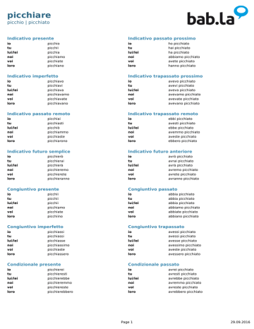picchiare picchio | picchiato Indicativo presente Indicativo passato prossimo io tu lui/lei noi voi loro io tu lui/lei noi voi loro picchio picchii picchia picchiamo picchiate picchiano ho picchiato hai picchiato ha picchiato abbiamo picchiato avete picchiato hanno picchiato Indicativo imperfetto Indicativo trapassato prossimo io tu lui/lei noi voi loro io tu lui/lei noi voi loro picchiavo picchiavi picchiava picchiavamo picchiavate picchiavano avevo picchiato avevi picchiato aveva picchiato avevamo picchiato avevate picchiato avevano picchiato Indicativo passato remoto Indicativo trapassato remoto io tu lui/lei noi voi loro io tu lui/lei noi voi loro picchiai picchiasti picchiò picchiammo picchiaste picchiarono ebbi picchiato avesti picchiato ebbe picchiato avemmo picchiato aveste picchiato ebbero picchiato Indicativo futuro semplice Indicativo futuro anteriore io tu lui/lei noi voi loro io tu lui/lei noi voi loro picchierò picchierai picchierà picchieremo picchierete picchieranno avrò picchiato avrai picchiato avrà picchiato avremo picchiato avrete picchiato avranno picchiato Congiuntivo presente Congiuntivo passato io tu lui/lei noi voi loro io tu lui/lei noi voi loro picchii picchii picchii picchiamo picchiate picchiino abbia picchiato abbia picchiato abbia picchiato abbiamo picchiato abbiate picchiato abbiano picchiato Congiuntivo imperfetto Congiuntivo trapassato io tu lui/lei noi voi loro io tu lui/lei noi voi loro picchiassi picchiassi picchiasse picchiassimo picchiaste picchiassero avessi picchiato avessi picchiato avesse picchiato avessimo picchiato aveste picchiato avessero picchiato Condizionale presente Condizionale passato io tu lui/lei noi voi loro io tu lui/lei noi voi loro picchierei picchieresti picchierebbe picchieremmo picchiereste picchierebbero Page 1 avrei picchiato avresti picchiato avrebbe picchiato avremmo picchiato avreste picchiato avrebbero picchiato 29.09.2016 picchiare picchio | picchiato Imperativo tu lui/lei noi voi loro Participio presente picchia picchi picchiamo picchiate picchiino picchiante Participio passato Gerundio picchiato picchiando Gerundio passato Infinito avendo picchiato picchiare Infinito passato avere picchiato Page 2 29.09.2016