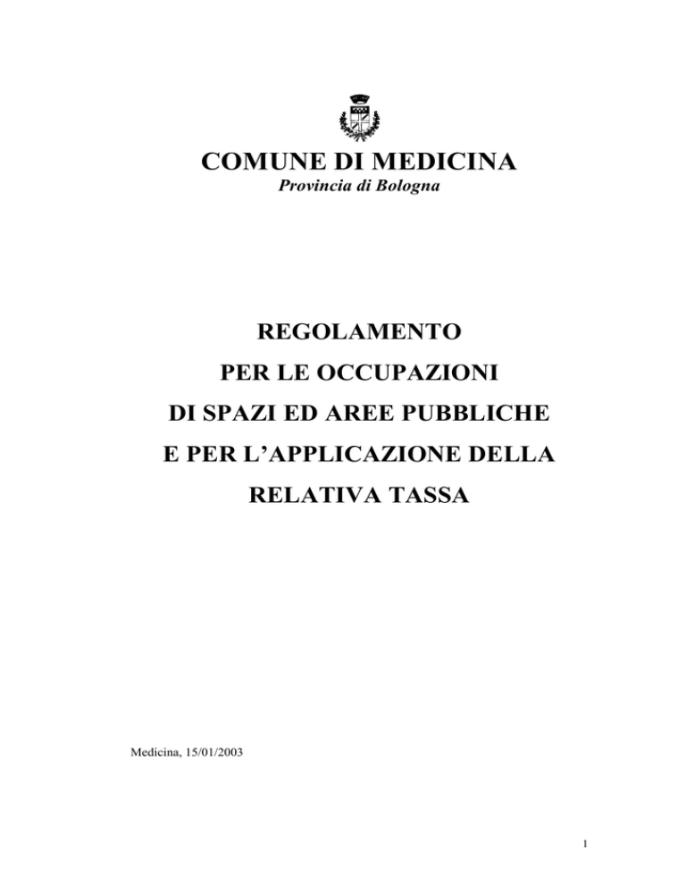 COMUNE DI MEDICINA Provincia di Bologna REGOLAMENTO PER LE OCCUPAZIONI DI SPAZI ED AREE PUBBLICHE E PER L’APPLICAZIONE DELLA RELATIVA TASSA Medicina, 15/01/2003 1 REGOLAMENTO PER LE OCCUPAZIONI DI SPAZI ED AREE PUBBLICHE E PER L’APPLICAZIONE DELLA RELATIVA TASSA CAPO I ART. 1 (Occupazioni di spazi ed aree pubbliche) Per le occupazioni di spazi ed aree pubbliche nel territorio del Comune di Medicina si osservano le norme del presente regolamento. Quando nel presente regolamento sono usate le espressioni “suolo pubblico” e “spazio pubblico” si vogliono intendere i luoghi e il suolo di dominio pubblico appartenenti al demanio o al patrimonio indisponibile del Comune e quelli di proprietà privata soggetti a servitù di pubblico passaggio, quali le strade, le piazze, i corsi, i pubblici mercati, i portici, i parchi, i giardini, ecc... ART. 2 (Concessione di occupazione) E’ fatto divieto di occupare il suolo pubblico nonchè lo spazio ad esso sovrastante o sottostante senza specifica concessione comunale rilasciata dall’Autorità competente su richiesta dell’interessato; la concessione si intende accordata per le occupazioni occasionali di cui all’art. 26 a seguito di comunicazione scritta alla Polizia Municipale da darsi almeno cinque giorni prima dell’occupazione per la verifica del rispetto del Codice della Strada e per le prescrizioni del caso. La comunicazione non è richiesta per le occupazioni di pronto intervento e per quelle momentanee di cui alle lettere d) ed e) dell’art. 26, se l’occupazione interessa la sede stradale l’interessato ha l’obbligo di osservare gli artt. 30 e seguenti del Regolamento di attuazione del Nuovo Codice della Strada. La concessione è richiesta anche per l’allestimento dei banchi finalizzati alla raccolta delle firme quando l’occupazione non sia riconducibile a quella prevista alla lettera a) del precitato art. 26. ART. 3 (Occupazione d’urgenza) Per far fronte a situazioni di emergenza o quando si tratti di provvedere all’esecuzione di lavori che non consentono alcun indugio l’occupazione può essere effettuata dall’interessato prima di aver conseguito il formale provvedimento concessorio, che viene rilasciato a sanatoria. In tal caso oltre alla domanda intesa ad ottenere la concessione, l’interessato ha l’obbligo di dare immediata comunicazione dell’occupazione alla Polizia Municipale via fax o con telegramma. L’Ufficio provvede ad accertare se esistevano le condizioni di urgenza, in caso negativo verranno applicate le sanzioni di cui all’art. 28 del presente regolamento. 2 Per quanto concerne le misure da adottare per la circolazione si fa rinvio a quanto disposto al riguardo dagli artt. 30 e seguenti del Regolamento di attuazione del Nuovo Codice della Strada. ART. 4 (Domanda di occupazione) Chiunque intenda occupare, nel territorio comunale, anche temporaneamente, spazi in superficie, sovrastanti o sottostanti al suolo pubblico, oppure aree private soggette a servitù di pubblico passaggio, deve farne apposita domanda al Comune. La domanda, redatta in carta legale, va consegnata all’Ufficio Protocollo. In caso di trasmissione tramite il servizio postale, la data di ricevimento, ai fini del termine per la conclusione del procedimento, è quella risultante dal timbro datario apposto all’arrivo. La domanda deve contenere: a) l’indicazione delle generalità, della residenza o domicilio legale ed il codice fiscale del richiedente; b) l’ubicazione esatta del tratto di area pubblica che si chiede di occupare e la misura; c) l’oggetto dell’occupazione, la durata, i motivi a fondamento della stessa, la descrizione dell’opera che si intende eventualmente eseguire, le modalità d’uso; d) la dichiarazione di conoscere e di sottostare a tutte le condizioni contenute nel presente regolamento; e) la sottoscrizione dell’impegno a sostenere tutte le eventuali spese di sopralluogo e di istruttoria, con deposito di cauzione se richiesto dal Comune. La domanda deve essere corredata dalla relativa documentazione tecnica. Comunque il richiedente è tenuto a produrre tutti i documenti ed a fornire tutti i dati ritenuti necessari ai fini dell’esame della domanda. Per quanto concerne la documentazione eventualmente necessaria ai fini dell’istruttoria e di cui deve essere corredata la domanda, si fa rinvio al Regolamento sul Procedimento Amministrativo, adottato in applicazione della Legge 241/1990. Anche in caso di piccole occupazioni temporanee occorre che la domanda sia corredata da disegno illustrativo dello stato di fatto, della dimensione della sede stradale e del posizionamento dell’ingombro. ART. 5 (Pronuncia sulla domanda) Per l’istruttoria e per la definizione, le domande sono assegnate al competente ufficio comunale in base ai servizi afferenti a ciascun Settore: Ufficio Polizia Amministrativa: - occupazioni inerenti il commercio fisso ed ambulante, fiere, festeggiamenti, distributori di carburante e di tabacchi; Ufficio Tecnico: - occupazioni con passi carrabili, allacciamenti in genere, interventi permanenti su suolo pubblico ed interventi per l’esercizio dell’attività edilizia. All’atto della presentazione della domanda o successivamente mediante comunicazione personale indirizzata ai soggetti indicati all’art. 7 della Legge 241/1990 viene reso noto l’avvio del procedimento e l’unità organizzativa e il nome del Responsabile del 3 procedimento nonchè le altre notizie in conformità a quanto previsto dal regolamento sul Procedimento Amministrativo. Salvo quanto disposto da leggi specifiche, sulla domanda diretta ad ottenere la concessione e l’autorizzazione di occupazione, l’Autorità competente provvede entro i termini stabiliti dal Regolamento sul Procedimento amministrativo. In caso di mancata previsione regolamentare, il termine per la decisione è quello stabilito dalla Legge 7/8/1990 n. 241. In caso di diniego sono comunicati al richiedente , nei termini medesimi, i