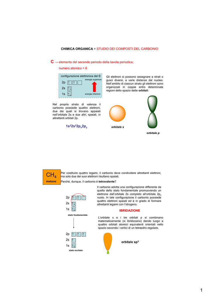 CHIMICA ORGANICA = STUDIO DEI COMPOSTI DEL CARBONIO C → elemento del secondo periodo della tavola periodica; numero atomico = 6 configurazione elettronica del C 2p ↑ energia superiore ↑ 2s ↑↓ 1s ↑↓ Gli elettroni si possono assegnare a strati o gusci diversi, a varie distanze dal nucleo. Nell’ambito di ciascun strato gli elettroni sono organizzati in coppie entro determinate regioni dello spazio dette orbitali. energia inferiore Nel proprio strato di valenza il carbonio possiede quattro elettroni, due dei quali si trovano appaiati nell’orbitale 2s e due altri, spaiati, in altrettanti orbitali 2p. 1s22s22px2py orbitale s orbitale p CH4 Per costituire quattro legami, il carbonio deve condividere altrettanti elettroni, ma solo due dei suoi elettroni risultano spaiati. metano Perché, dunque, il carbonio è tetravalente? 2p ↑ Il carbonio adotta una configurazione differente da quella dello stato fondamentale promuovendo un elettrone dall’orbitale 2s completo all’orbitale 2pz vuoto. In tale configurazione il carbonio possiede quattro elettroni spaiati ed è in grado di formare altrettanti legami con l’idrogeno. ↑ 2s ↑↓ 1s ↑↓ IBRIDAZIONE stato fondamentale 2p ↑ ↑ L’orbitale s e i tre orbitali p si combinano matematicamente (si ibridizzano) dando luogo a quattro orbitali atomici equivalenti orientati nello spazio secondo i vertici di un tetraedro regolare. ↑ 2s ↑ 1s ↑↓ orbitale sp3 stato eccitato 1 CH4 orbitale sp3 = orbitale direzionale Quando i quattro orbitali identici di un atomo di carbonio ibridizzato sp3 si sovrappongono ad altrettanti orbitali 1s di atomi di idrogeno, prendono corpo quattro legami C-H identici. + orbitale sp3 orbitale s orbitale σ del carbonio dell’idrogeno C-H L’angolo di legame formato da ciascun H-C-H vale esattamente 109,5° (angolo tetraedrico) 2 Una particolare caratteristica del carbonio è la sua attitudine a formare legami covalenti con altri atomi di carbonio. Due atomi di carbonio si legano reciprocamente mediante sovrapposizione dei loro orbitali ibridi sp3. + orbitale sp3 del carbonio orbitale sp3 orbitale σ del carbonio C-C C2H6 o CH3CH3 etano C2H4 = etene IBRIDAZIONE sp2 Quando si “mescolano” un orbitale 2s e due orbitali 2p, si formano 3 orbitali ibridi sp2, i cui lobi sono diretti ai vertici di un triangolo equilatero con angoli di 120°. La geometria quindi è planare-triangolare. L’ orbitale pz non ibridato invece orienta i suoi due lobi al di sopra e al disotto del piano del triangolo individuato dai tre orbitali ibridi H H H 121,7° H 116,6° H H vista dall'alto H H vista laterale 3 Se consentiamo che due atomi di carbonio ibridizzati sp2 si accostino, essi formeranno un forte legame σ per sovrapposizione sp2-sp2 e, quando ciò avviene, anche gli orbitali p non ibridizzati, ancora presenti su ciascun carbonio, si avvicineranno per sovrapporsi e formare un legame π. Affinché si possa formare il legame π, gli orbitali p devono essere paralleli, ne segue che tra due atomi legati da un doppio legame non si può avere libera rotazione, che è invece possibile attorno al legame semplice σ. Questa situazione caratterizza gli ALCHENI, gli idrocarburi che contengono un doppio legame C-C. 4 C2H2 = etino o acetilene IBRIDAZIONE sp L’esistenza del triplo legame esige che si costruisca un terzo tipo di orbitale ibrido, l’ibrido sp. L’orbitale 2s si combina con un solo orbitale 2p. Ne scaturiscono due orbitali ibridi sp, mentre rimangono immutati due orbitali p. I due orbitali sp sono allineati, cioè orientati a 180° l’uno rispetto all’altro, mentre i due orbitali p rimanenti sono perpendicolari agli ibridi. 5 Nella formazione dei legami molecolari ogni atomo di carbonio impiega i due orbitali ibridi sp per formare 2 legami σ (uno con un atomo di idrogeno l’altro con un atomo di carbonio). Invece i due orbitali non ibridi dei due atomi di carbonio si sovrappongono lateralmente per formare due legami p. 6