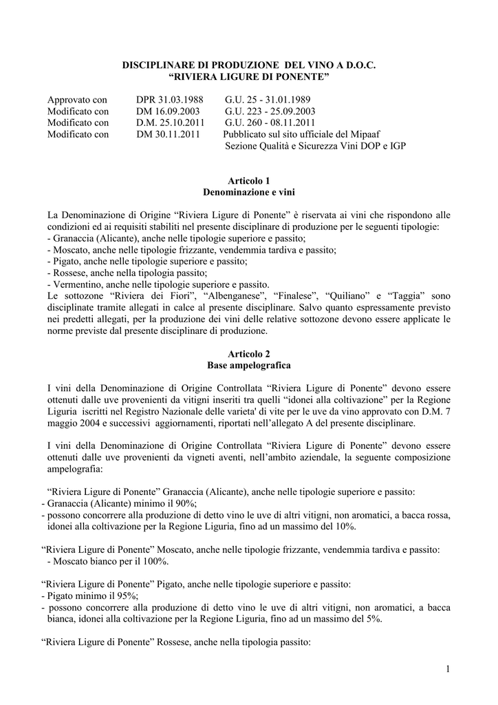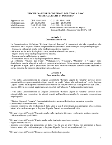 DISCIPLINARE DI PRODUZIONE DEL VINO A D.O.C. “RIVIERA LIGURE DI PONENTE” Approvato con Modificato con Modificato con Modificato con DPR 31.03.1988 DM 16.09.2003 D.M. 25.10.2011 DM 30.11.2011 G.U. 25 - 31.01.1989 G.U. 223 - 25.09.2003 G.U. 260 - 08.11.2011 Pubblicato sul sito ufficiale del Mipaaf Sezione Qualità e Sicurezza Vini DOP e IGP Articolo 1 Denominazione e vini La Denominazione di Origine “Riviera Ligure di Ponente” è riservata ai vini che rispondono alle condizioni ed ai requisiti stabiliti nel presente disciplinare di produzione per le seguenti tipologie: - Granaccia (Alicante), anche nelle tipologie superiore e passito; - Moscato, anche nelle tipologie frizzante, vendemmia tardiva e passito; - Pigato, anche nelle tipologie superiore e passito; - Rossese, anche nella tipologia passito; - Vermentino, anche nelle tipologie superiore e passito. Le sottozone “Riviera dei Fiori”, “Albenganese”, “Finalese”, “Quiliano” e “Taggia” sono disciplinate tramite allegati in calce al presente disciplinare. Salvo quanto espressamente previsto nei predetti allegati, per la produzione dei vini delle relative sottozone devono essere applicate le norme previste dal presente disciplinare di produzione. Articolo 2 Base ampelografica I vini della Denominazione di Origine Controllata “Riviera Ligure di Ponente” devono essere ottenuti dalle uve provenienti da vitigni inseriti tra quelli “idonei alla coltivazione” per la Regione Liguria iscritti nel Registro Nazionale delle varieta' di vite per le uve da vino approvato con D.M. 7 maggio 2004 e successivi aggiornamenti, riportati nell’allegato A del presente disciplinare. I vini della Denominazione di Origine Controllata “Riviera Ligure di Ponente” devono essere ottenuti dalle uve provenienti da vigneti aventi, nell’ambito aziendale, la seguente composizione ampelografia: “Riviera Ligure di Ponente” Granaccia (Alicante), anche nelle tipologie superiore e passito: - Granaccia (Alicante) minimo il 90%; - possono concorrere alla produzione di detto vino le uve di altri vitigni, non aromatici, a bacca rossa, idonei alla coltivazione per la Regione Liguria, fino ad un massimo del 10%. “Riviera Ligure di Ponente” Moscato, anche nelle tipologie frizzante, vendemmia tardiva e passito: - Moscato bianco per il 100%. “Riviera Ligure di Ponente” Pigato, anche nelle tipologie superiore e passito: - Pigato minimo il 95%; - possono concorrere alla produzione di detto vino le uve di altri vitigni, non aromatici, a bacca bianca, idonei alla coltivazione per la Regione Liguria, fino ad un massimo del 5%. “Riviera Ligure di Ponente” Rossese, anche nella tipologia passito: 1 - Rossese minimo il 90%; - possono concorrere alla produzione di detto vino le uve di altri vitigni, non aromatici, a bacca rossa, idonei alla coltivazione per la Regione Liguria, fino ad un massimo del 10%. “Riviera Ligure di Ponente” Vermentino, anche nelle tipologie superiore e passito: - Vermentino minimo il 95%; - possono concorrere alla produzione di detto vino le uve di altri vitigni, non aromatici, a bacca bianca, idonei alla coltivazione per la Regione Liguria, fino ad un massimo del 5%. Articolo 3 Zona di produzione delle uve La zona di produzione delle uve atte alla produzione dei vini a denominazione d'origine controllata “Riviera Ligure di Ponente” ricade nelle province di Imperia, Savona e Genova e comprende i terreni vocati alla qualità dei territori dei Comuni: Provincia di Imperia: l’intero territorio amministrativo e parte del territorio dei comuni di: Cosio d'Arroscia, Mendatica Pornassio e Triora (delimitato a nord dal crinale alpino}; Provincia di Savona: l’intero territorio amministrativo dei comuni di: Alassio, Albenga, Andora, Arnasco, Balestrino, Boissano, Borghetto S.S.,, Casanova Lerrone, Castelbianco, Ceriale, Cisano sul Neva., Erli, Garlenda, Laigueglia, Nasino, Onzo, Ortovero, Stellanello, Testico, Vendone, Villanova d’A. Zuccarello, Balestrino, Boissano, Borghetto S.S., Borgio Verezzi, Finale L, Giustenice, Loano, Magliolo, Noli, Orco Feglino, Pietra L, Rialto, Toirano, Tovo S.Giacomo, Vezzi Portio, Spotorno, Bergeggi, Savona, Quiliano, Vado Ligure, Albisola Marina, Albisola Superiore, Stella, Celle Ligure, Varazze e parte del territorio dei comuni di: Calice Ligure e Castelvecchio di Rocca Barbena (delimitato a nord dal crinale appenninico); Provincia di Genova: l’intero territorio amministrativo dei comuni di Arenzano e Cogoleto. La zona di produzione dei vini a denominazione d'origine controllata “Riviera Ligure di Ponente” nelle diverse tipologie aventi diritto alla sottodenominazione “Riviera dei Fiori” comprende l’intero territorio amministrativo della Provincia di Imperia e la parte del territorio dei comuni di Cosio d'Arroscia, Mendatica, Pornassio e Triora (delimitato a nord dal crinale alpino. La zona di produzione dei vini a denominazione d'origine controllata “Riviera Ligure di Ponente” nelle diverse tipologie aventi diritto alla sottodenominazione “Albenganese” comprende in Provincia di Savona: l’intero territorio amministrativo dei seguenti comuni: Alassio, Albenga, Andora, Arnasco, Casanova L., Castelbianco, Ceriale, Cisano s.N., Erli, Garlenda, Laigueglia, Nasino, Onzo, Ortovero, Stellanello, Testico, Vendone, Villanova d’A. e Zuccarello. e la parte del territorio del comune di Castelvecchio di Rocca Barbena (delimitato a nord dal crinale appenninico). La zona di produzione dei vini a denominazione d'origine controllata “Riviera Ligure di Ponente” nelle diverse tipologie aventi diritto alla sottodenominazione “Finalese” comprende in Provincia di Savona: l’intero territorio amministrativo dei seguenti comuni: Balestrino, Boissano, Borghetto S.S., Borgio Verezzi, Finale L., Giustenice, Loano, Magliolo, Noli, Orco Feglino., Pietra L., Rialto, Spotorno, Toirano, Tovo S.Giacomo, Vezzi Portio e la parte del territorio del comune di Calice Ligure (delimit