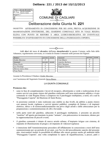 Delibera: 221 / 2013 del 10/12/2013 Prop n. 323 del 06/12/2013 Uff. Prop. Servizio Ambiente, Parchi e Verde Allegati N. 1 Uffici COMUNE DI CAGLIARI Deliberazione della Giunta N. 221 OGGETTO: AFFIDAMENTO IN CONCESSIONE PER SEI ANNI, PREVIA ACQUISIZIONE DI MANIFESTAZIONI D'INTERESSE, DEL GIARDINO COMUNALE SITO IN VIALE REGINA ELENA CON PUNTO DI RISTORO E AREA LUDICO-RICREATIVA ED EVENTUALE POSSIBILITA' D'AFFIDAMENTO IN CONCESSIONE DELLA PASSEGGIATA COPERTA. Addì dieci del mese di dicembre dell'anno duemilatredici in questo Comune, nella Sala delle Adunanze, regolarmente convocata, si è riunita la Giunta Comunale nelle persone dei Signori: Sindaco Zedda Massimo Assessori Piras Paola Leo Pierluigi Marras Luisa Anna Frau Paolo presente assente V presente V V V V assente Assessori Coni Mauro Argiolas Barbara Orru' Susanna Puggioni Enrica presente assente V V V V Assume la Presidenza il Sindaco Zedda Massimo_____________________________________________ con l’assistenza del Segretario Generale Serra Renzo___________________________________________ LA GIUNTA COMUNALE Premesso che: • sono in fase di completamento i lavori di recupero, allestimento a verde e realizzazione di un centro servizi con punto ristoro del giardino realizzato nell’area storicamente adibita a vivaio comunale in viale Regina Elena e compreso tra il parcheggio multipiano, a nord, ed a sud la "Passeggiata Coperta" del Bastione di Saint Remy; • in posizione centrale è stato realizzato uno stabile su due livelli, da adibire a punto ristoro con annessi locale vigilanza e servizi igienici pubblici, completo di finiture e di impianti elettrico, idrico e di termocondizionamento ma privo degli arredi e delle attrezzature per la preparazione e somministrazione di cibi e bevande; • nella parte nord del giardino, adiacente il parcheggio multipiano, è presente un piccolo “teatrino” all’aperto pavimentato in prato “armato”, con palcoscenico in muratura, idoneo per la rappresentazione di piccoli eventi; • il giardino comunale è dotato di nuovo arredo urbano, d’impianto irriguo con cisterna, di impianto di illuminazione di pregio e di impianto di videosorveglianza • è intenzione dell’Amministrazione procedere all’affidamento in concessione a terzi dell’area summenzionata per un periodo di sei anni, con l'avvio del procedimento sancito dal presente atto, riservandosi inoltre la possibilità di affidare allo stesso gestore anche gli ambienti della "Passeggiata Coperta", una volta completate le opere di riqualificazione, a prezzi, patti e Delibera: 221 / 2013 del 10/12/2013 Deliberazione G.C. n. 221/2013 condizioni da stabilire con successivi atti; • per poter procedere come sopra, nel rispetto dei disposto delle vigenti Linee Guida d’Uso del Patrimonio Comunale approvate con Deliberazione del Consiglio Comunale n. 22 del 29.03.2011, il Servizio Ambiente, Parchi e Verde, competente per la gestione dell’area in oggetto ha obbligatoriamente provveduto a richiedere il previsto parere al Servizio Patrimonio, con apposita nota prot. 162417 del 18.07.2013 e relativa scheda ai sensi del punto 22.7 delle citate Linee Guida; • il Servizio Patrimonio ha riconosciuto che, nel merito, Il Servizio Ambiente, Parchi e Verde è "abilitato a rilasciare atti di concessione o di autorizzazione amministrativa sugli immobili comunali destinati alla funzione di verde pubblico mediante lo strumento amministrativo della concessione stabile", giusta nota prot. n°181473 del 08/08/2013, allegata al presente atto per farne parte integrale e sostanziale; Atteso che: • per un'adeguata gestione del bene sopracitato ed al fine di permettere lo svolgimento di attività economiche all’interno dello stesso, risulta necessario affidare in concessione, mediante gara, il giardino e le connesse attività del "Centro Servizi" riguardanti la gestione del punto ristoro con annessi locale vigilanza e servizi igienici pubblici e con l'onere della pulizia, manutenzione del verde e custodia dell'immobile. Inoltre viene prevista la possibilità, come opzione attivabile dalla sola Amministrazione, d'affidare in concessione allo stesso gestore anche gli ambienti della "Passeggiata Coperta", una volta completate le opere di riqualificazione, a prezzi, patti e condizioni da stabilire con successivi atti; • il Servizio Ambiente, Parchi e Verde ha inoltre verificato con il Servizio Patrimonio le valutazioni di stima sul canone di locazione da porre a base di gara, concordando sulle medesime; • onde dare la massima pubblicità all'invito a partecipare alla gara in economia, il Servizio scrivente ha preliminarmente predisposto apposito avviso pubblico di manifestazione d'interesse da far pubblicare sul sito internet istituzionale; Visto il parere in ordine alla regolarità tecnica, espresso dal Dirigente del Servizio Ambiente, Parchi e Verde Dott. Agr. Claudio Maria Papoff ai sensi dell’articolo 49, comma 1, del D.Lgs. n. 267/2000, attestante anche la regolarità e correttezza dell'azione amministrativa, ai sensi dell'art. 147 bis del D.Lgs 267/2000 e dell'art. 6, comma 1, del Regolamento sul sistema di controllo interno del Comune di Cagliari; Dato atto che la presente deliberazione non comporta riflessi diretti o indiretti sulla situazione economico-finanziaria o sul patrimonio dell'Ente; Con voti unanimi legalmente espressi DELIBERA per le motivazioni citate in premessa: - di dare mandato al competente Dirigente del Servizio Ambiente, Parchi e Verde per procedere a tutti gli adempimenti necessari all’acquisizione di Manifestazioni di Interesse per la concessione del giardino comunale sito in viale Regina Elena con annessi punto di ristoro e area ludicoricreativa, comprensiva della possibilità, come opzione attivabile dalla sola Amministrazione, di Pag. 2 Delibera: 221 / 2013 del 10/12/2013 Deliberazione G.C. n. 221/2013 affidare in concessione allo stesso gestore anche gli ambienti della "Passeggiata Coperta", una volta completate le op