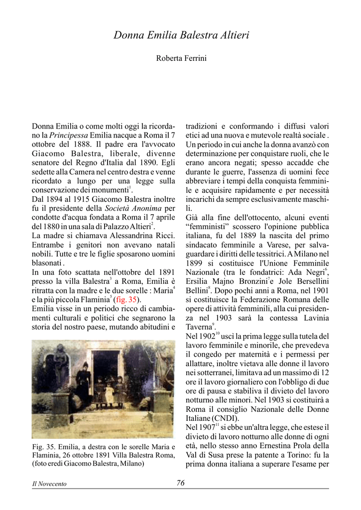 Donna Emilia Balestra Altieri Roberta Ferrini Donna Emilia o come molti oggi la ricordano la Principessa Emilia nacque a Roma il 7 ottobre del 1888. Il padre era l'avvocato Giacomo Balestra, liberale, divenne senatore del Regno d'Italia dal 1890. Egli sedette alla Camera nel centro destra e venne ricordato a lungo per una legge sulla 1 conservazione dei monumenti . Dal 1894 al 1915 Giacomo Balestra inoltre fu il presidente della Società Anonima per condotte d'acqua fondata a Roma il 7 aprile 2 del 1880 in una sala di Palazzo Altieri . La madre si chiamava Alessandrina Ricci. Entrambe i genitori non avevano natali nobili. Tutte e tre le figlie sposarono uomini blasonati . In una foto scattata nell'ottobre del 1891 3 presso la villa Balestra a Roma, Emilia è ritratta con la madre e le due sorelle : Maria4 e la più piccola Flaminia5 (fig. 35). Emilia visse in un periodo ricco di cambiamenti culturali e politici che segnarono la storia del nostro paese, mutando abitudini e tradizioni e conformando i diffusi valori etici ad una nuova e mutevole realtà sociale . Un periodo in cui anche la donna avanzò con determinazione per conquistare ruoli, che le erano ancora negati; spesso accadde che durante le guerre, l'assenza di uomini fece abbreviare i tempi della conquista femminile e acquisire rapidamente e per necessità incarichi da sempre esclusivamente maschili. Già alla fine dell'ottocento, alcuni eventi “femministi” scossero l'opinione pubblica italiana, fu del 1889 la nascita del primo sindacato femminile a Varese, per salvaguardare i diritti delle tessitrici. A Milano nel 1899 si costituisce l'Unione Femminile Nazionale (tra le fondatrici: Ada Negri6, Ersilia Majno Bronzini7e Jole Bersellini 8 Bellini . Dopo pochi anni a Roma, nel 1901 si costituisce la Federazione Romana delle opere di attività femminili, alla cui presidenza nel 1903 sarà la contessa Lavinia Taverna9. 10 Nel 1902 uscì la prima legge sulla tutela del lavoro femminile e minorile, che prevedeva il congedo per maternità e i permessi per allattare, inoltre vietava alle donne il lavoro nei sotterranei, limitava ad un massimo di 12 ore il lavoro giornaliero con l'obbligo di due ore di pausa e stabiliva il divieto del lavoro notturno alle minori. Nel 1903 si costituirà a Roma il consiglio Nazionale delle Donne Italiane (CNDI). Nel 190711 si ebbe un'altra legge, che estese il divieto di lavoro notturno alle donne di ogni età, nello stesso anno Ernestina Prola della Val di Susa prese la patente a Torino: fu la prima donna italiana a superare l'esame per Fig. 35. Emilia, a destra con le sorelle Maria e Flaminia, 26 ottobre 1891 Villa Balestra Roma, (foto eredi Giacomo Balestra, Milano) Il Novecento 76 patente di guida automobilistica. Molti nel novecento furono i movimenti, le federazioni e le associazioni femminili per promuovere l'indipendenza, affermare i propri diritti, difendere e rafforzare il proprio lavoro, al comando ideologico e amministrativi emergono colte signore appartenenti a famiglie nobili o a facoltose famiglie borghesi , che difendono e si fanno portavoci di donne economicamente meno fortunate di loro e con poca o assente istruzione. Molte furono le riforme e le leggi che dalla fine dell'ottocento, si susseguirono durante i vari governi e affrontarono il problema dell'analfabetismo e dell'istruzione scolastica. La “coscrizione scolastica” fu istituita per la prima volta nel 1859 e prevedeva l'obbligo almeno fino alla seconda classe, il corso era di quattro anni di studio, dando così gli elementi basilari per saper leggere e scrivere. In seguito nel 1877 col governo 12 della “ sinistra storica ” l'obbligo fu portato a 3 anni, inoltre il Ministro Coppino estese la durata della scuola elementare a 5 anni. Nel 1904 con il Ministro Orlando l'obbligo fu portato a cinque anni. Nel 1907 Maria Montessori, laureatasi in medicina13, tra le prime donne in Italia, aprì la prima “casa dei bambini” a Roma nel quartiere San Lorenzo, segnando una svolta nei sistemi di educazione dell'infanzia. La stessa Montessori fu presente in prima linea nelle lotte femministe. Non fu facile l'attuazione delle leggi per molte remore ideologiche che volevano mantenere un popolo ignorante non vedendo la necessità di estendere a spese dello Stato l'istruzione, le stesse riforme spesso non ebbero un riscontro reale, nonostante le nuove leggi scolastiche: nel 1923 il Ministro Gentile14 attuò l'obbligo di studi fino a 14 anni. Ma ancora si faceva distinzione tra istruzione femminile e maschile. Oltre al liceo classico e scientifico e l'istituto magistrale, c'era il liceo esclusivamente femminile “[...] per il fine di impartire un complemento di cultura generale alle Il Novecento giovinette che non aspirano né agli istituti superiori né al conseguimento di un diploma professionale15” . Bisognerà attendere gli anni novanta per arrivare al 100% di frequenza nella scuola dell'obbligo. Ancora negli anni sessanta solo due italiani su dieci superavano la scuola media, tanto da far comparire i nomi dei promossi sui giornali! 16 Fondamentale sarà la c. d. legge Sacchi che darà alle donne la capacità giuridica, ottenendo così il diritto ad amministrare i propri beni e ad esercitare le professioni, così dopo trentacinque anni dalla laurea (1884) Lidia Poët poté vestire la toga di avvocato! E non vi fu più la necessità di autorizzazione maritale per qualsiasi atto pubblico! Emilia conobbe la prima e la seconda guerra; nacque nel Regno d'Italia, vide la marcia su Roma nel 1922, visse durante il Ventennio fascista, assistette al crollo della dittatura il 25 luglio del 1943, seguì il sorgere della Repubblica durante la quale condusse gran parte della sua vita. Partecipò con il voto alla scelta referendaria. Il voto fu finalmente concesso alle donne per l'occasione del 2 giugno 194617. Le donne continuavano a prendere nuovi ruoli: nel 1945 la democristiana Angela 18 Cingolani diverrà deputata, nel 1948 de Gasperi la n