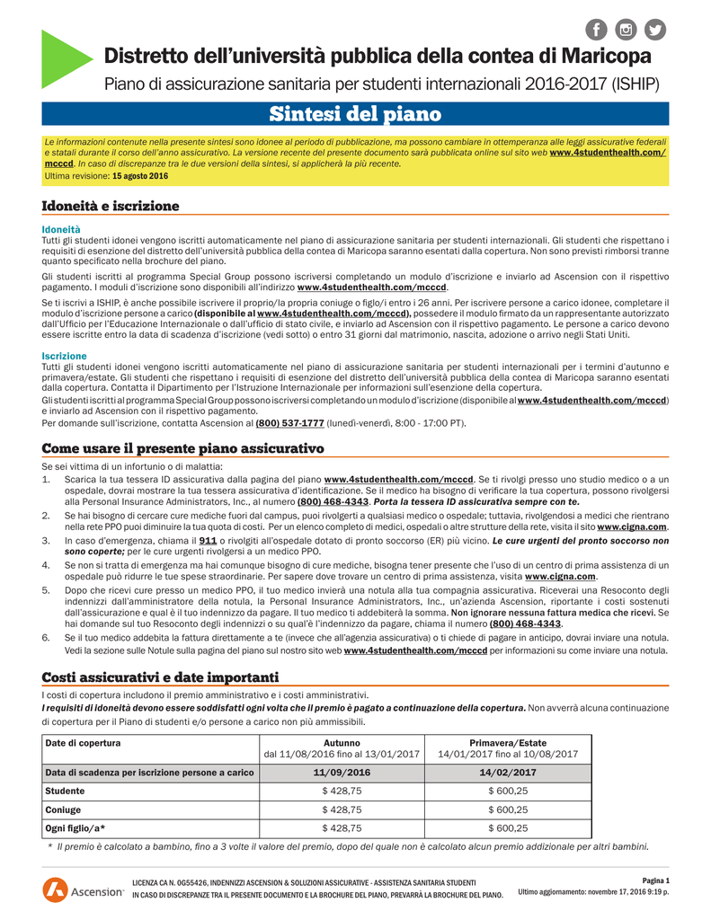 Distretto dell’università pubblica della contea di Maricopa Piano di assicurazione sanitaria per studenti internazionali 2016-2017 (ISHIP) Sintesi del piano Le informazioni contenute nella presente sintesi sono idonee al periodo di pubblicazione, ma possono cambiare in ottemperanza alle leggi assicurative federali e statali durante il corso dell’anno assicurativo. La versione recente del presente documento sarà pubblicata online sul sito web www.4studenthealth.com/ mcccd. In caso di discrepanze tra le due versioni della sintesi, si applicherà la più recente. Ultima revisione: 15 agosto 2016 Idoneità e iscrizione Idoneità Tutti gli studenti idonei vengono iscritti automaticamente nel piano di assicurazione sanitaria per studenti internazionali. Gli studenti che rispettano i requisiti di esenzione del distretto dell’università pubblica della contea di Maricopa saranno esentati dalla copertura. Non sono previsti rimborsi tranne quanto specificato nella brochure del piano. Gli studenti iscritti al programma Special Group possono iscriversi completando un modulo d’iscrizione e inviarlo ad Ascension con il rispettivo pagamento. I moduli d’iscrizione sono disponibili all’indirizzo www.4studenthealth.com/mcccd. Se ti iscrivi a ISHIP, è anche possibile iscrivere il proprio/la propria coniuge o figlo/i entro i 26 anni. Per iscrivere persone a carico idonee, completare il modulo d’iscrizione persone a carico (disponibile al www.4studenthealth.com/mcccd), possedere il modulo firmato da un rappresentante autorizzato dall’Ufficio per l’Educazione Internazionale o dall’ufficio di stato civile, e inviarlo ad Ascension con il rispettivo pagamento. Le persone a carico devono essere iscritte entro la data di scadenza d’iscrizione (vedi sotto) o entro 31 giorni dal matrimonio, nascita, adozione o arrivo negli Stati Uniti. Iscrizione Tutti gli studenti idonei vengono iscritti automaticamente nel piano di assicurazione sanitaria per studenti internazionali per i termini d’autunno e primavera/estate. Gli studenti che rispettano i requisiti di esenzione del distretto dell’università pubblica della contea di Maricopa saranno esentati dalla copertura. Contatta il Dipartimento per l’Istruzione Internazionale per informazioni sull’esenzione della copertura. Gli studenti iscritti al programma Special Group possono iscriversi completando un modulo d’iscrizione (disponibile al www.4studenthealth.com/mcccd) e inviarlo ad Ascension con il rispettivo pagamento. Per domande sull’iscrizione, contatta Ascension al (800) 537-1777 (lunedì-venerdì, 8:00 - 17:00 PT). Come usare il presente piano assicurativo Se sei vittima di un infortunio o di malattia: 1. Scarica la tua tessera ID assicurativa dalla pagina del piano www.4studenthealth.com/mcccd. Se ti rivolgi presso uno studio medico o a un ospedale, dovrai mostrare la tua tessera assicurativa d’identificazione. Se il medico ha bisogno di verificare la tua copertura, possono rivolgersi alla Personal Insurance Administrators, Inc., al numero (800) 468-4343. Porta la tessera ID assicurativa sempre con te. 2. Se hai bisogno di cercare cure mediche fuori dal campus, puoi rivolgerti a qualsiasi medico o ospedale; tuttavia, rivolgendosi a medici che rientrano nella rete PPO puoi diminuire la tua quota di costi. Per un elenco completo di medici, ospedali o altre strutture della rete, visita il sito www.cigna.com. 3. In caso d’emergenza, chiama il 911 o rivolgiti all’ospedale dotato di pronto soccorso (ER) più vicino. Le cure urgenti del pronto soccorso non sono coperte; per le cure urgenti rivolgersi a un medico PPO. 4. Se non si tratta di emergenza ma hai comunque bisogno di cure mediche, bisogna tener presente che l’uso di un centro di prima assistenza di un ospedale può ridurre le tue spese straordinarie. Per sapere dove trovare un centro di prima assistenza, visita www.cigna.com. 5. Dopo che ricevi cure presso un medico PPO, il tuo medico invierà una notula alla tua compagnia assicurativa. Riceverai una Resoconto degli indennizzi dall’amministratore della notula, la Personal Insurance Administrators, Inc., un’azienda Ascension, riportante i costi sostenuti dall’assicurazione e qual è il tuo indennizzo da pagare. Il tuo medico ti addebiterà la somma. Non ignorare nessuna fattura medica che ricevi. Se hai domande sul tuo Resoconto degli indennizzi o su qual’è l’indennizzo da pagare, chiama il numero (800) 468-4343. 6. Se il tuo medico addebita la fattura direttamente a te (invece che all’agenzia assicurativa) o ti chiede di pagare in anticipo, dovrai inviare una notula. Vedi la sezione sulle Notule sulla pagina del piano sul nostro sito web www.4studenthealth.com/mcccd per informazioni su come inviare una notula. Costi assicurativi e date importanti I costi di copertura includono il premio amministrativo e i costi amministrativi. I requisiti di idoneità devono essere soddisfatti ogni volta che il premio è pagato a continuazione della copertura. Non avverrà alcuna continuazione di copertura per il Piano di studenti e/o persone a carico non più ammissibili. Date di copertura Autunno dal 11/08/2016 fino al 13/01/2017 Primavera/Estate 14/01/2017 fino al 10/08/2017 11/09/2016 14/02/2017 Studente $ 428,75 $ 600,25 Coniuge $ 428,75 $ 600,25 Ogni figlio/a* $ 428,75 $ 600,25 Data di scadenza per iscrizione persone a carico * Il premio è calcolato a bambino, fino a 3 volte il valore del premio, dopo del quale non è calcolato alcun premio addizionale per altri bambini. LICENZA CA N. 0G55426, INDENNIZZI ASCENSION & SOLUZIONI ASSICURATIVE - ASSISTENZA SANITARIA STUDENTI IN CASO DI DISCREPANZE TRA IL PRESENTE DOCUMENTO E LA BROCHURE DEL PIANO, PREVARRÀ LA BROCHURE DEL PIANO. Pagina 1 Ultimo aggiornamento: novembre 17, 2016 9:19 p. DISTRETTO DELL’UNIVERSITÀ PUBBLICA DELLA CONTEA DI MARICOPA - PIANO DI ASSICURZIONE SANITARIA PER STUDENTI INTERNAZIONALI 2016-2017 (ISHIP) Sintesi del piano (continua) Dove e come riceve