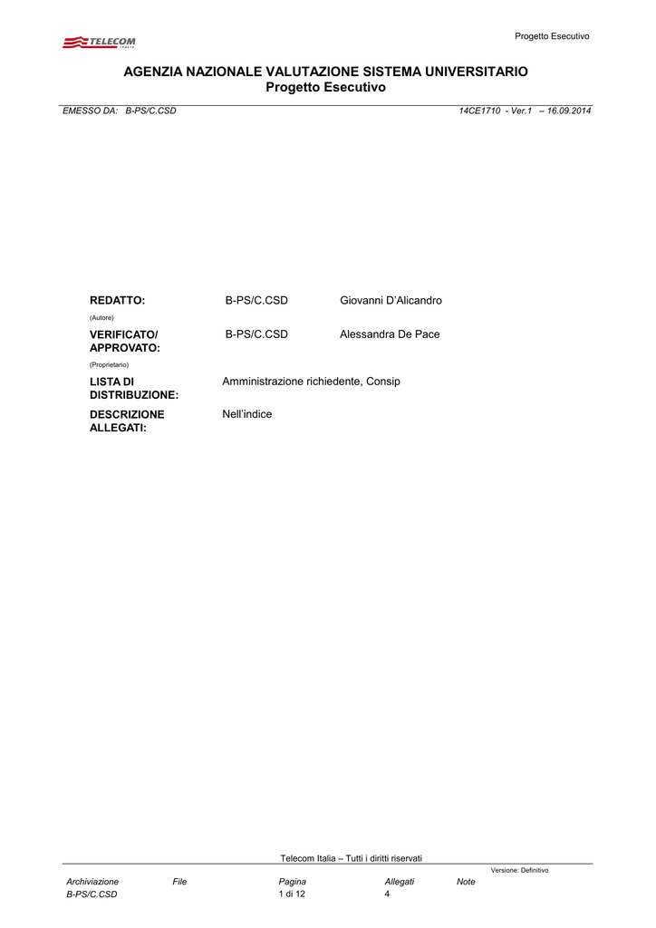 Progetto Esecutivo AGENZIA NAZIONALE VALUTAZIONE SISTEMA UNIVERSITARIO Progetto Esecutivo 14CE1710 - Ver.1 – 16.09.2014 EMESSO DA: B-PS/C.CSD REDATTO: B-PS/C.CSD Giovanni D’Alicandro B-PS/C.CSD Alessandra De Pace (Autore) VERIFICATO/ APPROVATO: (Proprietario) LISTA DI DISTRIBUZIONE: Amministrazione richiedente, Consip DESCRIZIONE ALLEGATI: Nell’indice Telecom Italia – Tutti i diritti riservati Versione: Definitivo Archiviazione B-PS/C.CSD File Pagina 1 di 12 Allegati 4 Note Progetto Esecutivo AGENZIA NAZIONALE VALUTAZIONE SISTEMA UNIVERSITARIO Progetto Esecutivo 14CE1710 - Ver.1 – 16.09.2014 EMESSO DA: B-PS/C.CSD INDICE 0 REGISTRAZIONE MODIFICHE DOCUMENTO .........................................................................................3 1 SERVIZIO DI ACCESSO IP DEDICATO BASATO SU ETHERNET ..........................................................4 1.1 SOMMARIO .............................................................................................................................................4 1.2 ARCHITETTURA DEI SERVIZI ETHERNET ..........................................................................................4 1.2.1 Accesso con Affidabilità Base ..........................................................................................................6 1.2.2 Servizi CPE .......................................................................................................................................6 1.3 SERVIZIO DI CONNETTIVITA’ INTERNET ............................................................................................8 2 QUALITÀ DEI SERVIZI DI CONNETTIVITÀ IP E VAS ............................................................................10 3 PIANO DI REALIZZAZIONE .....................................................................................................................11 4 VALORIZZAZIONE ...................................................................................................................................12 Telecom Italia – Tutti i diritti riservati Versione: Definitivo Archiviazione B-PS/C.CSD File Pagina 2 di 12 Allegati 4 Note Progetto Esecutivo AGENZIA NAZIONALE VALUTAZIONE SISTEMA UNIVERSITARIO Progetto Esecutivo 14CE1710 - Ver.1 – 16.09.2014 EMESSO DA: B-PS/C.CSD 0 REGISTRAZIONE MODIFICHE DOCUMENTO La tabella seguente riporta la registrazione delle modifiche apportate al documento. DESCRIZIONE MODIFICA Prima emissione VERSIONE DATA 1 16 Settembre 2014 Telecom Italia – Tutti i diritti riservati Versione: Definitivo Archiviazione B-PS/C.CSD File Pagina 3 di 12 Allegati 4 Note Progetto Esecutivo AGENZIA NAZIONALE VALUTAZIONE SISTEMA UNIVERSITARIO Progetto Esecutivo 14CE1710 - Ver.1 – 16.09.2014 EMESSO DA: B-PS/C.CSD 1 SERVIZIO DI ACCESSO IP DEDICATO BASATO SU ETHERNET 1.1 SOMMARIO Il presente documento costituisce il progetto esecutivo relativo alla richiesta di fornitura di servizi di connettività IP dedicata con servizi VAS per l’Amministrazione Agenzia Nazionale Valutazione Sistema Universitario, secondo quanto previsto dalla Convenzione Servizi di Telefonia e connettività IP, CONSIP Fonia 4. Il Cliente Comune di Chieti ha richiesto per la seguente Sede di: ANVUR – P.zza Ippolito Nievo, 35 – Roma - 00153 le seguenti risorse : 1 Accesso a Internet con Profilo B 8 e Banda Internet INT 11 in entrambe le direzioni up e down, Livello di Affidabilità e Finestra di Erogazione Base. : 1.2 ARCHITETTURA DEI SERVIZI ETHERNET Il servizio IP dedicato basato su accessi Ethernet è realizzato tramite collegamenti alle reti metropolitane di Telecom Italia e consente l’interconnessione alle VPN-IP delle singole Amministrazioni alla velocità nativa delle reti locali, tipicamente 10 o 100 Mbps fino a velocità dell’ordine di 1 Gbps. Verranno impiegate le reti metropolitane di Telecom Italia come infrastruttura di accesso a Larga Banda alla rete geografica IP/MPLS. E’ garantita l’interoperabilità con gli accessi IP dedicati basati su xDSL. I collegamenti tra le terminazioni di rete attestate presso le sedi delle singole Amministrazioni ed i POP del servizio, così come i collegamenti tra i POP metropolitani del servizio, saranno realizzati in fibra ottica e utilizzeranno il protocollo Gigabit Ethernet (Standard IEEE 802.3z). Dietro tali terminazioni di rete verranno attestati gli apparati CPE che implementano le funzionalità di livello 3. Rete IP/MPLS PE/RA Metro Metro (Root Bridge) MAN GBE Feeder VLAN attiva VLAN stand-by Terminazione GBE CPE Telecom Italia – Tutti i diritti riservati Versione: Definitivo Archiviazione B-PS/C.CSD File Pagina 4 di 12 Allegati 4 Note Progetto Esecutivo AGENZIA NAZIONALE VALUTAZIONE SISTEMA UNIVERSITARIO Progetto Esecutivo 14CE1710 - Ver.1 – 16.09.2014 EMESSO DA: B-PS/C.CSD Su ciascuna terminazione di rete GBE è possibile attivare un’interfaccia Ethernet 10/100BaseT/TX o Gigabit Ethernet verso la CPE presente nella sede dell’Amministrazione in cui la terminazione GBE viene alloggiata. In particolare, l’apparato di livello 2 (la terminazione GBE ) in sede cliente: È uno switch che termina la fibra su interfaccia Gigabit Ethernet e lavora in accordo allo standard IEEE 802.3 (802.3z nello specifico); a seconda dei modelli usati può attestare CPE su porte elettriche 10/100 BaseTX o 10/100/1000 BaseTX o ottiche. Gestisce diversi servizi diversificandoli su base porta/VLAN utilizzando sull’interfaccia GBE verso la rete la modalità trunk secondo il protocollo 802.1q; lato CPE le interfacce sono in modalità access, opzionalmente possono essere in modalità trunk 802.1q Tratta la QoS su base CoS in accordo al protocollo 802.1p e trasporta trasparentemente l’IP precedence del traffico proveniente dal CPE Lascia transitare il traffico multicast bloccandolo solo nel caso raggiunga una quota troppo elevata (una percentuale della velocità dell’interfaccia), tipicamente dovuta a misconfigurazioni o loop in rete. Lato sede del cliente il modello degli appa