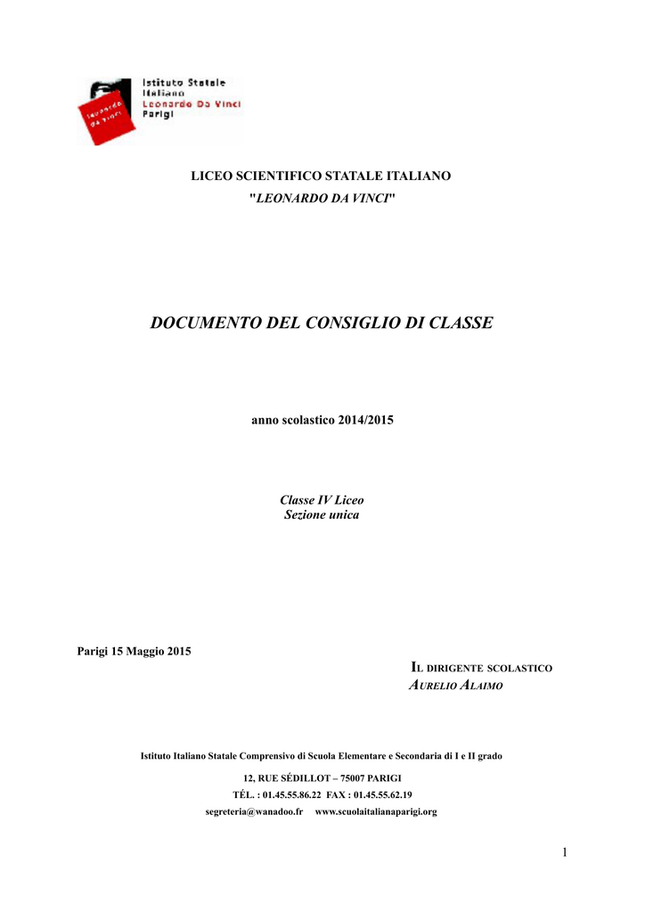 LICEO SCIENTIFICO STATALE ITALIANO "LEONARDO DA VINCI" DOCUMENTO DEL CONSIGLIO DI CLASSE anno scolastico 2014/2015 Classe IV Liceo Sezione unica Parigi 15 Maggio 2015 IL DIRIGENTE SCOLASTICO AURELIO ALAIMO Istituto Italiano Statale Comprensivo di Scuola Elementare e Secondaria di I e II grado 12, RUE SÉDILLOT – 75007 PARIGI TÉL. : 01.45.55.86.22 FAX : 01.45.55.62.19 [email protected] www.scuolaitalianaparigi.org 1 Indice 0 1-Profilo dell'Istituzione scolastica pag. 3 1 2-Alunni e docenti 2.1 Elenco dei docenti e continuità didattica 2.2 Elenco degli alunni pag. 5 pag. 5 pag. 6 2 3-Evoluzione della classe nel triennio 3.1Analisi della situazione 3.2 Attività complementari pag. 7 pag. 7 pag. 9 3 4-Finalità e obiettivi 4.1 Finalità 4.2Obiettivi pag. 10 pag. 10 pag. 10 4 5-Valutazione 5.1 Criteri di valutazione 5.2 Griglie di valutazione pag. 11 pag. 12 pag. 13 6-Relazioni e programmi: 6.1 Italiano 6.2 6.2 Latino 6.3 Inglese 6.4 Francese 6.5 Storia e Filosofia 6.6 Matematica 6.7 Fisica 6.8 Scienze 6.9 Disegno e Storia dell'arte 6.10 Eucazione Fisica pag. 21 pag. 22 7- ALLEGATI PER LA COMMISSIONE: pag.55 pag. 24 pag. 25 pag. 28 pag. 31 pag. 41 pag. 44 pag. 48 pag. 51 pag. 53 Simulazioni delle prove d'esame Documentazione riservata alla commissione (in riferimento all'art. 6 del DPR 323 del 23 luglio 1998 e alla l. 170 dell'8 ottobre 2010, comprese successive modifiche e integrazioni) 2 1 - PROFILO DELL'ISTITUZIONE SCOLASTICA Il Liceo Scientifico “Leonardo da Vinci” ad ordinamento quadriennale è parte dell’Istituto comprensivo di Scuola Elementare e Secondaria di I e II grado. L’utenza del Liceo è costituita da allievi di madre lingua italiana e in piccola parte di madre lingua francese, proveniente da esperienze scolastiche diverse: dalla nostra scuola media ed elementare, da scuole italiane metropolitane, da scuole italiane all’estero, da istituti francesi. Complessivamente i due ordini di scuola (primo e secondo grado) contano all’incirca 200 allievi; per oltre la metà gli alunni provengono da famiglie che non sono stabilmente residenti (Funzionari M.A.E., Organismi internazionali, Forze militari, Ditte private, Banche, ecc.) e per il resto da famiglie stabilmente residenti in Francia, italiane o miste. Trattandosi dell'unica scuola italiana secondaria di II grado presente sul territorio parigino, vi si iscrivono anche allievi provenienti da altri indirizzi: per questi alunni si evidenziano una predisposizione o motivazione non sempre adeguate ad affrontare un ordinamento di studi di carattere scientifico, che comporta la necessità di integrare in tempi brevi nuovi argomenti. In alcuni casi, la difficoltà di apprendere rapidamente una nuova lingua costituisce un ulteriore problema. Per tutti questi motivi l’approccio didattico deve risultare particolarmente flessibile, e deve essere in grado di personalizzare, per quanto possibile, il percorso di apprendimento, facendo leva sulle diverse risorse ed esperienze di ciascun alunno. Infatti bisogna far fronte alla necessità di equilibrare conoscenze e competenze, tenendo conto della grande mobilità degli alunni frequentanti, con arrivi e partenze tra un anno e l'altro, ma anche in ogni momento dell’anno scolastico. Queste difficoltà sono gestite nell’ottica di non penalizzare gli alunni più brillanti o coloro che hanno un iter più regolare. Anche a questo scopo, dall'a.s. 2012/2013, nell'ambito dell'autonomia didattica dell'Istituto, il Collegio dei docenti ha introdotto una modalità di insegnamento che, nel periodo compreso tra gennaio e aprile, prevede lo svolgimento di due ore settimanali di compresenza in classe di docenti di materie diverse. Lo svolgimento delle compresenze e l'offerta di attività formative ed educative aggiuntive (spettacoli teatrali, conferenze e visite a mostre e musei parigini) si sviluppano in stretto collegamento con gli altri progetti della scuola previsti dal Piano dell’Offerta Formativa. In particolare sono curati i collegamenti con le iniziative di accoglienza, 3 orientamento, integrazione e ascolto, e con gli interventi di recupero e di supporto allo studio in orario extracurricolare. Le finalità e gli obiettivi dell'indirizzo di studio, propri di un Liceo Scientifico, non differiscono da quelli di un analogo liceo operante in territorio metropolitano. L’ordinamento su quattro anni di corso fa sì che gli alunni candidati all’esame di stato che abbiano seguito un percorso regolare (che comporta un corso di studi più compresso e impegnativo, comprendente l’insegnamento di due lingue straniere) siano più giovani di un anno rispetto ai candidati di un liceo metropolitano ad ordinamento quinquennale. 4 2 – DOCENTI e ALUNNI 2.1 Elenco docenti Prof.ssa Elena Fumi Italiano e Latino Prof.ssa Barbara Vecchiato Inglese Prof.ssa Francesca Romana Rossi Francese Prof. Alessandro Busdon Storia e Filosofia Prof.ssa Franca Manciocco Matematica e Fisica Prof.ssa Daniela Iorio Scienze naturali Prof. Stefano Giannini Educazione fisica Prof.ssa Raffaella Cafarella Disegno e Storia dell'arte Prof. Domenico Rastelli Religione CONTINUITA' DIDATTICA DEL CORPO DOCENTE NEL TRIENNIO DISCIPLINE CLASSE SECONDA A Italiano Latino X CLASSE SECONDA B CLASSE TERZA CLASSE QUARTA X X X X X Inglese X Francese X Storia-Filosofia X X X X Matematica X X Fisica X X Scienze naturali X X X X Educazione fisica X X X X Dis. - Storia dell'arte X X X X Religione X X X X 5 2.2 Elenco alunni II III IV 1 Matteo Agnolet X X X 2 Théo Alunni X X X 3 Leonardo Borgioli X X X 4 Mélanie Ciotola 5 Rebecca Curti 6 Filippo Decise 7 Barbara De Silvestri 8 9 X X X X X X X X X Flavia Di Cesare X X X Claudio Fino X X X X X X X 10 Martina Fiorito 11 Clara Gangemi 12 Leonardo Gorbi X X X 13 Alexandre Guiha X X X 14 Federico Marini X X 15 Andrea Mazzella X X X 16 Elena Morelli X X X 17 Alessandro Ramini X X 18 Maria Sofia Tafuri X X 19 Guilhem Thierion X X 20 Giorgia Tidu 21 Viola Verrecchi X X X X X X X X 6 3- EVOLUZIONE DELL