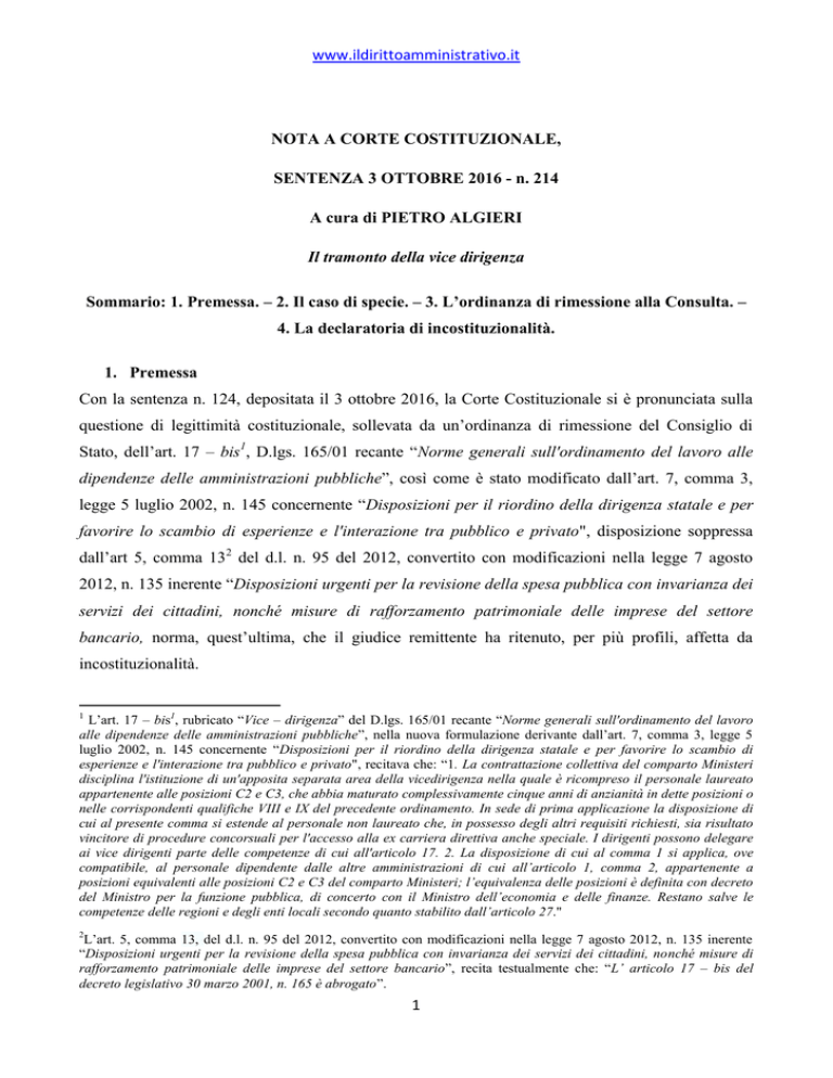 www.ildirittoamministrativo.it NOTA A CORTE COSTITUZIONALE, SENTENZA 3 OTTOBRE 2016 - n. 214 A cura di PIETRO ALGIERI Il tramonto della vice dirigenza Sommario: 1. Premessa. – 2. Il caso di specie. – 3. L’ordinanza di rimessione alla Consulta. – 4. La declaratoria di incostituzionalità. 1. Premessa Con la sentenza n. 124, depositata il 3 ottobre 2016, la Corte Costituzionale si è pronunciata sulla questione di legittimità costituzionale, sollevata da un’ordinanza di rimessione del Consiglio di Stato, dell’art. 17 – bis1, D.lgs. 165/01 recante “Norme generali sull'ordinamento del lavoro alle dipendenze delle amministrazioni pubbliche”, così come è stato modificato dall’art. 7, comma 3, legge 5 luglio 2002, n. 145 concernente “Disposizioni per il riordino della dirigenza statale e per favorire lo scambio di esperienze e l'interazione tra pubblico e privato", disposizione soppressa dall’art 5, comma 132 del d.l. n. 95 del 2012, convertito con modificazioni nella legge 7 agosto 2012, n. 135 inerente “Disposizioni urgenti per la revisione della spesa pubblica con invarianza dei servizi dei cittadini, nonché misure di rafforzamento patrimoniale delle imprese del settore bancario, norma, quest’ultima, che il giudice remittente ha ritenuto, per più profili, affetta da incostituzionalità. 1 L’art. 17 – bis1, rubricato “Vice – dirigenza” del D.lgs. 165/01 recante “Norme generali sull'ordinamento del lavoro alle dipendenze delle amministrazioni pubbliche”, nella nuova formulazione derivante dall’art. 7, comma 3, legge 5 luglio 2002, n. 145 concernente “Disposizioni per il riordino della dirigenza statale e per favorire lo scambio di esperienze e l'interazione tra pubblico e privato", recitava che: “1. La contrattazione collettiva del comparto Ministeri disciplina l'istituzione di un'apposita separata area della vicedirigenza nella quale è ricompreso il personale laureato appartenente alle posizioni C2 e C3, che abbia maturato complessivamente cinque anni di anzianità in dette posizioni o nelle corrispondenti qualifiche VIII e IX del precedente ordinamento. In sede di prima applicazione la disposizione di cui al presente comma si estende al personale non laureato che, in possesso degli altri requisiti richiesti, sia risultato vincitore di procedure concorsuali per l'accesso alla ex carriera direttiva anche speciale. I dirigenti possono delegare ai vice dirigenti parte delle competenze di cui all'articolo 17. 2. La disposizione di cui al comma 1 si applica, ove compatibile, al personale dipendente dalle altre amministrazioni di cui all’articolo 1, comma 2, appartenente a posizioni equivalenti alle posizioni C2 e C3 del comparto Ministeri; l’equivalenza delle posizioni è definita con decreto del Ministro per la funzione pubblica, di concerto con il Ministro dell’economia e delle finanze. Restano salve le competenze delle regioni e degli enti locali secondo quanto stabilito dall’articolo 27." 2 L’art. 5, comma 13, del d.l. n. 95 del 2012, convertito con modificazioni nella legge 7 agosto 2012, n. 135 inerente “Disposizioni urgenti per la revisione della spesa pubblica con invarianza dei servizi dei cittadini, nonché misure di rafforzamento patrimoniale delle imprese del settore bancario”, recita testualmente che: “L’ articolo 17 – bis del decreto legislativo 30 marzo 2001, n. 165 è abrogato”. 1 www.ildirittoamministrativo.it Con la riforma della dirigenza pubblica attuata con la legge n. 145 cit., viene introdotta l’area separata della vice - dirigenza che modifica sostanzialmente la struttura del pubblico impiego, caratterizzata sulla contrapposizione tra dirigenti e degli altri dipendenti affidati ad un sistema uniforme di contrattazione collettiva. L’introduzione del termine “separata” per l'area della vice dirigenza rappresenta la volontà del legislatore di non ricomprendere questa categoria nel contratto di comparto, bensì in una contrattazione specifica, in quanto il personale direttivo espleta compiti più vicini a quelli del dirigente piuttosto che a quelli degli impiegati. Nelle intenzioni del legislatore, quindi, questa nuova figura operativa, non costituisce un’area funzionale interna al contratto del personale pubblico, bensì un'area contrattuale a sé stante, completamente autonoma oppure inserita, a budget separato, nell'area della dirigenza3. Tuttavia, è stato sin da subito osservato che la creazione di questa nuova categoria professionale per divenire effettivo centro di imputazione di interessi professionali e, inoltre, per trovare un reale seguito deve necessariamente misurarsi con la contrattazione collettiva che nel settore del pubblico impiego riveste un ruolo normativo primario. Infatti, il Testo Unico sul Pubblico Impiego, non disconosce la creazione di un’area a professionalità medio – alte prevedendo, all’uopo, un autonomo spazio contrattuale seppure nell’ambito della contrattazione collettiva e la costituzione di specifici collegi elettorali4. In siffatto contesto normativo, la legge 15 luglio 2002 (riordino della dirigenza) attuarsi equipara le categorie professionali corrispondenti a C-2 e C-3. Il nodo maggiore è dato dagli enti locali. In quest’ambito il tema delle categorie professionali medio – alte riveste un ruolo strategico in quanto 3 Il sistema del pubblico impiego caratterizzato dalla “summa divisio” tra dirigenti e dipendenti, affidati ad un sistema uniforme di contrattazione collettiva, caratterizzato dall’immutabilità – cristallizzazione – dei soggetti agenti, ha dato il via ad una serie di azioni giudiziali che lungi dal delineare un quadro esegetico uniforme. In tale contesto asta leggere la sentenza n. 4399 del 7 marzo 2008 del Tribunale di Roma, nella quale veniva riconosciuto a 82 funzionari del Ministero dei beni culturali e ambientali la qualifica di vice dirigente. Nel medesimo solco si pone la sentenza 17 luglio 2009, n. 12847 del Tri