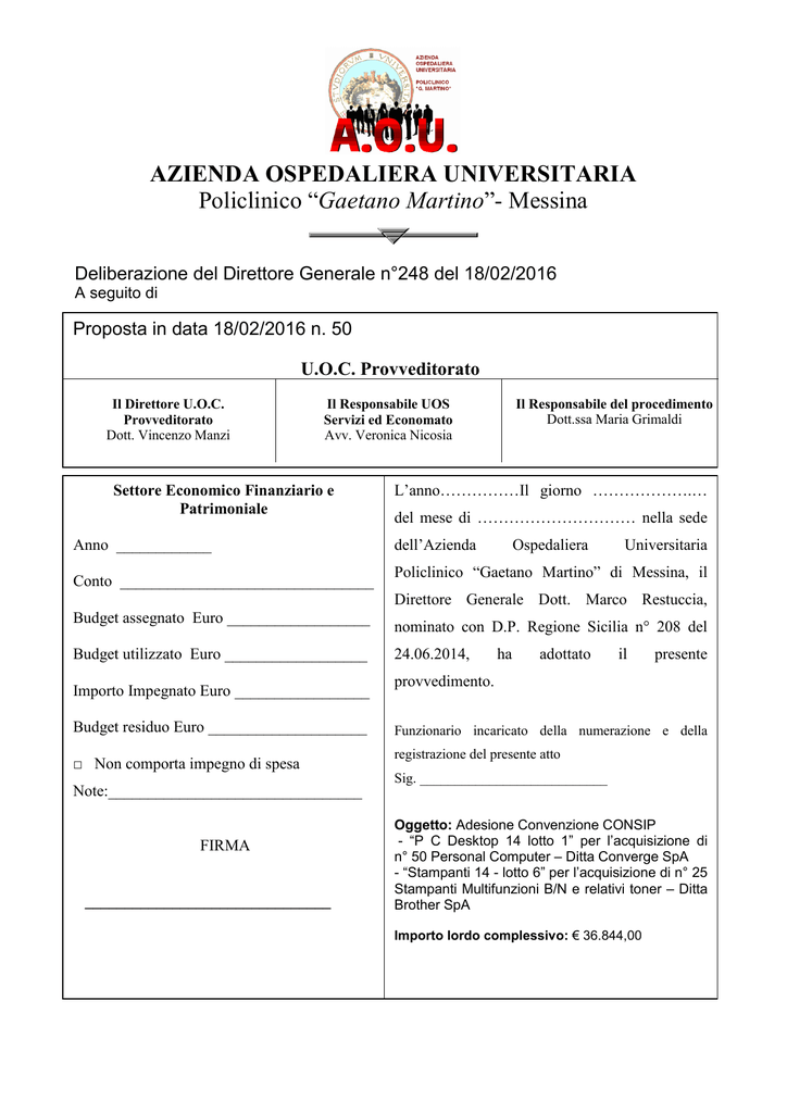 AZIENDA OSPEDALIERA UNIVERSITARIA Policlinico “Gaetano Martino”- Messina Deliberazione del Direttore Generale n°248 del 18/02/2016 A seguito di Proposta in data 18/02/2016 n. 50 U.O.C. Provveditorato Il Direttore U.O.C. Provveditorato Dott. Vincenzo Manzi Il Responsabile UOS Servizi ed Economato Avv. Veronica Nicosia Settore Economico Finanziario e Patrimoniale Anno ____________ Conto ________________________________ Il Responsabile del procedimento Dott.ssa Maria Grimaldi L’anno……………Il giorno ……………….… del mese di ………………………… nella sede dell’Azienda Ospedaliera Universitaria Policlinico “Gaetano Martino” di Messina, il Direttore Generale Dott. Marco Restuccia, Budget assegnato Euro __________________ Budget utilizzato Euro __________________ Importo Impegnato Euro _________________ Budget residuo Euro ____________________ □ Non comporta impegno di spesa Note:________________________________ FIRMA _______________________________ nominato con D.P. Regione Sicilia n° 208 del 24.06.2014, ha adottato il presente provvedimento. Funzionario incaricato della numerazione e della registrazione del presente atto Sig. ___________________________ Oggetto: Adesione Convenzione CONSIP - “P C Desktop 14 lotto 1” per l’acquisizione di n° 50 Personal Computer – Ditta Converge SpA - “Stampanti 14 - lotto 6” per l’acquisizione di n° 25 Stampanti Multifunzioni B/N e relativi toner – Ditta Brother SpA Importo lordo complessivo: € 36.844,00 IL DIRETTORE GENERALE PREMESSO che: - sono pervenute all’U.O.C. Provveditorato numerose istanze per l’acquisto di Personal Computer, completi di monitor e stampanti con funzioni multiple, per cui la detta destinataria ha ritenuto opportuno investire per competenza anche l’U.O.S. ICT ed Innovazioni Aziendali, anche al fine di verificare sia le condizioni tecniche da porre in relativa gara sia la congruità degli acquisti posti rispetto alle strategie aziendali; - in tal senso, con PEC del 18/1/2016, il Responsabile dell’U.O.S. ICT ed Innovazioni Aziendali ha comunicato che, nella considerazione della congruità della richiesta da ricondurre tuttavia a 50 PC completi di monitor e 25 multifunzioni nonché delle particolari necessità riferite a determinate aree critiche sanitarie (pronto soccorso, laboratorio analisi, trasfusionale, ticket e CUP), il nulla osta all’approvvigionamento nei termini di cui sopra; - con successiva PEC del 4/02/2016 di conseguenza la stessa U.O.S. ICT ed Innovazioni Aziendali ha richiamato le convenzioni attive CONSIP cui poter aderire per l’esigenza posta (Allegato A); RITENUTO necessario disporre l’adesione alle seguenti convenzioni CONSIP, qui d’interesse: - “PC desktop 14 - lotto 1” per la fornitura dalla ditta CONVERGE di n° 50 Personal Computers Lenovo D14L1-W764, al costo netto unitario di € 339,00, completa di n° 50 monitor Hannspree D14L1-THT21, al costo netto unitario di € 99,00 (scadenza della convenzione 19/4/2016) ; - “Stampante 14 - lotto 6” per l’acquisto dalla ditta Fujitsu Tecnology Solutions di n° 25 stampanti multifunzioni Brother MFC-8950DW CSP, al costo netto unitario di € 218,00, e di n° 50 toner Brother TN-3390 da 1200 pagine, al costo netto unitario di € 57,00; QUANTIFICATO l’importo netto complessivo per soddisfare le richieste di cui sopra in € 30.200,00, pari alla spesa lorda complessiva di € 36.844,00; VISTI: - l’art. 26 della legge n.488, del 23/12/1999 che dispone l’obbligo per le pubbliche amministrazioni di provvedere agli acquisti tramite adesione a convenzione CONSIP; - l'art. 1, comma 499, della legge 296/2006, per come modificato dalla legge 94/2012; - il D.A. n°01283 del 3 luglio 2013, con il quale è stato approvato il regolamento-tipo che disciplina i procedimenti di acquisizione in economia di beni e servizi da parte delle Aziende Sanitarie della Regione, recepito con D.D.G. n°701 del 17.07.2013, ed in particolare l’art. 3, comma 8, che prevede il ricorso alle Convenzioni stipulate da CONSIP S.p.A.; SU PROPOSTA del Direttore dell’U.O.C. Provveditorato, che con la sottoscrizione del presente schema assume la responsabilità della regolarità delle procedure; PRESO ATTO che il Direttore dell’U.O.C. Economico, Finanziario e Patrimoniale ha accertato la disponibilità finanziaria sul competente conto economico che viene confermata con la sottoscrizione del presente atto; ACQUISITO il parere favorevole del Direttore Amministrativo e del Direttore Sanitario che viene espresso con la sottoscrizione del presente atto; DELIBERA per i motivi espressi in premessa, che qui si intendono per intero riportati: Art. 1 – di aderire alle Convenzioni CONSIP: - “PC desktop 14 - lotto 1” per l’acquisto dalla ditta CONVERGE di n° 50 Personal Computers Lenovo D14L1-W764, al costo netto unitario di € 339,00, e di n° 50 monitor Hannspree D14L1-THT21, al costo netto unitario di € 99,00; - “Stampante 14 - lotto 6” per l’acquisto dalla ditta Fujitsu Tecnology Solutions di n° 25 stampanti multifunzioni Brother MFC-8950DW CSP, al costo netto unitario di € 218,00, e di n° 50 toner Brother TN-3390 da 1200 pagine, al costo netto unitario di € 57,00; Art. 2 – di autorizzare l’importo netto complessivo di € 30.200,00 pari ad una spesa lorda complessiva di € 36.844,00, che graverà sul Bilancio dell’anno in corso, conto economico (291) 5.01.02.01.04 - Supporti informatici e cancelleria, di questa Azienda Ospedaliera; Art. 3 – di autorizzare il pagamento della relativa fattura, previo accertamento di regolarità degli adempimenti consequenziali dovuti, da effettuarsi a cura dei preposti al controllo ed alla verifica, nel rispetto delle modalità e tempi stabiliti nella Convenzione CONSIP; Art. 4 – di nominare il Sig. Umberto Timboli dell’U.O.S. ICT ed Innovazione aziendale quale collaudatore dei beni informatici oggetto della fornitura, tenuto altresì alla corretta distri