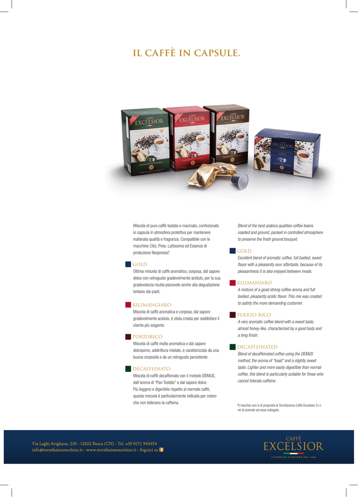 il caffè in capsule. Miscela di puro caffè tostato e macinato, confezionato in capsula in atmosfera protettiva per mantenere inalterata qualità e fragranza. Compatibile con le macchine Citiz, Pixie, Lattissima ed Essenza di produzione Nespresso*. GOLD Ottima miscela di caffè aromatico, corposa, dal sapore dolce con retrogusto gradevolmente acidulo, per la sua gradevolezza risulta piacevole anche alla degustazione lontano dai pasti. KILIMANGIARO Miscela di caffè aromatica e corposa, dal sapore gradevolmente acidulo, è stata creata per soddisfare il cliente più esigente. PORTORICO Miscela di caffè molto aromatica e dal sapore dolcissimo, addirittura mielato, è caratterizzata da una buona corposità e da un retrogusto persistente. DECAFFEINATO Miscela di caffè decaffeinato con il metodo DEMUS, dall’aroma di “Pan Tostato” e dal sapore dolce. Più leggero e digeribile rispetto al normale caffè, questa miscela è particolarmente indicata per coloro che non tollerano la caffeina. Via Laghi Avigliana, 210 - 12022 Busca (CN) - Tel. +39 0171 944454 info @ torrefazionexcelsior.it - www.torrefazionexcelsior.it - Seguici su Blend of the best arabica qualities coffee beans roasted and ground; packed in controlled atmosphere to preserve the fresh ground bouquet. GOLD Excellent blend of aromatic coffee, full bodied, sweet flavor with a pleasantly sour aftertaste, because of its pleasantness it is also enjoyed between meals. KILIMANjARO A misture of a good strong coffee aroma and full bodied, pleasantly acidic flavor. This mix was created to satisfy the more demanding customer. Puerto RICO A very aromatic coffee blend with a sweet taste, almost honey-like, characterized by a good body and a long finish. DECAFFEinated Blend of decaffeinated coffee using the DEMUS method, the aroma of “toast” and a slighlty sweet taste. Lighter and more easily digestible than normal coffee, this blend is particularly suitable for those who cannot tolerate caffeine. *Il marchio non è di proprietà di Torrefazione Caffè Excelsior S.r.l. nè di aziende ad essa collegate. il caffè in capsule. Tempo ottimale di conservazione Best before end Cod. EAN Art. BOX DISPENSER 25 CAPSULE DISPENSER 10 CAPSULE 24 mesi 24 mesi 24 mesi 8019133000308 8019133000322 8019133000339 8019133000315 GOLD KILIMANGIARO PORTORICO DECAFFEINATO Nr. pezzi per pack Nr. of pieces per pack Nr. Pack per pallet Nr. of pack per pallet Nr. strati per pallet Nr. of layers per pallet 100 / 12 144 528 98 12 22 7 DIMENSIONI PRODOTTO PRODUCT DIMENSIONS LXPXH DIMENSIONI PACK PACK DIMENSIONS LXPXH DIMENSIONI PALLET PALLET DIMENSIONS LXPXH PESO LORDO PALLET PALLET GROSS WEIGHT / 26 X 29 X 19 cm 80 X 120 X 250 cm 200 Kg DISPENSER 25 20 X 20 X 10 cm / 80 X 120 X 240 cm 185 Kg DISPENSER 10 9,5 X 10,5 X 16 cm 38 X 32 X 16 cm 80 X 120 X 240 cm 175 Kg BOX 100 Via Laghi Avigliana, 210 - 12022 Busca (CN) - Tel. +39 0171 944454 info @ torrefazionexcelsior.it - www.torrefazionexcelsior.it - Seguici su