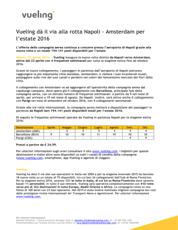 Vueling dà il via alla rotta Napoli - Amsterdam per l’estate 2016 L’offerta della compagnia aerea continua a crescere presso l’aeroporto di Napoli grazie alla nuova rotta e un totale 194.141 posti disponibili per l’estate Milano, 21 aprile 2016. – Vueling inaugura la nuova rotta diretta da Napoli verso Amsterdam, attiva dal 23 aprile con 4 frequenze settimanali per tutta la stagione estiva fino ad ottobre 2016. Grazie al nuovo collegamento, i passeggeri in partenza dall’aeroporto di Napoli potranno raggiungere la più importante città olandese, Amsterdam, e visitare i suoi incantevoli musei, passeggiare sulle rive dei suoi canali e perdersi nei colori del famosissimo mercato dei fiori della città. Il collegamento con Amsterdam va ad aggiungersi all’operatività della compagnia aerea dal capoluogo campano, dove opera già il collegamento con Barcellona, principale hub della compagnia aerea, con un elevato numero di frequenze settimanali: a partire da 9 nel mese di aprile, per arrivare a 19 nel mese di agosto. Da Napoli, inoltre, sarà attivo anche il collegamento con Parigi nei mesi di settembre ed ottobre 2016, con 4 collegamenti settimanali. Grazie alle tre rotte internazionali, la compagnia aerea metterà a disposizione dei passeggeri in partenza da Napoli ben 194.141 posti disponibili totali per l’estate 2016. Di seguito le frequenze settimanali operate da Vueling in partenza Napoli per la stagione estiva 2016: Destinazione Amsterdam (AMS) Barcellona (BCN) Parigi (CDG) Aprile 9 - Maggio 4 10 - Giugno 4 10 - Luglio 4 11 - Agosto 4 19 - Sett. 4 10 4 Ott. 4 10 4 Prezzi a partire da € 24,99. Per ulteriori informazioni sugli orari consultare il sito www.vueling.com. I biglietti per queste destinazioni e molte altre sono disponibili su tutti i canali di vendita della compagnia (www.vueling.com, smartphone, app Vueling e agenzie di viaggio). Vueling Vueling ha dato il via alle sue operazioni in Italia nel 2004 e per la stagione invernale 2015 ha lanciato 18 nuove rotte su un totale di 75 disponibili, tra cui ben 34 collegamenti dall’hub di Roma Fiumicino. Per la stagione estiva 2016, saranno 121 le rotte in Italia, di cui 64 su Roma-Fiumicino dove saranno basati 11 aeromobili. In tutto il suo network, Vueling sarà operativa complessivamente con 410 rotte verso più di 162 destinazioni in tutta Europa, Medio Oriente e Africa. La compagnia conta su una flotta di 100 aerei con 23 basi operative. Nel 2015 è stata inoltre nominata migliore compagnia low cost dalle prestigiose riviste internazionali Air Transport News e Agenttravel. Per ulteriori informazioni www.vueling.com. Per ulteriori informazioni: Daniela Chirabino - Communications Manager Italy; E: [email protected]; M: +39 380 758 1442 FleishmanHillard per Vueling Airlines Luca De Pietro; E: [email protected]; M: +39 02 31804709