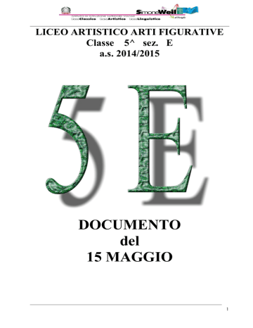 LICEO ARTISTICO ARTI FIGURATIVE Classe 5^ sez. E a.s. 2014/2015 DOCUMENTO del 15 MAGGIO 1 SOMMARIO: 1. PRESENTAZIONE della CLASSE Composizione della classe 5 Organigramma docenti del triennio 6 Risultati del terzo e del quarto anno 7 Esiti scolastici della classe terza e quarta Scrutinio finale Materie con sospensione di giudizio terzo anno e quarto anno Materie con sospensione di giudizio della classe terza Materie con sospensione del giudizio della classe quarta Attività complementari e integrative 8 2. OBIETTIVI, METODI, CONTENUTI, MEZZI, SPAZI, VALUTAZIONE, RISULTATI 9 Obiettivi Obiettivi generali dell’indirizzo artistico Obiettivi cognitivi generali (programmati dal Consiglio di Classe) Obiettivi specifici delle singole aree disciplinari – Raggruppamento delle discipline per aree(anche ai fini della valutazione) – Area umanistica (Italiano, Storia, Lingua e letteratura inglese, Storia dell’arte, Filosofia) – Area tecnico-scientifica e Area psicomotoria (Matematica, Fisica., Disc. Pittoriche, Disc. Plast/Scult., Lab. Fig. Pittorica, Lab. Fig. Scultorea., Scienze motorie e sportive) Metodi 12 Metodologia applicata nell’interazione docenti-studenti Contenuti disciplinari 13 Percorsi didattici pluridisciplinari che i candidati intendono presentare al colloquio Mezzi e spazi 14 2 14 Valutazione Tipologie di prove adottate per la verifica – Tabella di corrispondenza tra livelli di voto ed obiettivi raggiunti espressi in 15° 15 Criteri per la misurazione e la valutazione della Prima prova scritta (Italiano) 16 Analisi del testo Saggio breve/Articolo di giornale Tema storico / di argomento generale – Criteri per la la misurazione e valutazione della Seconda prova scritta 19 – Criteri per la misurazione e la valutazione della Terza prova scritta (Pluridisciplinare) 20 – Scheda di valutazione per il colloquio 21 3. SIMULAZIONI delle PROVE d’ESAME Riepilogo delle simulazioni effettuate 22 - Prima simulazione della terza prova - Seconda simulazione della terza prova - Simulazioni della seconda prova - Simulazione Prima Prova Tracce delle simulazioni effettuate 23 3 4. CONTENUTI SVOLTI nelle SINGOLE DISCIPLINE Italiano 31 Storia 33 Lingua e Cultura Inglese 34 Storia dell’Arte 36 Filosofia 37 Matematica 39 Fisica 40 Discipline Pittoriche 41 Discipline Plast/Scult. 42 Laboratorio Fig. Pittorica 43 Laboratorio Fig, Scultorea 44 Scienze Motorie e Sportive 45 Religione Cattolica 46 1. CONSIGLIO di CLASSE Composizione del consiglio di classe 47 4 1. PRESENTAZIONE della CLASSE Profilo La classe 5^ E è composta da 15 alunne e 9 alunni, tutti provenienti dalla classe 4^ E. Per quanto riguarda il profitto non appare omogenea. Vi si possono riconoscere tre gruppi: un primo gruppo ha sempre ottenuto valutazioni buone o ottime, un secondo gruppo ha generalmente raggiunto risultati pienamente sufficienti, il terzo gruppo ha dovuto invece colmare lacune in varie discipline. Tutti gli alunni hanno comunque raggiunto obiettivi conformi alle loro inclinazioni e attitudini. Per quanto riguarda gli alunni con bisogni educativi speciali, al presente documento si allega plico riservato contenente: - documentazione di alunno certificato ai sensi della Legge 104/1992; - documentazione di alunno certificato ai sensi della Legge 170/2010. Composizione della classe: 1) Bellebono Samuele 2) Belloli Davide 3) Bevilacqua Luca 4) Bommarito Giulia M. 5) Boragina Riccardo 6) Bresciani Valeria 7) Capace Chiara 8) Cereda Sara 9) Cervi Martina 10) Costariol Claudia 11) Di Grandi Daniele 12) Di Tommasi Rachele M. 13) Dognini Davide K. 14) Esposti William 15) Fagnani Greta 16) Lattanzio Denise M. 17) Maffioletti Elisabetta 18) Moriggi Mattia 19) Moro Mirella 20) Pesssani Sara 21) Recanati Virginia 22) Rinaldi Tabita 23) Salini Diego 24) Schillaci Giulia N° complessivo degli iscritti: 24 N° iscritti provenienti dalla precedente classe 4E : 24 N° iscritti provenienti da altri indirizzi o istituti: 0 N° ritirati: 0 5 Organigramma docenti del triennio MATERIA Italiano - Storia A.s. 2012/13 A.s. 2013/14 A.s. 2014/15 Messa Messa Messa Romano Romano Romano Discipline Pittoriche Iovino Iovino Cantamessa Laboratorio Pittorico Reffo Picozzi Iovino Discipline Plastico Scultoree Ciuffetta Ciuffetta Ciuffetta Laboratorio Figur. Scult Ciuffetta Ciuffetta Mauri Fisica Fiumanò Fiumanò Fiumanò Matematica Fiumanò Fiumanò Fiumanò Filosofia Spatari Spatari Spatari Chimica D’Amico Saracino Storia dell’Arte Possenti Possenti Possenti Scienze motorie e sportive Cirillo Cirillo Cirillo Religione Vitale Agliuzza Agliuzza Sostegno Giuliano Scotto Zigatti Lingua e cultura inglese 6 Risultati del terzo e del quarto anno 1) esiti scolastici della classe terza e quarta a) scrutinio finale PROMOSSI Classe terza N° alunni 13 Classe quarta N° alunni 15 PROMOSSI CON SOSPENSIONE DI GIUDIZIO NON PROMOSSI N° alunni 10 N° alunni 3 (Giugno) NON SCRUTINATI N° alunni N° alunni 9 N° alunni N° alunni N° alunni 2 b) MATERIE CON SOSPENSIONE DI GIUDIZIO MATERIA Fisica N° sospensioni Terzo anno N° alunni 5 Inglese N° alunni 7 MATERIA N° sospensioni Quarto anno Italiano N° alunni 3 Matematica N° alunni 5 Matematica N° alunni 10 Chimica N° alunni 4 Italiano N° alunni 4 Chimica N° alunni 5 Storia dell’ arte N° alunni 1 Fisica N° alunni 1 Discipline Pittoriche N° alunni 1 Discipline Plastiche N° alunni 1 Storia N° alunni 2 Filosofia N° alunni 1 2) Risultati della sospensione di giudizio classe terza alunni che HANNO superato l’esame a settembre N° ALUNNI 5 7 10 4 4 MATERIA Fisica Inglese Matematica Chimica Italiano 1 1 1 2 1 Storia dell’ arte Discipline Pittoriche Discipline Plastiche Storia Filosofia alunni che NON HANNO superato l’esame a settembre N° ALUNNI MATERIA 3) Risultati della sospensione di giudizio classe quarta alunni che HANNO superato l’esame a settembre N° ALUNNI 3 5 5 1 MATERIA Italiano Matematica Chimica Fisica alunni che NON HANNO superato l’esame a settembre N° ALUNNI MATERIA 7 Atti