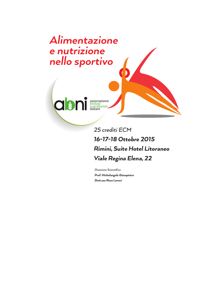 Alimentazione e nutrizione nello sportivo associazione biologi nutrizionisti italiani 25 crediti ECM 16-17-18 Ottobre 2015 Rimini, Suite Hotel Litoraneo Viale Regina Elena, 22 Direzione Scientifica Prof. Michelangelo Giampietro Dott.ssa Rosa Lenoci associazione biologi nutrizionisti italiani Programma Venerdì 16 Ottobre 2015 Sabato 17 Ottobre 2015 Domenica 18 Ottobre 2015 13,30 – 14,00 registrazione iscritti 14,00 – 16,30 8,30 – 11,00 8,30 – 11,00 Composizione corporea e valutazione dello stato di idratazione. Prove pratiche Dott. Matteo Levi Micheli Dottore in Scienze e Tecnica dello Sport Indicazioni nutrizionali nello sportivo vegetariano Dott.ssa Erminia Ebner Biologa Nutrizionista 11,00 – 11,15 Coffee-break 11,15 - 13,15 Classificazione delle discipline sportive Protocollo di valutazione nutrizionale per gli sportivi Prof. Michelangelo Giampietro Specialista in Medicina dello Sport e Scienza dell’Alimentazione 16,30 - 16,45 Coffee-break 16,45 - 18,45 Valutazione del bilancio energetico nello sportivo Prof. Nino Carlo Battistini Università di Modena e Reggio Emilia 11,15 – 13,15 Mode alimentari e sport. La razione alimentare per lo sportivo. La preparazione nutrizionale dell’evento gara. Prof. Michelangelo Giampietro Specialista in Medicina dello Sport e Scienza dell’Alimentazione 18,45 - 19,45 Termoregolazione e idratazione nell’esercizio fisico. Prof. Michelangelo Giampietro Specialista in Medicina dello Sport e Scienza dell’Alimentazione 13,15 – 14,00 Pausa pranzo 14,00 – 16,00 Elaborazione di diete per gli sportivi: discussione di casi clinici e lavori di gruppo Dott.ssa Erminia Ebner Biologa Nutrizionista 16,00 - 16,15 Coffee-break 16,15 - 18,15 Integratori per lo sport Dott. Danilo Gambarara Specialista in Medicina dello Sport 18,15 – 19,45 Elaborazione di diete per gli sportivi: discussione di casi clinici e lavori di gruppo Dott.ssa Erminia Ebner Biologa Nutrizionista 11,00 – 11,15 Coffee-break Elaborazione di diete per gli sportivi: discussione di casi clinici Prof. Michelangelo Giampietro Specialista in Medicina dello Sport e Scienza dell’Alimentazione Dott.ssa Erminia Ebner Biologa Nutrizionista 13,15 – 14,00 Compilazione questionari associazione biologi nutrizionisti italiani Info FREQUENZA E COSTI MODALITÀ DI ISCRIZIONE AL CORSO II corso è a numero chiuso. E’ prevista l’assegnazione, previa richiesta, dei crediti ECM per Biologi e Medici. I richiedenti i crediti ECM sono tenuti alla frequenza del 100% delle ore di lezione Per iscriversi al Corso occorre compilare ed inviare il modulo online presente sul sito www.abni.it Contestualmente effettuare il pagamento della quota di iscrizione con bonifico specificando nella causale “Alimentazione sportivo” CODICE IBAN IT70 X076 0104 0000 0002 4467 854 Il costo del corso per le iscrizioni pervenute entro il 30 settembre è fissato in: SENZA CREDITI ECM Soci ABNI Euro 250 l’ Iva non è dovuta dai soci Non-Soci ABNI Euro 330 iva compresa Il costo del corso per le iscrizioni pervenute dopo il 30 settembre è fissato in: SENZA CREDITI ECM Soci ABNI Euro 300 l’ Iva non è dovuta dai soci Non-Soci ABNI Euro 390 iva compresa La richiesta dei crediti ECM comporta il versamento aggiuntivo di 30 euro Le quote comprendono: Kit corsista Tutti i coffee break Materiale didattico Attestato ABNI di partecipazione INFO Per altre informazioni non presenti sul sito scrivere a: [email protected] o contattare: Dott. Sergio Pacini 347 9017617 dalle 16.00 alle 18.00. Dott.ssa Rosa Lenoci 334 3917039 dalle 18.00 alle 20.00 SISTEMAZIONE ALBERGHIERA Lo Suite Hotel Litoraneo sede del Corso propone una tariffa alberghiera in convenzione per i corsisti ABNI Gli interessati dovranno contattare direttamente lo Suite Hotel Litoraneo tel. 0541 381588 mail:[email protected] www.litoraneohotelrimini.it