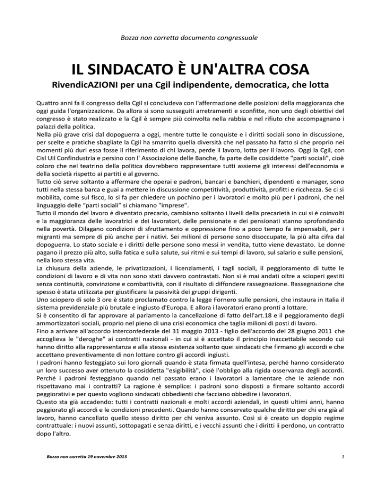 Bozza non corretta documento congressuale IL SINDACATO È UN'ALTRA COSA RivendicAZIONI per una Cgil indipendente, democratica, che lotta Quattro anni fa il congresso della Cgil si concludeva con l'affermazione delle posizioni della maggioranza che oggi guida l'organizzazione. Da allora si sono susseguiti arretramenti e sconfitte, non uno degli obiettivi del congresso è stato realizzato e la Cgil è sempre più coinvolta nella rabbia e nel rifiuto che accompagnano i palazzi della politica. Nella più grave crisi dal dopoguerra a oggi, mentre tutte le conquiste e i diritti sociali sono in discussione, per scelte e pratiche sbagliate la Cgil ha smarrito quella diversità che nel passato ha fatto sì che proprio nei momenti più duri essa fosse il riferimento di chi lavora, perde il lavoro, lotta per il lavoro. Oggi la Cgil, con Cisl Uil Confindustria e persino con l' Associazione delle Banche, fa parte delle cosiddette "parti sociali", cioè coloro che nel teatrino della politica dovrebbero rappresentare tutti assieme gli interessi dell'economia e della società rispetto ai partiti e al governo. Tutto ciò serve soltanto a affermare che operai e padroni, bancari e banchieri, dipendenti e manager, sono tutti nella stessa barca e guai a mettere in discussione competitività, produttività, profitti e ricchezza. Se ci si mobilita, come sul fisco, lo si fa per chiedere un pochino per i lavoratori e molto più per i padroni, che nel linguaggio delle “parti sociali” si chiamano "imprese". Tutto il mondo del lavoro è diventato precario, cambiano soltanto i livelli della precarietà in cui si è coinvolti e la maggioranza delle lavoratrici e dei lavoratori, delle pensionate e dei pensionati stanno sprofondando nella povertà. Dilagano condizioni di sfruttamento e oppressione fino a poco tempo fa impensabili, per i migranti ma sempre di più anche per i nativi. Sei milioni di persone sono disoccupate, la più alta cifra dal dopoguerra. Lo stato sociale e i diritti delle persone sono messi in vendita, tutto viene devastato. Le donne pagano il prezzo più alto, sulla fatica e sulla salute, sui ritmi e sui tempi di lavoro, sul salario e sulle pensioni, nella loro stessa vita. La chiusura della aziende, le privatizzazioni, i licenziamenti, i tagli sociali, il peggioramento di tutte le condizioni di lavoro e di vita non sono stati davvero contrastati. Non si è mai andati oltre a scioperi gestiti senza continuità, convinzione e combattività, con il risultato di diffondere rassegnazione. Rassegnazione che spesso è stata utilizzata per giustificare la passività dei gruppi dirigenti. Uno sciopero di sole 3 ore è stato proclamato contro la legge Fornero sulle pensioni, che instaura in Italia il sistema previdenziale più brutale e ingiusto d'Europa. E allora i lavoratori erano pronti a lottare. Si è consentito di far approvare al parlamento la cancellazione di fatto dell'art.18 e il peggioramento degli ammortizzatori sociali, proprio nel pieno di una crisi economica che taglia milioni di posti di lavoro. Fino a arrivare all'accordo interconfederale del 31 maggio 2013 - figlio dell'accordo del 28 giugno 2011 che accoglieva le "deroghe" ai contratti nazionali - in cui si è accettato il principio inaccettabile secondo cui hanno diritto alla rappresentanza e alla stessa esistenza soltanto quei sindacati che firmano gli accordi e che accettano preventivamente di non lottare contro gli accordi ingiusti. I padroni hanno festeggiato sui loro giornali quando è stata firmata quell'intesa, perché hanno considerato un loro successo aver ottenuto la cosiddetta "esigibilità", cioè l'obbligo alla rigida osservanza degli accordi. Perché i padroni festeggiano quando nel passato erano i lavoratori a lamentare che le aziende non rispettavano mai i contratti? La ragione è semplice: i padroni sono disposti a firmare soltanto accordi peggiorativi e per questo vogliono sindacati obbedienti che facciano obbedire i lavoratori. Questo sta già accadendo: tutti i contratti nazionali e molti accordi aziendali, in questi ultimi anni, hanno peggiorato gli accordi e le condizioni precedenti. Quando hanno conservato qualche diritto per chi era già al lavoro, hanno cancellato quello stesso diritto per chi veniva assunto. Così si è creato un doppio regime contrattuale: i nuovi assunti, sottopagati e senza diritti, e i vecchi assunti che i diritti li perdono, un contratto dopo l'altro. Bozza non corretta 19 novembre 2013 1 Tutto questo non è avvenuto soltanto negli accordi separati che le organizzazioni della Cgil non hanno firmato, metalmeccanici, scuola e commercio, ma anche in quelli firmati da tutti, dai ferrovieri ai chimici ai telefonici ai bancari e a tanti altri. I lavoratori pubblici hanno i contratti bloccati da anni e per altri anni a venire, mentre il salario viene tagliato e poi redistribuito a pochi, tra discriminazioni e clientele: cosa hanno fatto e fanno Cgil Cisl Uil contro questo? I pensionati hanno progressivamente perso fino al 33% del proprio reddito e potere d'acquisto, mentre pagavano tutti i costi della distruzione dello stato sociale. Intanto continua lo scandalo delle pensioni d'oro. Ma i sindacati dei pensionati, che pure sono la maggioranza di Cgil Cisl Uil, hanno fatto ben poco. Tutto questo era inevitabile? No. Il no della Fiom alla Fiat aveva suscitato grandi speranze e voglia di lottare nel mondo del lavoro e tra tanta gente stanca dell'arroganza delle caste politiche e finanziarie. Era un no a tutti i soprusi e le ingiustizie, ma anche un no alla complicità sindacale con essi. Il gruppo dirigente della Cgil non ha voluto partire da quel no per costruire un grande movimento di lotta, mentre ha sostenuto che quello della Fiat era un caso isolato e che in gran parte del mondo del lavoro le cose andavano diversamente. Il risultato è che il modello Marchionne è dilagato. La maggioranza della Cgil non ha voluto cambiare niente e alla fine anche il gruppo dirigente della Fiom si è adeguato