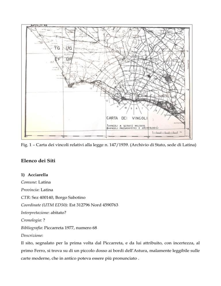 Fig. 1 – Carta dei vincoli relativi alla legge n. 147/1939. (Archivio di Stato, sede di Latina) Elenco dei Siti 1) Acciarella Comune: Latina Provincia: Latina CTR: Sez 400140, Borgo Sabotino Coordinate (UTM ED50): Est 312796 Nord 4590763 Interpretazione: abitato? Cronologia: ? Bibliografia: Piccarreta 1977, numero 68 Descrizione: Il sito, segnalato per la prima volta dal Piccarreta, e da lui attribuito, con incertezza, al primo Ferro, si trova su di un piccolo dosso ai bordi dell’Astura, malamente leggibile sulle carte moderne, che in antico poteva essere più pronunciato . Una ricognizione in anni recenti non ha dato alcun risultato. 2) La Fibbia Comune: Latina Provincia: Latina CTR: Sez 400140, Borgo Sabotino Coordinate (UTM ED50): Est 315263 Nord 4588729 Interpretazione: abitato Cronologia: Bronzo finale? Primo Ferro? Bibliografia: Piccarreta 1977, siti numero 155 e 156; Cardarelli et alii 1980, numero 324; Belardelli, Pascucci 1996a, numero 12. Descrizione: Durante le ricognizioni Piccarreta vennero ritrovate due concentrazioni di materiale protostorico che, data l’esigua distanza che le separa, sono state senz’altro considerare come appartenenti allo stesso insediamento. L’area più settentrionale, l’unica ad essere denominata La Fibbia nel lavoro dello studioso, secondo le esatte parole del Piccarreta, “per estensione e densità (---) va riferita ad un insediamento stabile”; di essa possediamo una foto di una scelta di materiali che, purtroppo, risultano attualmente irrintracciabili. In due sopralluoghi, effettuati a febbraio 2000 e gennaio 2001, si è constatato che la maggior parte dell’area occupata dalla dispersione dei frammenti ceramici, come era stata indicata negli anni ’70, si trova in un campo lasciato incolto; la visibilità, data la presenza di una gran quantità di vegetazione, attualmente è pessima; solamente un piccolo lembo di terreno coltivato, immediatamente ad ovest, restituisce alcuni minuscoli frammenti ceramici, peraltro di nessuna utilità dal punto di vista cronologico. Il sito si trovava, come si evince chiaramente dalle carte dell’ONC, ai bordi di una antica grande laguna; è possibile che l’azione dei mezzi meccanici, durante l’escavazione del fosso di drenaggio, possa aver traslato i frammenti ceramici verso l’invaso lagunare. Per il sito di La Fibbia, è stata proposta dalla Pascucci una datazione generica al Bronzo finale – primo Ferro. 3) Borgo Sabotino - Sopra Strada Alta Comune: Latina Provincia: Latina CTR: Sez 400140, Borgo Sabotino Coordinate (UTM ED50): Est 317388 Nord 4589372 Interpretazione: abitato Cronologia: Roma - Colli Albani III in poi Bibliografia: Borgo Sabotino, Guidi 1989; Belardelli-Pascucci 1996a; Sopra Strada Alta, Piccarreta 1977, numero 167 e 168 Descrizione: In due punti, lungo la sponda destra del Fosso Moscarello, il Piccarreta raccolse, durante le ricognizioni del 1977, alcuni frammenti di ceramica d’impasto da lui attribuiti, con incertezza, all’età del Ferro. In un sopralluogo di Alessandri, effettuato nel gennaio 1999, l’area restituiva pochissima ceramica d’impasto estremamente frammentata; vi era inoltre un campo coltivato nella porzione occidentale, ed un vigneto in quella orientale. L’area di frammenti fittili risultava concentrata a un terzo della lunghezza del campo, a partire dalla strada, lungo il margine che confinava con il vigneto, per un centinaio di metri di lunghezza, in senso sud-nord, e per poche decine di ampiezza, in senso est-ovest; verso settentrione gli ultimi frammenti si mischiavano con abbondanti manufatti di epoca romana. Non riferisce di forme diagnostiche. L’area di dispersione dei frammenti, posizionata sulle carte dell’ONC, è esattamente in corrispondenza di un’ansa fluviale, su di un piccolo dosso; proprio al di là del corso odierno del fiume vi è il sito di Borgo Sabotino. In antico l’area doveva essere vicinissima al Fosso Moscarello, comunque all’interno del suo alveo; essendo la posizione abbastanza insolita, e visti gli sconvolgimenti che l’area ha dovuto subire per la modifica del corso del fiume, è necessario prendere in considerazione l’ipotesi che gli strati antropizzati si trovino, almeno in parte, in giacitura secondaria. Appare tuttavia verosimile che tutte le aree di affioramento ceramico possano attribuirsi allo stesso insediamento, che verrebbe a trovarsi dunque su di un leggera altura all’interno di un’ansa del Fosso Moscarello, sulla destra idrografica del fiume; non è escluso che si tratti di una zona legata alla navigazione. 4) Quartaccio - Quartaccio Capanna Comune: Latina Provincia: Latina CTR: Sez 400140, Borgo Sabotino Coordinate (UTM ED50): Est 316246 Nord 4588521 Interpretazione: abitato? Cronologia: ? Bibliografia: Quartaccio, Piccarreta 1977, siti numero 161 e 162; Belardelli, Pascucci 1996a, denominato “tra Cannucceto e Quartaccio”; Quartaccio Capanna, Piccarreta 1977, numero 154 Descrizione: Quartaccio Capanna venne segnalato dal Piccarreta nel 1977 , e da lui assegnato, con incertezza, all’età del Ferro; una recente ricognizione nella zona ha dato putroppo esito negativo. A breve distanza, durante le ricognizioni effettuate dal Piccarreta vennero anche rinvenute, in due punti molto vicini fra loro, diverse concentrazioni di frammenti fittili attribuite anch’esse, data l’assenza di frammenti più diagnostici, genericamente all’età del Ferro. I punti sono segnalati anche sulla carta redatta dall’Opera Nazionale Combattenti. Quartaccio Capanna si trova su un leggero alto morfologico mentre le due aree di dispersione di frammenti fittili più meridionali sono dislocate lungo una depressione a carattere palustre che costituisce la traccia della grande laguna che correva dall’Astura al Monte Circeo. Il fatto che parte dei materiali non si trovino interamente sul bordo di essa, bensì all’interno di quello che doveva essere lo specchio d’acqua, può essere dovuto alle trasformazioni s