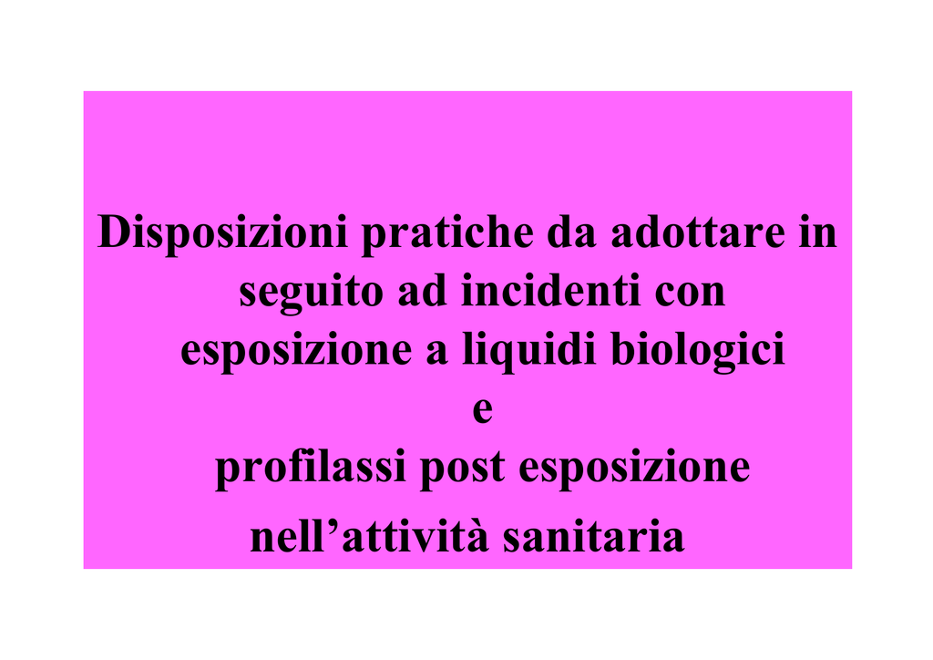 Disposizioni p p pratiche da adottare in seguito ad incidenti con esposizione a liquidi biologici e profilassi post esposizione nell’attività sanitaria Per far fronte all'eventualità di incidenti con esposizione a liquidi biologici è necessario disporre di procedure standardizzate e chiare per garantire un'assistenza ottimale alle ll persone coinvolte i lt e per ridurre id all minimo il rischio infettivo per le persone ferite/esposte • Operatori p odontoiatrici,, il personale p di pulizia, p , le persone attive nello smaltimento dei rifiuti, nel trasporto p dei campioni p clinici o nella manutenzione delle apparecchiature sono soggetti a rischio aumentato di esposizione. p • Queste persone, se entrano in contatto con sangue, tessuti o altri liquidi biologici, sono esposte al rischio di contagio . • L'urgenza si fonda sulla disponibilità di terapie efficaci, le quali devono essere p senza indugio g allo scopo p di intraprese assicurare un'ottimale profilassi postesposizione. esposizione • Nelle persone coinvolte in incidenti che vedono un'esposizione p ad HIV, HCV o HBV, si osservano molto frequentemente marcate reazioni di paura e a volte anche depressioni. p A qqueste sensazioni si associano anche sensazioni di colpevolezza, di ingiustizia g o un senso di trascuratezza da parte p di terzi. Nell'assistenza alle persone esposte bisogna dare loro l'opportunità pp di esprimere p le loro sensazioni. Occasionalmente può essere necessario offrire anche un'assistenza psicologica . Il personale che nello svolgimento delle sue mansioni occupazionali può essere esposto al rischio i hi di infortunio i f t i con liquidi li idi biologici, bi l i i dovrebbe disporre di informazioni scritte concernenti le misure immediate da adottare nel caso di incidente Nonostante le procedure, i dpi, la formazione……. Purtroppo è successo !!!!! Quali passi devo fare ora ???? Se attuo un comportamento corretto, adeguato d t e tempestivo t ti posso ancora ppensare di contenere il danno !!!!!! PRIMO PASSO Misure immediate da adottare dopo un incidente In caso di presenza di una ferita f i o di un’esposizione percutanea Ø P li i della Pulizia d ll ferita f it Ø Lavare con acqua e sapone Ø Disinfettare con un disinfettante antisettico PRIMO O PASSO SSO Misure immediate da adottare dopo un incidente In caso di esposizione delle mucose Ø Pulizia delle mucose Ø risciacquare abbondantemente con acqua o soluzione fisiologica SECONDO S CO O PASSO SSO Misure immediate da adottare dopo un incidente Eliminare l’oggetto gg infetto allo scopo di evitare un secondo incidente TERZO O PASSO SSO Misure immediate da adottare dopo un incidente Determinare ee e se il paziente p e e sorgente è a rischio (elevato) di essere portatore di un agente i f tti trasmissibile infettivo t i ibil attraverso tt il sangue L' L'anamnesi i del d l paziente i sorgente è cruciale poiché determinerà tutte le misure da adottare nel relativo caso di infortunio. Determinare se il paziente sorgente è a rischio (elevato) di essere portatore di un agente infettivo trasmissibile attraverso g il sangue. prima che il paziente sorgente si allontani dallo studio provvedere: • ad effettuare un un’anamnesi anamnesi mirata del paziente • a richiedere l’autorizzazione per effettuare delle sierologie g ((HIV,, epatiti) p ) • ad effettuare un prelievo di sangue per le sierologie • a convenire con il paziente sorgente le modalità per la trasmissione dei risultati dei test. Bisogna considerare come significativo qualsiasi tipo di esposizione che possa comportare un contagio del personale. Il rischio,, tuttavia,, dipende p dalla tipologia dell'esposizione e dal potenziale t i l infettivo i f tti del d l li liquido id in i causa Tipo di esposizione Commento Esposizione e rischio infettivo: rilevanti. Ferite (lesioni percutanee: sangue visibile) I seguenti fattori aumentano il rischio di t trasmissione i i di agenti ti infettivi: i f tti i - ferita profonda - sangue visibile sull sull’oggetto oggetto implicato nella ferita - l’oggetto coinvolto era posizionato in un vaso sanguigno i - la persona ferita non portava i guanti - concentrazione elevata dell dell’agente agente infettivo nel sangue del paziente sorgente Tipo di esposizione Esposizione delle mucose (occhio, bocca, naso) o esposizione in presenza di una pelle lesa con lesione visibile degli strati più esterni Commento Ridotto rischio di contagio Tipo di esposizione Commento Il rischio è molto debole (nel caso di Esposizione di una pelle assenza di lesioni apparenti della sana add una pelle) e non deve essere considerato concentrazione elevata di oltre ad eccezione di: - contatto diretto, anche senza la virus i presenza di una ferita, con il virus dell’HIV ad alta concentrazione (nei ( laboratori di ricerca) - contatto prolungato (diversi minuti) su una grande superficie (> 5 cm2) con il sangue di un paziente con una viremia alta (prima infezione o stadio terminale) Tipo di esposizione Commento Pelle apparentemente sana (nessuna lesione visibile dello strato corneo) a contatto con sangue o liquidi biologici Queste esposizioni non sono considerate significative e non necessitano di altre misure se non il lavaggio e la disinfezione • Nella pratica, pratica se non vi è sangue visibile, visibile un'esposizione a lacrime, sudore, feci e urine non rappresenta t un rischio i hi iinfettivo f tti per HIV, HIV HBV e HCV e non necessita una sorveglianza postesposizione ad eccezione nel caso in cui si p altre infezioni. conoscano o sospettino • Non sono considerati a rischio i tessuti fissati in formalina,, così come strumenti e oggetti che siano stati collocati per una durata adeguata in una soluzione disinfettante Importanza di una corretta DECONTAMINAZIONE ! ! ! Oggetti gg contaminati con sangue g da più di 24 ore non sono considerati a rischio per HIV e HCV ma vanno considerati come potenzialmente infettivi per HBV. Principali agenti infettivi che possono essere tra
