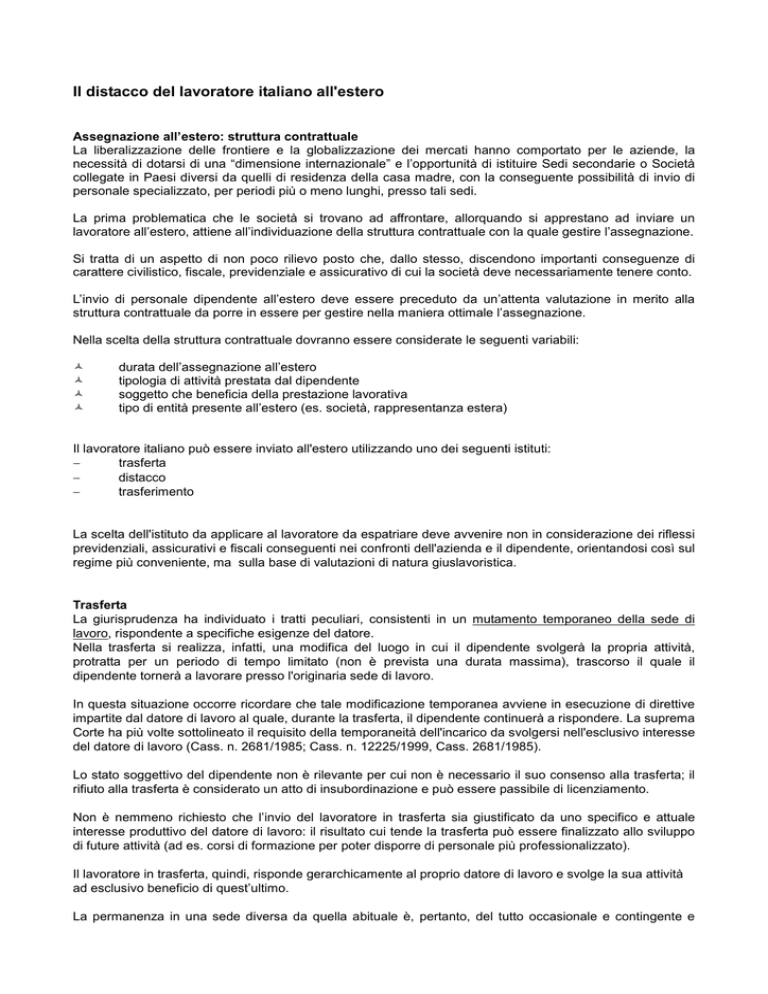 Il distacco del lavoratore italiano all'estero Assegnazione all’estero: struttura contrattuale La liberalizzazione delle frontiere e la globalizzazione dei mercati hanno comportato per le aziende, la necessità di dotarsi di una “dimensione internazionale” e l’opportunità di istituire Sedi secondarie o Società collegate in Paesi diversi da quelli di residenza della casa madre, con la conseguente possibilità di invio di personale specializzato, per periodi più o meno lunghi, presso tali sedi. La prima problematica che le società si trovano ad affrontare, allorquando si apprestano ad inviare un lavoratore all’estero, attiene all’individuazione della struttura contrattuale con la quale gestire l’assegnazione. Si tratta di un aspetto di non poco rilievo posto che, dallo stesso, discendono importanti conseguenze di carattere civilistico, fiscale, previdenziale e assicurativo di cui la società deve necessariamente tenere conto. L’invio di personale dipendente all’estero deve essere preceduto da un’attenta valutazione in merito alla struttura contrattuale da porre in essere per gestire nella maniera ottimale l’assegnazione. Nella scelta della struttura contrattuale dovranno essere considerate le seguenti variabili: durata dell’assegnazione all’estero tipologia di attività prestata dal dipendente soggetto che beneficia della prestazione lavorativa tipo di entità presente all’estero (es. società, rappresentanza estera) Il lavoratore italiano può essere inviato all'estero utilizzando uno dei seguenti istituti: − trasferta − distacco − trasferimento La scelta dell'istituto da applicare al lavoratore da espatriare deve avvenire non in considerazione dei riflessi previdenziali, assicurativi e fiscali conseguenti nei confronti dell'azienda e il dipendente, orientandosi così sul regime più conveniente, ma sulla base di valutazioni di natura giuslavoristica. Trasferta La giurisprudenza ha individuato i tratti peculiari, consistenti in un mutamento temporaneo della sede di lavoro, rispondente a specifiche esigenze del datore. Nella trasferta si realizza, infatti, una modifica del luogo in cui il dipendente svolgerà la propria attività, protratta per un periodo di tempo limitato (non è prevista una durata massima), trascorso il quale il dipendente tornerà a lavorare presso l'originaria sede di lavoro. In questa situazione occorre ricordare che tale modificazione temporanea avviene in esecuzione di direttive impartite dal datore di lavoro al quale, durante la trasferta, il dipendente continuerà a rispondere. La suprema Corte ha più volte sottolineato il requisito della temporaneità dell'incarico da svolgersi nell'esclusivo interesse del datore di lavoro (Cass. n. 2681/1985; Cass. n. 12225/1999, Cass. 2681/1985). Lo stato soggettivo del dipendente non è rilevante per cui non è necessario il suo consenso alla trasferta; il rifiuto alla trasferta è considerato un atto di insubordinazione e può essere passibile di licenziamento. Non è nemmeno richiesto che l’invio del lavoratore in trasferta sia giustificato da uno specifico e attuale interesse produttivo del datore di lavoro: il risultato cui tende la trasferta può essere finalizzato allo sviluppo di future attività (ad es. corsi di formazione per poter disporre di personale più professionalizzato). Il lavoratore in trasferta, quindi, risponde gerarchicamente al proprio datore di lavoro e svolge la sua attività ad esclusivo beneficio di quest’ultimo. La permanenza in una sede diversa da quella abituale è, pertanto, del tutto occasionale e contingente e nessun tipo di rapporto intercorre tra dipendente e soggetto presso il quale la prestazione è posta in essere. Distacco L'istituto è stato disciplinato dall'articolo 30 del D. Lgs. n. 276/2003 che ne ha definito i requisiti di legittimità, mutuandoli da quelli elaborati dalla giurisprudenza. Il distacco è una fra le modalità di invio all’estero di personale dipendente più utilizzate dalle società italiane che ne fanno spesso ricorso per disciplinare l’assegnazione di lavoratori all’estero per periodi medio – lunghi. Sino al D. Lgs. n. 276/2003 nel diritto privato non esisteva una definizione legislativa dell’istituto. Il distacco, pertanto, non comporta un'estinzione del rapporto di lavoro originario e la costituzione di un nuovo rapporto con il datore di lavoro cosiddetto "distaccatario", bensì ha l'effetto di modificare – in via temporanea e nell'interesse del datore di lavoro distaccante – solamente le modalità esecutive dell'obbligazione di lavoro, impegnando il dipendente a porre le proprie energie lavorative a disposizione del terzo, anziché del datore di lavoro originario, cosiddetto "distaccante", che di tale obbligazione è la controparte "naturale". Gli elementi qualificanti, pertanto, sono rappresentati dall'interesse del datore che deve sussistere per tutta la durata del distacco, dalla temporaneità di tale modifica (che non significa necessariamente brevità), e dal coinvolgimento di tre soggetti, vale a dire dipendente, datore di lavoro, società distaccataria (si è in presenza, infatti, di un rapporto "trilaterale"). Relativamente al requisito della temporaneità lo stesso non prevede che la durata debba essere necessariamente predeterminata o di breve periodo, in quanto la giurisprudenza ha dimostrato flessibilità (Cass. 1013/1985, Cass. 1325/1988). La società distaccataria a sua volta può essere una società terza ed autonoma rispetto al datore di lavoro oppure una società collegata (ad es. consociata estera della stessa casa madre, propria filiale estera ect.). Nel distacco, quindi, tutti gli altri aspetti del rapporto di lavoro diversi dalle modalità di esecuzione della prestazione restano invariati: il lavoratore continuerà a svolgere la medesima prestazione e il datore di lavoro continuerà ad essere l’unico soggetto tenuto all’adempimento degli obblighi retributivi, previdenziali, contrib