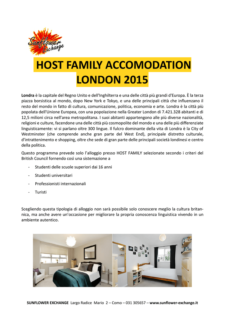 HOST FAMILY ACCOMODATION LONDON 2015 Londra è la capitale del Regno Unito e dell'Inghilterra e una delle città più grandi d'Europa. È la terza piazza borsistica al mondo, dopo New York e Tokyo, e una delle principali città che influenzano il resto del mondo in fatto di cultura, comunicazione, politica, economia e arte. Londra è la città più popolata dell'Unione Europea, con una popolazione nella Greater London di 7.421.328 abitanti e di 12,5 milioni circa nell'area metropolitana. I suoi abitanti appartengono alle più diverse nazionalità, religioni e culture, facendone una delle città più cosmopolite del mondo e una delle più differenziate linguisticamente: vi si parlano oltre 300 lingue. Il fulcro dominante della vita di Londra è la City of Westminster (che comprende anche gran parte del West End), principale distretto culturale, d'intrattenimento e shopping, oltre che sede di gran parte delle principali società londinesi e centro della politica. Questo programma prevede solo l’alloggio presso HOST FAMILY selezionate secondo i criteri del British Council fornendo così una sistemazione a - Studenti delle scuole superiori dai 16 anni - Studenti universitari - Professionisti internazionali - Turisti Scegliendo questa tipologia di alloggio non sarà possibile solo conoscere meglio la cultura britannica, ma anche avere un’occasione per migliorare la propria conoscenza linguistica vivendo in un ambiente autentico. SUNFLOWER EXCHANGE Largo Radice Mario 2 – Como – 031 305657 – www.sunflower-exchange.it PROCEDURE DI ISCRIZIONE 1. Fare richiesta per una famiglia 2. Compilare in ogni sua parte APPLICATION FORM per la richiesta di disponibilità 3. SE due o più studenti desiderano soggiornare insieme, dovranno compilare UN solo DOCUMENTO 4. Leggere e firmare il documento delle linee guida per la prenotazione 5. Una volta ricevuto il profilo della famiglia disponibile, la camera viene bloccata per 2 giorni; entro tale termine il cliente DEVE dare risposta altrimenti perde la priorità sulla prenotazione 6. Una volta accettata la famiglia proposta, lo studente avrà solo 7 giorni per poter saldare l’importo dovuto. Per prenotazioni che superano le 4 settimane, viene richiesto il pagamento delle suddette settimane. PREZZI PER CAMERA SINGOLA PER LA DURATA DI 1 SETTIMANA FAMIGLIA Trattamento di Trattamento di B&B, self catering mezza pensione Executive Zones 1 & 2 & 3 & 4 Prezzi su richiesta Prezzi su richiesta Superior Zone 2 € 380,00 circa * € 400,00 circa * Superior Zones 3 & 4 € 340,00 circa * € 390,00 circa * Standard Zone 2 € 340,00 circa * € 380,00 circa * Standard Zone 3 € 330,00 circa * € 340,00 circa * Standard Zones 4 & 5 € 300,00 circa * € 320,00 circa * PREZZI PER CAMERA DOPPIA PER LA DURATA DI 1 SETTIMANA, COSTO A PERSONA FAMIGLIA Trattamento di Trattamento di B&B, self catering mezza pensione Executive Zones 1 & 2 & 3 & 4 Prezzi su richiesta Prezzi su richiesta Superior Zone 2 € 350,00 circa * € 390,00 circa * Superior Zones 3 & 4 € 320,00 circa * € 360,00 circa * Standard Zone 2 € 320,00 circa * € 360,00 circa * Standard Zone 3 € 300,00 circa * € 330,00 circa * Standard Zones 4 & 5 € 290,00 circa * € 340,00 circa * SUNFLOWER EXCHANGE Largo Radice Mario 2 – Como – 031 305657 – www.sunflower-exchange.it PREZZI PER CAMERA SINGOLA FAMIGLIA Trattamento di B&B, self catering 2 settimane 3 settimane 4 settimane Executive Zones 1 & 2 & 3 & 4 Prezzi su richie- Prezzi su richie- Prezzi su richiesta sta sta Superior Zone 2 € 710,00 circa * € 960,00 circa * € 1.180,00 circa* Superior Zones 3 & 4 € 680,00 circa * € 880,00 circa * €1.100,00 circa * Standard Zone 2 € 600,00 circa * € 880,00 circa Standard Zone 3 € 680,00 circa * € 800,00 circa * €1.000,00 circa * Standard Zones 4 & 5 € 600,00 circa * € 750,00 circa * € 900,00 circa * FAMIGLIA Trattamento di mezza pensione 2 settimane 3 settimane €1.100,00 circa * 4 settimane Executive Zones 1 & 2 & 3 & Prezzi su richie- Prezzi su richie- Prezzi su richie4 sta sta sta Superior Zone 2 € 800,00 circa * €1.050,00 circa * €1.300,00 circa * Superior Zones 3 & 4 € 750,00 circa * € 960,00 circa * €1.200,00circa* Standard Zone 2 € 750,00 circa * € 990,00 circa * €1.200,00circa * Standard Zone 3 € 700,00 circa * € 920,00 circa * €1.100,00 circa* Standard Zones 4 & 5 € 650,00 circa * € 900,00 circa * €1.050,00 circa * PREZZI PER CAMERA DOPPIA, prezzi a persona FAMIGLIA Trattamento di B&B, self catering Executive Zones 1 & 2 & 3 & 4 2 settimane 3 settimane 4 settimane Prezzi su richie- Prezzi su richie- Prezzi su richiesta sta sta Superior Zone 2 € 700,00 circa * € 900,00 circa * €1.150,00 circa* Superior Zones 3 & 4 € 650,00 circa * € 900,00 circa * €1.050,00 circa * Standard Zone 2 € 650,00 circa * € 900,00 circa * €1.050,00 circa * Standard Zone 3 € 600,00 circa * € 780,00 circa * € 920,00 circa * Standard Zones 4 & 5 € 570,00 circa * € 750,00 circa * € 850,00 circa * SUNFLOWER EXCHANGE Largo Radice Mario 2 – Como – 031 305657 – www.sunflower-exchange.it Costi esclusi dai prezzi sopra riportati: - RC obbligatoria - Volo aereo - Trasferimento aeroportuale COSTI PER TRASFERIMENTO AEROPORTUALE Airport/Rail Costo a persona a tratta Heathrow £75 Gatwick £95 Stansted £95 Luton £105 City £75 Eurostar £70 Il pacchetto e i servizi sopra riportati, sono forniti dalla scuola estera con assistenza e consulenza di Sunflower Exchange. SUNFLOWER EXCHANGE Largo Radice Mario 2 – Como – 031 305657 – www.sunflower-exchange.it