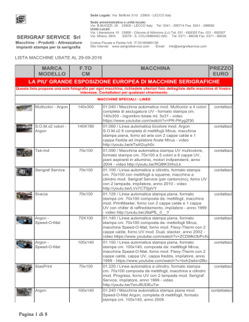 Sede Legale: Via Belfiore 31/d 23900 - LECCO Italy SERIGRAF SERVICE Srl Macchine - Prodotti - Attrezzature Impianti stampa per la serigrafia Sede amministrativa e unità locale: Via B.BUOZZI, 25 23900 - LECCO Italy Tel. 0341 - 285714 Fax. 0341 - 286692 Unità Locali: Via Liberazione 10 23895 - Cibrone di Nibionno (Lc) Tel. 031 - 692055 Fax. 031 - 692507 Via Milano, 89/A 20078 - S. COLOMBANO (MI) Tel. 0371 - 89038 Fax. 0371 - 89038 Codice Fiscale e Partita IVA IT 03185880139 Sito Internet www.serigrafservice.com Email: [email protected] LISTA MACCHINE USATE AL 29-09-2016 MARCA MODELLO F.TO CM MACCHINA PREZZO EURO LA PIU' GRANDE ESPOSIZIONE EUROPEA DI MACCHINE SERIGRAFICHE Questa lista propone una sola fotografia per ogni macchina, richiedete ulteriori foto dettagliate delle macchine di Vostro interesse. Contattateci per qualsiasi chiarimento. MACCHINE SPECIALI - LINEE Multicolor - Argon 140x300 01.040 / Macchina automatica mod. Multicolor a 4 colori completa di asciugatura UV - formato stampa cm. 140x300 - ingombro totale mt. 5x31 - video https://www.youtube.com/watch?v=PR-PKyg2f30 S.O.M.x2 colori Argon 140X180 01.060 / Linea automatica bicolore mod. Argon contattaci S.O.M.x2 6 completa di mettifogli Mirus, macchina stampa piana, forno ad aria con 2 cappe calde e 1 cappa fredda ed impilatore finale Mirus - video http://youtu.be/eTs4I2uyh0c 01.090 / Macchina automatica stampa UV multicolore, contattaci formato stampa cm. 70x100 a 5 colori e 6 cappe UV, piani aspiranti in alluminio, motori indipendenti, anno 2004 - video http://youtu.be/RQ8lK3XhcLk 01.100 / Linea automatica a cilindro, formato stampa contattaci cm. 70x100 con mettifogli a squame, macchina a cilindro mod. Serigraf Service (per cartoncino), forno UV con 2 lampade, impilatore, anno 2010 - video http://youtu.be/LVx7CT0jaVY 01.125 / Linea automatica stampa piana, formato contattaci stampa cm. 70x100 composta da: mettifogli, macchina mod. PrintMaster, forno con 2 cappe calde e 1 cappa UV con chiller di raffreddamento, impilatore - anno 1999 - video http://youtu.be/J9aPfL_0__Y 01.140 / Linea automatica stampa piana, formato contattaci stampa cm. 70x100 composta da: mettofogli Mirus, macchina Speed-O-Mat, forno mod. Flexy-Therm con 2 cappe calde, forno UV mod. Dual, stacker, anno 2002 video https://www.youtube.com/watch?v=ZCDMkObPvXo 01.150 / Linea automatica stampa piana, formato contattaci stampa cm. 100x140, composta da: mettifogli Mirus, macchina Speed-O-Mat, forno mod. Flexy-Therm con 2 cappe calde, cappa UV, cappa fredda, impilatore, anno 1999 - https://www.youtube.com/watch?v=bxh2adxn2Bo 01.220 / Linea automatica a cilindro, formato stampa contattaci cm. 70x100 composta da mettifogli, macchina a cilindro mod. Progress, forno UV con 2 lampade mod. Serigraf Service, impilatore, anno 1999 - video http://youtu.be/7enJ8UDEuTw 01.240 / Macchina automatica stampa piana mod. contattateci Speed-O-Mat Argon, completa di mettifogli, formato stampa cm. 100x140, anno 2009 Tek-Ind 70x100 Serigraf Service 70x100 Svecia 70x100 Argon Speed-O-Mat 70X100 Argon Speed-O-Mat 100x140 SiasPrint 70x100 Argon 100x140 Pagina 1 di 8 contattaci Siasprint 70x100 Siasprint 50x70 Siasprint 50x70 Argon Speed-O-Mat 100x140 Argon Speed-O-Mat 120x160 Speed-O-Mat Argon 50x70 IST 80x120 CMS 70x100 Supermatic / / / 01.270 / Linea automatica formato cm. 70x100, anno 2004, composta da mettifogli, macchina stampa a cilindro mod. Progress ultimo tipo, forno a raggi UV a 2 lampade ed impilatore finale 01.280 / Linea automatica composta da macchina stampa a cilindro mod. Progress Siasprint, forno ad aria mod. Wiket con 500 cestelli e salita, formato stampa cm. 50x70, funzionante 01.300 / Linea automatica stampa a cilindro, formato cm. 50x70 composta da: mettifogli mod. Mirus, macchina a cilindro mod. Progress, forno a raggi UV a 2 lampade mod. Dalpont, anno 2006 01.310 / Linea automatica stampa piana: mettifogli + macchina Speed-O-Mat Argon + forno ad aria con due cappe calde e una cappa fredda + impilatore finale - cm. 100x140 - usata pochissimo 01.410 / Linea automatica mod. Argon S.O.M. 4 completa di mettifogli Mirus, macchina stampa piana, forno ad aria calda, impilatore, anno 2002 - video http://youtu.be/7U6vbL7qaPY 01.610 / Macchina automatica stampa piana, formato cm. 50x70 - composta da Macchina mod. Speed-O-Mat completa di mettifogli - revisionata contattaci 01.730 / Macchina per stampa piana completa di mettifogli - mod. IST (simile al modello Siasprint) formato stampa cm. 80x120 01.740 / Macchina automatica modello CMS completa di mettifoglio contattaci 01.820 / Applicatore di polveri automatico per carta transfer contattaci contattaci contattaci contattaci contattaci contattaci contattaci MACCHINE AUTOMATICHE PIANE Svecia - SAM 70x100 02.110 / Macchina automatica per stampa piana con pinze a puntatura a mano, formato stampa cm. 70x100 contattaci Svecia Print Master SPS 70x100 contattaci Thieme 120x160 02.120 / Macchina mod. Svecia Print Mastercon pinze a puntatura a mano, formato cm. 70x100 02.150 / Linea composta da macchina 3/4 automatica mod. SPS con piano che entra ed esce completa di forno UV - perfettamente funzionante 02.160 / Macchina 3/4 automatica stampa piana mod. Thieme 3040, formato stampa cm. 120x160 70x100 contattateci contattateci MACCHINE AUTOMATICHE A CILINDRO Sakurai - SC102 70x100 Sakurai - SC102 70x100 Siasprint Progress 100x140 SiasPrint Progress 70x100 Pagina 2 di 8 03.100 / Macchina automatica stampa cilindro mod. Sakurai SC102 completo di mettifogli e fotocellule nel cilindro, formato stampa cm. 70x100 - revisionata (come nuova) con cilindro nuovo e impianto elettrico nuovo 03.110 / Macchina automatica stampa a cilindro mod. SC102 completa di mettifogli, formato stampa cm. 70x100 - completamente revisionata 03.210 / Macchina automatica stampa a cilindro mod. Progress completa di mettifogli Mirus, formato stampa cm. 100x140, anno 1999 03.320 / Macchina automatica stampa a cilindro completa di mettifogli SiasPrint - in condizioni ecce