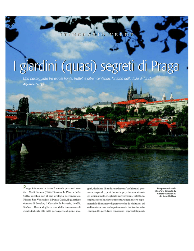 I T I N E R A R I O V E R D E I giardini (quasi) segreti di Praga Una passeggiata tra aiuole fiorite, frutteti e alberi centenari, lontano dalla folla di turisti. di Jeanne Perego Praga è famosa in tutto il mondo per tanti mo- gari, decidere di andare a dare un’occhiata di per- Città Vecchia con il suo orologio astronomico, gli unici a farlo. Negli ultimi vent’anni, infatti, la tivi: Malá Strana (Città Piccola), la Piazza della Piazza San Venceslao, il Ponte Carlo, il quartiere ebraico di Josefov, il Castello, le birrerie, i caffè, Kafka… Basta sfogliare una delle innumerevoli guide dedicate alla città per saperne di più e, ma- sona, sapendo, però, in anticipo, che non si sarà capitale ceca ha visto aumentare in maniera espo- nenziale il numero di persone che la visitano, ed è diventata una delle prime mete del turismo in Europa. Se, però, tutti conoscono i sopracitati punti Una panoramica della Città d’oro, dominata dal Castello e attraversata del fiume Moldava. compresso tra le migliaia di turisti provenienti da ogni parte del mondo. L’oasi verde dei Francescani Un giro tra il verde praghese può iniziare dove paradossalmente di verde ce ne è meno: la Città Vecchia, che per la sua struttura urbanistica di epoca medievale dedica poco spazio ai giardini. Tra Piazza San Venceslao e la Piazza Jungman- novo (già nella Città Nuova) c’è, però, un gioiello botanico: il Giardino del seminario dei Francescani (Seminářská zahrada, dove “zahrada” sta per giardino) un’oasi di pace a due passi dal caos cittadino, in cui ci si può riposare su una panchina situata accanto a un tasso del XVII secolo, rite- nuto uno degli alberi più vecchi della città. La storia di questo giardino è piuttosto trava- gliata. Fu impiantato intorno al 1604, quando venne costruito il convento e per tre secoli, anche se con alterne fortune, rimase nelle mani dei frati che lo utilizzavano soprattutto per coltivare erbe medicinali, pur avendolo abbellito con una fontana decorata con statue. Con l’avvento del re- gime comunista, nel 1950, fu trasformato in giardino pubblico e presto abbandonato a sé stesso. Dopo la caduta del Muro di Berlino è ritornato nelle mani dei Francescani ed è stato oggetto di un bel restauro, i frati hanno tenuto per sé solo una piccola parte, mentre il resto continua ad essere un giardino aperto al pubblico, che può pas- seggiare lungo i suoi numerosi viali, o godersi lo spettacolo della fioritura delle aiuole di annuali e di numerosi cespugli di rose in primavera. Kafka, i tulipani dell’imperatore e una fontana cantante Il modesto impiegato delle Assicurazioni Gene- rali Franz Kafka ogni mattina, prima di recarsi al lavoro in Piazza San Venceslao, apriva le finestre della sua camera e si trovava davanti l’impod’interesse artistico e culturali, in pochi hanno un’idea dei suoi giardini e dei suoi parchi. Fatto curioso, se si tiene conto che il verde occupa circa il 45% del territorio di Praga. Chi decide, quindi, di fare una bella passeggiata tra i giardini e i parchi della capitale ceca ha una meravigliosa certezza, quella di sapere che per qualche ora non si troverà nente Castello, il simbolo del potere politico boemo. Nel Castello (che in ceco si dice “Hrad”) vi andò, poi, addirittura ad abitare, al numero 22 di quel Vicolo d’Oro meglio conosciuto come vicolo degli alchimisti, visto che lì si cercò inutilmente la for- mula per trasformare il ferro in oro. Quasi certamente non fu questo maniero a ispirargli l’ultimo e il più ambiguo dei suoi scritti, Il Castello ap- 19 In alto, angoli e aree verdi della città. Nella pagina accanto, i romantici giardini che circondano il Castello. punto, ma di certo anche lui ne conosceva bene i Gli altri giardini del presidente dell’architettura barocca praghese. A farli costruire, denza ufficiale del presidente della Repubblica Giardini Reali (Kràlovskà zahrada), uno dei must paralleli al castello per tutta la sua lunghezza, e separati dallo stesso dal cosiddetto Fossato dei Cervi, fu l’imperatore Ferdinando I d’Asburgo, nel 1534. Lo stile allora era quello rinascimentale, con la caratteristica alternanza di piante da frutto e fiori: poi furono pian piano trasformati in giardini di gusto manierista e più volte rimaneggiati. Oggi, dopo l’ultima trasformazione avvenuta alla fine del XIX secolo, appaiono come un curato parco Ceca, è composta anche da altri sei giardini, detti Giardini meridionali, collegati tra loro ma non tutti aperti al pubblico perché utilizzati in parte come vivai. Tra quelli visitabili, ecco il Giardino sulla Terrazza della scuola d’equitazione in stile barocco pur essendo stato progettato negli anni Cinquanta per coprire i garage presidenziali. Il Giardino dei Bastioni è stato costruito nel 1861 e poi trasformato nel 1930 da Jože Plečnik, un ar- di gusto inglese in cui è una delizia passeggiare chitetto sloveno di chiara fama, chiamato a rior- primi tulipani arrivati in Europa, portati a Praga Tomáš Masaryk. Per questo giardino scelse un pensando che proprio qui, nel 1554, fiorirono i dall’ambasciatore turco. Dopo un periodo di acclimatazione nel vivaio del Castello, i bulbi produssero una straordinaria fioritura di esemplari gialli, rossi e bianchi. La fortuna che questi fiori ebbero successivamente in Europa, e in particolare in Olanda, è cosa nota. Una delle maggiori attrattive per i visitatori dei Giardini Reali è la cosiddetta “fontana cantante”, situata davanti al palazzo rinascimentale del Bel- vedere. Si tratta di una fontana cinquecentesca in bronzo in cui lo zampillare dell’acqua riproduce un suono di campane. Per sentirlo - recitano le ganizzare gli spazi del castello dal presidente mix di elementi italiani e giapponesi, mentre per il Giardino dei Bastioni optò per l’introduzione di una pergola, una voliera, una fontana e una terrazza belvedere, collegata da una scala a un pa- diglione per concerti. Il Giardino del Paradiso, del XV