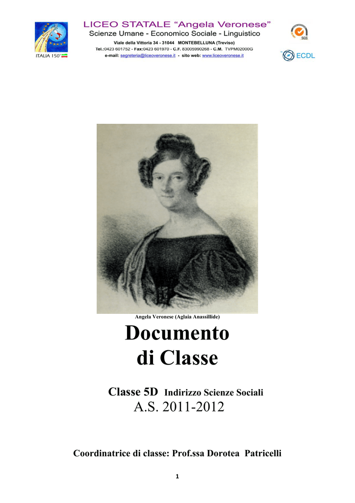 Angela Veronese (Aglaia Anassillide) Documento di Classe Classe 5D Indirizzo Scienze Sociali A.S. 2011-2012 Coordinatrice di classe: Prof.ssa Dorotea Patricelli 1 INDICE ELENCO DEGLI STUDENTI 3 ELENCO DOCENTI DELLA CLASSE 3 PIANO ORARIO DELLE LEZIONI 4 PARTE PRIMA 5 ‐ Descrizione della scuola e del contesto ambientale (territorio e sue caratteristiche) PARTE SECONDA 6 ‐ Indirizzi scolastici dell’Istituto POF ‐ Liceo delle Scienze Sociali PARTE TERZA 9 ‐ Strumenti e criteri di valutazione discipline ‐ Comportamento ‐ Simulazione prove esame PARTE QUARTA 13 ‐ Storia e profilo della classe ‐ Stage ‐ Attività integrative ed extrascolastiche ‐ Approfondimenti personali degli allievi GRIGLIE VALUTATATIVE PER LE SIMULAZIONI DI PROVE D’ESAME Griglia valutativa di Prima prova 18‐21 Griglia valutativa di Seconda prova 22‐23 Griglia valutativa di Terza prova 24 PROGRAMMI SVOLTI RELIGIONE 26 ITALIANO 27 STORIA 41 FILOSOFIA 43 INGLESE 46 TEDESCO 52 DIRITTO 54 MATEMATICA 56 SCIENZE 58 SCIENZE SOCIALI 60 EDUCAZIONE FISICA 64 2 ELENCO DOCENTI DELLA CLASSE 5a Dss LICEO DELLE SCIENZE SOCIALI COGNOME NOME MATERIA DI INSEGNAMENTO Firma Docenti BOSCARINI PIERA RELIGIONE PATRICELLI DOROTEA ITALIANO PATRICELLI DOROTEA STORIA PAGNON INES FILOSOFIA BORDIN LUISA INGLESE BOF TIZIANA TEDESCO MUSMECI ROSA MARIA DIRITTO ED ECONOMIA MARTON SILVANO MATEMATICA GIORDANO COSIMINA SCIENZE SPERIMENTALI BERTON ANNALISA SCIENZE SOCIALI VENICA EMANUELA EDUCAZIONE MOTORIA ELENCO STUDENTI DELLA CLASSE 5a Dss COGNOME NOME Firma alunni ANTONINI ANDREA BELLE' SAMUELE BERLESE MONICA BOGANA ELIZABETH BONORA IVONNE BORTOLOMIOL ANNA CASTELLAN FRANCESCA DAL NEGRO MARINA DE PAOLI SILVIA GALLINA CLARISSA GAZZOLA MARTINA GUARISA ALICE ILLI ALICE MARCHESE GLORIA MARTIGNAGO GIULIA ORSATO FRANCESCA PAULETTO BENEDETTA PICCOLI VERONICA TONIN ILENIA 3 QUADRO ORARIO DEL LICEO DELLE SCIENZE SOCIALI Discipline 1° anno 2° anno 3° anno 4° anno 5° anno Religione / Attività alternative 1 1 1 1 1 Italiano 4 4 4 4 4 Storia 3 * 3* 2 2 2 Diritto Economia 2* 2* 2 2 2 Filosofia (1) 3 3 3 Lingua Straniera Inglese 3 3 3 3 3 Lingua Straniera 2 3 3 3 3 3 5** 5** 5 5 5 Matematica 3 3 3 3 3 Scienze della Terra e Biologia 2 2 Scienze Sperimentali 2 2 2 LNVM (Informatica) 2** 2** Educazione fisica 2 2 Educazione motoria 2 2 2 Discipline dell’area dell’integrazione LNVM 2 2 TOTALE ORE SETTIMANALI PER CLASSE 30 30 30 30 30 Scienze Sociali * Di cui un’ora in compresenza ** Di cui un’ora in compresenza 4 PARTE PRIMA Introduzione L’Istituto Superiore Angela Veronese si trova in centro a Montebelluna, nella sede “storica” di Viale della Vittoria, composta di un corpo centrale e da una sede succursale costituita dall’ex scuola media Dante Alighieri. Gli uffici di segreteria e di presidenza si trovano nel sede centrale. Adiacente all'Istituto vi è una palestra polivalente, dotata di campo da basket, campo da pallavolo e vari attrezzi ginnici. Le attrezzature a supporto delle attività didattiche, acquisite negli anni da parte dell’Istituto sono: due laboratori d’informatica, un laboratorio linguistico, un laboratorio di chimica, un laboratorio di biologia e una dotata e aggiornata biblioteca. Storia dell'Istituto L'Istituto ha cominciato ad operare a Montebelluna nell'anno scolastico 1966/67 come sezione staccata dell'Istituto magistrale "Duca degli Abruzzi" di Treviso. Nell'anno scolastico successivo (1967/68) ha ottenuto l'autonomia da Treviso; gli organi collegiali hanno quindi scelto la denominazione "Angela Veronese" in omaggio ad una poetessa locale del XVIII secolo. L’Istituto vanta una lunga storia d’inno‐ vazione e sperimentazione didattica. Dopo aver avviato il nuovo corso quinquennale del Liceo Psico‐ Pedagogico, in sostituzione delle vecchie magistrali, ha iniziato la spe‐rimentazione del nuovo Indirizzo Linguistico Brocca. Con l’introduzione della legge sull’Autonomia delle Istituzioni scolastiche (1999) l’Istituto ha avviato tre nuovi indirizzi, i cui programmi sono stati progettati dagli insegnanti stessi, tenendo conto delle esperienze di sperimentazione: 1. Il Liceo Linguistico Autonomo; 2. Il Liceo delle Scienze Sociali; 3. Il Liceo delle Scienze Umane. I tre indirizzi sono ormai tutti a regime. L’Istituto ha sempre investito per offrire agli studenti attrezzature tecnologiche aggiornate, e il corpo insegnante si contraddistingue per il notevole livello di conoscenza e uso delle nuove tecnologie. Contesto Socio‐Economico La scuola si colloca in un territorio particolarmente ricco sotto il profilo artigianale e industriale, che però vive in questo momento tutte le difficoltà e le contraddizioni in cui si dibatte l’intero Paese. Settori industriali (tessile, calzature, eccetera) che per anni ha conosciuto una crescita continua e apparente‐ mente senza limiti sono ora messi in crisi dal fenomeno della delocalizzazione e dalla concorrenza internazionale, basata su bassi costi del lavoro. Questo momento di passaggio rappresenta una sfida importante per il sistema dell’istruzione superiore. La riconversione produttiva del nostro territorio e dell’intero Paese non potrà prescindere, infatti, da consistenti investimenti privati e pubblici in ricerca e sviluppo e da un generale innalzamento dei livelli culturali dei giovani che s’immettono sul mercato del lavoro. Da questo punto di vista, la scelta delle famiglie di investire su una scolarità d’alto livello, aperta a tutte le facoltà universitarie, non appare frutto di una moda passeggera: un alto livello d’istruzione, infatti, garantisce la necessaria flessibilità per inserirsi in un mercato del lavoro in veloce cambiamento, i cui bisogni, negli 8‐10 anni che trascorrono tra l’iscrizione di uno studente al primo anno di corso e l’inseri‐ mento effettivo al termine degli studi universitari o post‐diploma, sono difficili da prevedere. L’Istituto Veronese ha dunque saputo “intercettare” negli ultimi anni un
