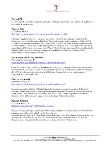 PALAZZI La WineCard permette l’ingresso gratuito a Palazzi altrimenti non aperti al pubblico o accessibili a pagamento. Palazzo Pitti Piazza dei Pitti, 1 http://www.polomuseale.firenze.it/musei/?m=palazzopitti È la vera “reggia” medicea, il segno di un potere centrale e assoluto, poi residenza del Granduca che gestiva le cose politiche in Palazzo Vecchio mentre abitava in Palazzo Pitti. Da tempo è una sede multimuseale a partire dalla Galleria Palatina, autentica quadreria del collezionismo Sei-Setteentesco che per importanza di opere che vi risiedono non è di molto seconda agli Uffizi, per continuare con il Museo degli Argenti, dedicato all'arte applicata, la Galleria del Costume, il maggior museo italiano dedicato alla moda, il Museo delle Porcellane e il Museo delle Carrozze. Sala d'Arme di Palazzo Vecchio Piazza della Signoria, 1 http://museicivicifiorentini.comune.fi.it/palazzovecchio Costruita entro il 1312, è l'unico ambiente del palazzo a conservare la sua struttura primitiva, con coperture a crociera in laterizio costolonate e pilastri in pietra forte. Durante il restauro del 1910 gli intonaci originali vennero abbattuti e fu riaperta la porta sulla piazza (di Tramontana), chiusa nel 1380. Palazzo Davanzati Via Porta Rossa, 9 http://www.polomuseale.firenze.it/musei/?m=davanzati Costruito verso la metà del '300 dalla famiglia Davizzi, mercanti benestanti dell'arte di Calimala (o dei mercatanti), come ampliamento di una preesistente casa torre medievale fu venduto nel 1578 a Bernardo Davanzati. Nel 1951 il palazzo fu acquistato dallo Stato Italiano che lo adibì a museo, oggi Museo della Casa Antica Fiorentina. Palazzo Antinori Piazza Antinori, 3 http://it.wikipedia.org/wiki/Palazzo_Antinori Palazzo Antinori, tra i più importanti edifici rinascimentali di Firenze, si trova nell'omonima piazza, a una delle estremità di via de' Tornabuoni. Fu costruito tra il 1461 e il 1469 da Giuliano da Maiano. Nel 1506 l’edificio passò a Niccolò Antinori, già residente in Oltrarno e fu ampliato e portato alle forme attuali da Baccio d’Agnolo, uno fra gli architetti più in vista fra Rinascimento e Manierismo. Chiostro delle Oblate Via dell'Oriuolo, 26 http://it.wikipedia.org/wiki/Complesso_delle_Oblate Il complesso delle Oblate accoglieva il reparto femminile dell’ospedale e aveva una chiesa dedicata a Santa Maria. Le religiose abbandonarono l’edificio nel 1936. Gli ambienti del vasto complesso ospedaliero e religioso, con il grande chiostro con il giardino che si apre su via dell’Oriolo, sono stati restaurati e adibiti ad altri usi culturali quali la rinnovata Biblioteca Comunale delle Oblate. Palazzo Pazzi Quaratesi Via del Proconsolo, 10 http://it.wikipedia.org/wiki/Palazzo_Pazzi Palazzo Pazzi detto anche della Congiura o Palazzo Pazzi-Quaratesi si trova in via del Proconsolo. Fu Jacopo de' Pazzi, uno fra gli organizzatori della celebre congiura, a volerne la costruzione, intorno alla metà del Quattrocento, sui resti di alcune case appartenenti alla sua famiglia. Museo del Bargello Via del Proconsolo, 4 http://www.uffizi.firenze.it/musei/?m=bargello Il Palazzo fu sede dei Podestà di Firenze dal 1260 al 1504. Sotto il Principato di Cosimo I, nel 1574, fu trasformato in carcere, prendendo il nome di Palazzo del Bargello. Dal 1865 è sede del Museo Nazionale del Bargello che conserva un’importantissima collezione di sculture fra cui il David di Donatello, il Bacco di Michelangelo, il Narciso di Benvenuto Cellini. Loggia del Grano Angolo Via dei Neri, Via dei Castellani http://it.wikipedia.org/wiki/Loggia_del_Grano Nel 1619 fu edificata come mercato del grano ma già alla fine dello stesso secolo perse il suo ruolo in favore del nuovo Granaio dell'Abbondanza in Oltrarno. Da allora subì̀ varie trasformazioni e cambi di utilizzo. Inglobata in un palazzo nella seconda metà dell'Ottocento vi fu aperto un teatro, voluto dall'attore Tommaso Salviati e detto appunto delle Logge. Palagio di Parte Guelfa Piazza di Parte Guelfa http://it.wikipedia.org/wiki/Palagio_di_Parte_Guelfa L’edificio risale al tempo delle guerre interne fra Guelfi e Ghibellini e la sua denominazione indica a quali delle due fazioni fosse riferito. È un bellissimo esempio di una casa torre medievale riconvertita in palazzo nobiliare. La bella sala Quattrocentesca forse fu realizzata su progetto di Filippo Brunelleschi mentre alcuni interventi Cinquecenteschi sono di Giorgio Vasari. Palazzo Capponi delle Rovinate Via de’ Bardi, 36 http://it.wikipedia.org/wiki/Palazzo_Capponi_alle_Rovinate Il palazzo, anticamente palazzo Capponi da Uzzano, fu costruito nel primo ventennio del Quattrocento per volontà di Niccolò da Uzzano, capo del partito degli Ottimati ed esecutore testamentario dell’antipapa Giovanni XXIII. Caratterizzano l’architettura del palazzo elementi innovativi come la pianta regolare, sviluppata attorno a un cortile centrale a portici che, nonostante i caratteri ancora tardo gotici dei pilasti ottagoni con capitelli a foglie d’acqua, è ritenuto uno dei primi “modelli” di cortile rinascimentale. Il disegno del palazzo è probabilmente da assegnare a Lorenzo di Bicci, anche se recentemente alcuni studiosi hanno avanzato l’ipotesi che il progetto sia da riferire al giovane Brunelleschi. Dopo la morte di Niccolò il palazzo divenne proprietà di un ramo della famiglia Capponi e assunse l’appellativo “delle rovinate”. Ufficio stampa [email protected] UFFICIO STAMPA LOCALE inPRess +39 055 3840943 Riccardo Basile +39 335 387281 UFFICIO STAMPA NAZIONALE cinquesensi +39 0583 316509 Sara Vitali +39 335 6347230