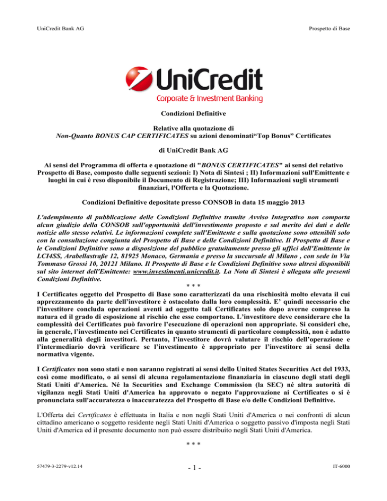 Condizioni Definitive depositate presso CONSOB in data 15 maggio 2013