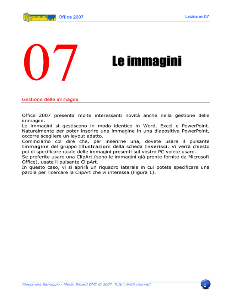 Lezione 07 Office 2007 Le immagini Gestione delle immagini Office 2007 presenta molte interessanti novità anche nella gestione delle immagini. Le immagini si gestiscono in modo identico in Word, Excel e PowerPoint. Naturalmente per poter inserire una immagine in una diapositiva PowerPoint, occorre scegliere un layout adatto. Cominciamo col dire che, per inserirne una, dovete usare il pulsante I mmagine del gruppo I llustrazioni della scheda I nserisci. Vi verrà chiesto poi di specificare quale delle immagini presenti sul vostro PC volete usare. Se preferite usare una ClipArt (sono le immagini già pronte fornite da Microsoft Office), usate il pulsante ClipArt. In questo caso, vi si aprirà un riquadro laterale in cui potete specificare una parola per ricercare la ClipArt che vi interessa (Figura 1). Alessandra Salvaggio Merlin Wizard DMC © 2007 Tutti i diritti riservati 1 Office 2007 Lezione 07 Figura 1 Scrivete la chiave di ricerca nella casella Cerca, poi premete il pulsante Vai per avviare effettivamente la ricerca. Se volete limitare la ricerca alle ClipArt e/o Fotografie ed evitare, ad esempio, che la ricerca vi restituisca file audio o video, prima di avviare la ricerca, dall'elenco Tipo di risultati deselezionate i tipi di file che non vi interessano. Oltre che effettuare una ricerca su tutte le ClipArt esistenti, potete navigare fra le categorie di ClipArt disponibili e chiedere a Word di mostrarvi tutte le ClipArt che appartengono a una o più categorie, potete aprire l'elenco a discesa Cerca in e fare clic sul piccolo più (+) posto accanto alla voce Insiemi Office per visualizzarne il contenuto (Figura 2). Figura 2 Alessandra Salvaggio Merlin Wizard DMC © 2007 Tutti i diritti riservati 2 Office 2007 Lezione 07 Per impostazione predefinita Word esegue la ricerca in tutte le categorie, ma così rischiate di trovare troppe immagini, moltissime delle quali non vi occorrono. Togliete il segno di spunta dalle categorie che non vi interessano, poi premete il pulsante Vai. Se non specificate alcuna parola nella casella Cerca, Word vi mostrerà tutte le ClipArt delle categoria (o delle categorie) selezionata. La categoria I nsiemi contiene le vostre immagini, la categoria insiemi di Office contiene le ClipArt installate insieme ad Office, mentre la categoria I nsiemi w eb contiene le ClipArt disponibili sul sito Office Online. Per effettuare la ricerca in questa categoria dovete essere connessi ad internet. In qualsiasi modo effettuiate la ricerca, Word vi mostra i risultati nel riquadro centrale del pannello di destra (questo pannello si chiama Riquadro delle attività). Fate doppio clic sull’immagine che vi piace per inserirla (Figura 3). Le ClipArt che presentano in basso a sinistra l’icona del mondo si trovano sul sito Office Online. Figura 3 Una volta inserite, le immagini del vostro PC o le ClipArt si comportano allo stesso modo, dunque ne parleremo insieme. Trovate i comandi per modificare le immagini nella scheda Formato degli Strumenti immagine. Molti comandi sono simili a quelli che già erano disponibili nelle vecchie versioni di Office, ma altri sono nuovi, come Ricolora. Trovate questo menu nel gruppo Regola. Il comando Ricolora vi permette di cambiare i colori della vostra immagine. Sarà un po' come se guardaste la vostra immagine attraverso un vetro colorato. L'effetto è analogo alla conversione in bianco e nero (o meglio in scala di grigi) solo che ottenete una conversione in bianco e un colore (ad esempio, bianco e rosso e tutte le sfumature intermedie). Scegliete il colore che desiderate dall’apposito menu (Figura 4). Alessandra Salvaggio Merlin Wizard DMC © 2007 Tutti i diritti riservati 3 Office 2007 Lezione 07 Figura 4 Trovate altri comandi interessanti nel gruppo Stili immagini: ci sono varie combinazioni di stili reimpostate. Potrete mettere bordi, impostare trasparenze, creare immagini riflesse (Figura 5). Figura 5 Se non volete queste combinazioni reimpostate, potete ricorrere ai soliti menu laterali per selezionare le opzioni che desiderate (sfondo, effetto..). Sono molto interessanti le opzioni del menu Forma immagine (Figura 6). Alessandra Salvaggio Merlin Wizard DMC © 2007 Tutti i diritti riservati 4 Office 2007 Lezione 07 Figura 6 In pratica con queste forme “ritaglierete” l’immagine. Resterà visibile solo la parte dell’immagine interna alla forma che usate per il ritaglio. Per darvi meglio l’idea di come funziona questo ritaglio la Figura 7 vi mostra a sinistra l’immagine originale e, a destra, l’immagine ritagliata con una forma a stella. Figura 7 Tutti gli effetti che vi abbiamo presentato sono assolutamente reversibili. Per tornare all’immagine originale, vi basta premere il pulsante Reimposta immagine nel gruppo Regola degli Strumenti immagine. Convertire in una versione precedente Cosa succede se tentiamo di salvare un documento, una cartella di lavoro, una presentazione che contiene un immagine a cui sono applicate le formattazioni tipiche di Office 2007 in un formato precedente? L'immagine nel file salvato con una vecchia versione manterrà tutte le caratteristiche di formattazione che le avete assegnato, ma queste non potranno più essere rimosse, né modificate (a meno di non inserire da capo l'immagine originale). Alessandra Salvaggio Merlin Wizard DMC © 2007 Tutti i diritti riservati 5 Office 2007 Lezione 07 Le forme Non solo le immagini, ma anche le forme come frecce, rettangoli, stelle, cuori… possono essere formattate con combinazioni di stili reimpostate. Le forme si potevano già inserire già con le versioni precedenti di Office, ma le possibilità di formattazione erano molto più limitate. Cominciamo col dire che per inserire una forma, basta portarsi nella scheda I nserisci, nel gruppo Forme, e fare clic sulla forma che vi interessa e, quindi, disegnarla (fate clic nel punto in cui volete che la forma cominci e trascinate col mouse. Quando la forma ha la dimensione che desiderate, rilasciate il mouse) 