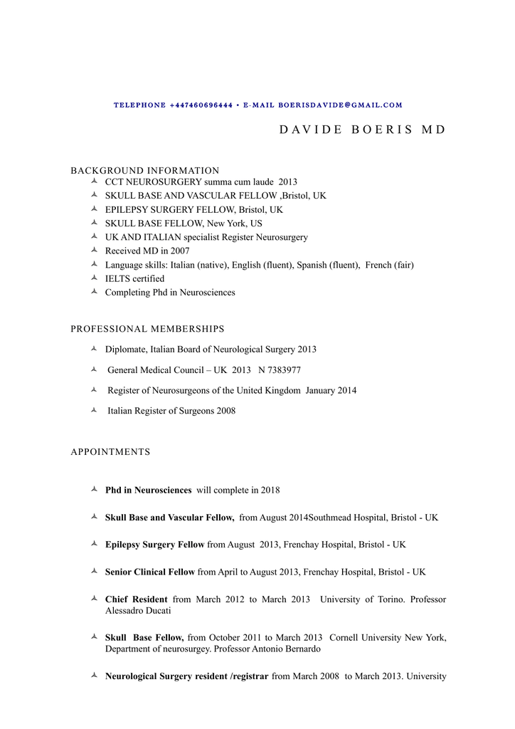 TELEPHONE +447460696444 • E-MAIL BOERISDAVIDE @GMAIL.COM D AV I D E B O E R I S M D BACKGROUND INFORMATION CCT NEUROSURGERY summa cum laude 2013 SKULL BASE AND VASCULAR FELLOW ,Bristol, UK EPILEPSY SURGERY FELLOW, Bristol, UK SKULL BASE FELLOW, New York, US UK AND ITALIAN specialist Register Neurosurgery Received MD in 2007 Language skills: Italian (native), English (fluent), Spanish (fluent), French (fair) IELTS certified Completing Phd in Neurosciences PROFESSIONAL MEMBERSHIPS Diplomate, Italian Board of Neurological Surgery 2013 General Medical Council – UK 2013 N 7383977 Register of Neurosurgeons of the United Kingdom January 2014 Italian Register of Surgeons 2008 APPOINTMENTS Phd in Neurosciences will complete in 2018 Skull Base and Vascular Fellow, from August 2014Southmead Hospital, Bristol - UK Epilepsy Surgery Fellow from August 2013, Frenchay Hospital, Bristol - UK Senior Clinical Fellow from April to August 2013, Frenchay Hospital, Bristol - UK Chief Resident from March 2012 to March 2013 University of Torino. Professor Alessadro Ducati Skull Base Fellow, from October 2011 to March 2013 Cornell University New York, Department of neurosurgey. Professor Antonio Bernardo Neurological Surgery resident /registrar from March 2008 to March 2013. University of Torino. Professor Alessadro Ducati Internship Ospedale Oftalmico Torino, Universitary Clinic from 2006 to 2007 SURGICAL EXPERIENCE: 1450 procedures concerning head and spine. Prevalent interest in cranial surgery. (SEPT 2015) EDUCATION: Diploma of Italian Board of Neurological Surgery (Summa cum laude), Faculty of Medicine and Surgery, University of Torino, Italy. 2013 Diploma of Professional Qualification, Faculty of Medicine and Surgery, University of Torino, Italy. 2008 Doctor of Medicine and Surgery, Faculty of Medicine and Surgery, University of Torino, Italy. 2007 (Full Marks) Diploma di Maturita’ Classica (Classical Humanistic Lycee) College Vittorio Alfieri, Torino, Italy 2001 TEACHING EXPERIENCES: Faculty at the Skull Base Surgery Course. Skull base approaches hands on course, March 2015, Bristol, UK Teaching session for registrars, Approaches to the Posterior fossa, September 2014, Southmead Bristol Teaching Session for registrars, Anatomy of The Frontorbital Zygomatic Approach, February 2014, Bristol Teaching Session for registrars, Anatomy of the Cerebello-Pontine Angle, September 2013, Bristol Faculty at The Anspach Skull Base Surgery Course, Approches to willis circle, De Mainis, Cardarelli Napoli. 15/16 Jenuary 2013 Faculty at The cervical spine Surgery Course for senior Orthopedic residents and senior neurosurgical residents, Menaggio Como. September 2012 Faculty at The Anspach Skull Base Surgery Course for senior ENT residents and senior neurosurgical residents, Menaggio Como. September 2012 Faculty at TheVisionsense Skull Base Surgery Course for Neurosurgeons and ENT for the 3D Endoscopy course of Alessandro Ducati, Torino 20/22 April 2012 Anatomy teacher during my skull base fellowship to medical students, Cornell University, 2012 Faculty at The Spine Course MITOsi for senior neurosurgical residents, Naples, Jenuary 2012 Faculty at The Anspach Skull Base Surgery Course for senior neurosurgical residents, Antonio Bernardo New York1 5/17 December 2011 Faculty at The cervical spine Surgery Course for senior Orthopedic residents and senior neurosurgical residents, Menaggio Como. September 2011 Faculty at The Anspach Skull Base Surgery Course for senior ENT residents and senior neurosurgical residents, Menaggio Como. September 2011 PAPERS PRESENTED TO SCIENTIFIC MEETINGS K Lada, E Raynolds, D Boeris Impact of the Major Trauma Network on neurosurgical patient outcomes in southwest England - Sinch 2015A Kan, D Boeris A rare case of overdrainage from a fractured lumboperitoneal shunt in an Idiopathic Intracranial Hypertension patient. -Sinch 2015D Boeris Vagus Nerve Stimulation for the Management of untractable Epilepsy, 16 years experience of the epilepsy surgery group of Bristol. -Sinch2015D Boeris Implementation of a cost effective follow-up in patient who underwent total gross resection of a grade I meningioma. -Sinch 2015Boeris D, Evins A, Ducati A Postoperative Intracranial Hypotension-associated Venous Congestion: A Potentially Fatal Operative Complication. WFNS 2013 G Anichini, D Boeris, AI Evins, E Passacantilli, J Lenzi, A Santoro, GP Cantore, R Delfini, PE Stieg, A Bernardo 3D Endoscope-Assisted Anatomy of the Foramen Magnum and CranioVertebral Junction Through a Far Lateral Approach – A Technical Note 12th National Congress of the Italian Skull Base Society. November 2012. Novara, Italy. A Bernardo, AI Evins, G Anichini, D Boeris, PE Stieg 3D Endoscope-Assisted Surgical Anatomy of the Retrosigmoid and Far Lateral Approaches.The 19th Annual Meeting of the Japanese Society for Neuroendoscopy November 2012. Tokyo, Japan. Collin Tebo; Alexander Evins; Justin Burrell; Davide Boeris; Antonio Bernardo Philip E. Stieg; 3D Orbital Anatomy as Seen in a Fronto-Orbito Zygomatic Approach Congress of Neurological Surgeons Meeting. October 2012, Chicago, IL Davide Boeris; Giulio Anichini; Alexander Evins; Alessandro Ducati; Francesco Zenga; Philip E. Stieg; Antonio Bernardo. 3D Anatomy of the Cerebello-Pontine Angle Through a Retrosigmoid Approach: A Comparative Study Using a Microscope and a 3D Endoscope. Congress of Neurological Surgeons Meeting. October 2012, Chicago, IL Giulio Anichini; Davide Boeris; Alexander Evins; Antonio Santoro; Philip E. Stieg; Antonio Bernardo. 3D Endoscope-Assisted Anatomy of the Foramen Magnum and Cranio-Vertebral Junction Through a Far Lateral Approach – A Technical Note. Congress of Neurological Surgeons Meeting. October 2012, Chicago, IL Marengo N, Boeris D, Mencarani C, Pacca P, Garbossa D. Incidental III Ventricle Cyst in an adolescent with headache Sinch 2012 Rimini Anichini G, Boeris D, Evins AI, et al. Microscopic and endoscopic 3D surgical anatomy of the far lateral appro
