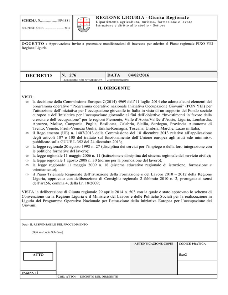 REGIONE LIGURIA - Giunta Regionale SCHEMA N....................NP/1881 D i p a r t i m e n t o a g r i c o l t u r a , t u r i s m o , fo r m a z i o n e e l a v o r o Istruzione e diritto allo studio - Settore DEL PROT. ANNO ............................ 2016 O G G E T T O : Approvazione invito a presentare manifestazioni di interesse per aderire al Piano regionale FIXO YEI Regione Liguria. DECRETO N. 276 DATA del REGISTRO ATTI AFFARI GIUNTA 04/02/2016 di SOTTOSCRIZIONE IL DIRIGENTE VISTI: • la decisione della Commissione Europea C(2014) 4969 dell’11 luglio 2014 che adotta alcuni elementi del programma operativo “Programma operativo nazionale Iniziativa Occupazione Giovani” (PON YEI) per l’attuazione dell’iniziativa per l’occupazione giovanile in Italia in vista di un supporto del Fondo sociale europeo e dell’Iniziativa per l’occupazione giovanile ai fini dell’obiettivo “Investimenti in favore della crescita e dell’occupazione” per le regioni Piemonte, Valle d’Aosta/Vallée d’Aoste, Liguria, Lombardia, Abruzzo, Molise, Campania, Puglia, Basilicata, Calabria, Sicilia, Sardegna, Provincia Autonoma di Trento, Veneto, Friuli-Venezia Giulia, Emilia-Romagna, Toscana, Umbria, Marche, Lazio in Italia; • il Regolamento (UE) n. 1407/2013 della Commissione del 18 dicembre 2013 relativo all’applicazione degli articoli 107 e 108 del trattato sul funzionamento dell’Unione europea agli aiuti «de minimis», pubblicato sulla GUUE L 352 del 24 dicembre 2013; • la legge regionale 20 agosto 1998 n. 27 (disciplina dei servizi per l’impiego e della loro integrazione con le politiche formative del lavoro); • la legge regionale 11 maggio 2006 n. 11 (istituzione e disciplina del sistema regionale del servizio civile); • la legge regionale 1 agosto 2008 n. 30 (norme per la promozione del lavoro); • la legge regionale 11 maggio 2009 n. 18 (sistema educativo regionale di istruzione, formazione e orientamento); • il Piano Triennale Regionale dell’Istruzione della Formazione e del Lavoro 2010 – 2012 della Regione Liguria, approvato con deliberazione di Consiglio regionale 2 febbraio 2010 n. 2, prorogato ai sensi dell’art.56, comma 4, della l.r. 18/2009; VISTA la deliberazione di Giunta regionale 29 aprile 2014 n. 503 con la quale è stato approvato lo schema di Convenzione tra la Regione Liguria e il Ministero del Lavoro e delle Politiche Sociali per la realizzazione in Liguria del Programma Operativo Nazionale per l’attuazione della Iniziativa Europea per l’occupazione dei Giovani; Data - IL RESPONSABILE DEL PROCEDIMENTO (Dott.ssa Lucia Schifano) AUTENTICAZIONE COPIE fixo2 ATTO PAGINA CODICE PRATICA : :1 COD. ATTO : DECRETO DEL DIRIGENTE REGIONE LIGURIA - Giunta Regionale SCHEMA N....................NP/1881 D i p a r t i m e n t o a g r i c o l t u r a , t u r i s m o , fo r m a z i o n e e l a v o r o Istruzione e diritto allo studio - Settore DEL PROT. ANNO ............................ 2016 VISTO il decreto direttoriale del Ministero del Lavoro e delle Politiche Sociali del 4 aprile 2014 n. D.D. 237/Segr D.G.\2014 con cui sono state ripartite le risorse del “Piano di attuazione italiano della Garanzia per i Giovani” tra le Regioni e la Provincia Autonoma di Trento, attribuendo alla Liguria risorse per 27.206.895,00 euro per la realizzazione del Programma in parola; VISTA la deliberazione di Giunta regionale 6 giugno 2014 n. 703 con la quale è stato approvato il “Piano di attuazione regionale per la realizzazione in Liguria del Programma Operativo Nazionale per l’attuazione della Iniziativa Europea per l’Occupazione dei Giovani”; VISTA la deliberazione di Giunta regionale 25 luglio 2014 n. 950 con la quale sono stati approvati gli atti necessari per la realizzazione in Liguria dell’Iniziativa Europea per l’Occupazione dei Giovani, in attuazione della Convenzione con il Ministero del Lavoro e delle Politiche Sociali e del Piano di Attuazione Regionale, approvati rispettivamente con le citate d.G.R. 503/2014 e 703/2014; VISTA la deliberazione della Giunta regionale 27 marzo 2015, n. 466 che dispone la nuova formulazione, l’adozione di correttivi e il perfezionamento delle azioni e delle misure esemplificate nelle schede (rif. Naz. 2B, 3, 5, 6 e 8), approvate con il Piano di Attuazione regionale per la realizzazione in Liguria del programma Operativo Nazionale per l’attuazione della Iniziativa Europea per l’Occupazione dei Giovani (d.G.R. 703/2014); CONSIDERATO che il Ministero del Lavoro e delle Politiche Sociali con D.D. n. 15/SEGR/D.G./2015 del 04/02/2015 ha messo a disposizione ulteriori risorse attribuite a Italia Lavoro SpA attraverso il Programma nazionale “FIXO YEI - Azioni in favore dei giovani NEET in transizione istruzione-lavoro”, articolato in Parte A - Azioni di sistema - e Parte B - Azioni dirette verso giovani NEET; PRESO ATTO che il suddetto Programma nazionale è declinato con un apposito Piano regionale denominato “Piano Regionale FIXO YEI - Liguria” e che le finalità del Programma FIXO YEI sono quelle di rafforzare gli strumenti d’intervento sui giovani NEET diplomati e laureati, affinché possano accedere alla Garanzia Giovani, ricevere informazioni puntuali sui servizi disponibili ed essere accompagnati nella fruizione di una delle misure a loro dedicate; VISTA la deliberazione di Giunta regionale 23 dicembre 2015 n. 1449 di approvazione dello schema di convenzione fra Ministero del Lavoro e delle Politiche Sociali, Regione Liguria e Italia Lavoro SpA per l’attuazione del Programma FIXO-YEI – Azioni in favore dei giovani NEET in transizione istruzione- lavoro; CONSIDERATO che la richiamata dGR n. 1449/2015, fra l’altro, conferisce mandato al Dirigente del Settore Sistema Scolastico Educativo Regionale ad individuare, mediante procedura di manifestazione di interesse, gli istituti che aderiranno al Piano Regionale destinato alle scuole di cui all’articolo 5 della suddetta convenzione; DATO atto che