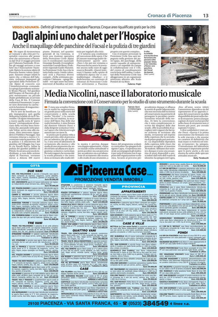 Cronaca di Piacenza LIBERTÀ Domenica 20 gennaio 2013 13 VERSO L’ADUNATA - Definiti gli interventi per ringraziare Piacenza.Cinque aree riqualificate gratis per la città Dagli alpini uno chalet per l’Hospice Anche il maquillage delle panchine del Facsal e la pulizia di tre giardini ■ Un segno di riconoscenza al Comune e alla città per l’ospitalità concessa alle penne nere che arriveranno a Piacenza dal 10 al 12 maggio prossimi per l’Adunata Nazionale. Di solito gli omaggi arrivano a cose fatte ma l’Associazione Nazionale Alpini e la sezione alpini di Piacenza hanno voluto anticipare. Saranno cinque infatti le opere che, a ridosso dell’Adunata, vedranno impegnati gli specialisti della Protezione Civile Alpini di concerto con l’Amministrazione comunale. Lo spiega il presidente sezionale Bruno Plucani. Nel giardino dell’Hospice di Piacenza gli alpini monteranno un piccolo chalet prefabbricato al servizio della Casa di Iris. Il Comune realizzerà il basamento. Le penne nere doneranno la casetta avrà la funzione di magazzino e la monteranno. Poi le aree da bonificare. La più impegnativa sarà quella della pista ciclabile di via IV Novembre. Gli alpini rimetteranno a nuovo quella sorta di “parco lineare” corrispondente al tracciato della vecchia linea ferroviaria che, passando sotto piazzale Veleia, arriva sino alla stazione. Altro intervento riguarderà il Pubblico Passeggio. Qui verranno rimesse a nuovo e riverniciate tutte le panchine. Poi la pulizia e il rifacimento del giardino del Villaggio Ina Casa in via Nasalli Rocca. Infine la pulizia dei giardini pubblici di Pittolo. In un’area ancora da individuare, a cura della sezione alpini di Piacenza, verranno messe a dimora 400 nuove piante. Domani, nel quartier generale di via Cremona, si terrà una riunione operativa della Protezione Civile Alpini con il coordinatore nazionale Giuseppe Bonaldi, il consigliere nazionale Corrado Bassi, il referente regionale Guido Manzini. La Protezione Civile Ana (che in tutta Italia conta 14mila volontari) avrà a Piacenza diversi compiti. «Nella settimana precedente l’Adunata - spiega Bonaldi - noi ogni anno facciamo interventi di bonifica sul terri- torio per regalarli alla città». C’è tuttavia una condizione all’esecuzione delle opere. Che il Comune mantenga pulite definitivamente queste aree. «Non è che poi noi veniamo a Piacenza fra tre anni e le troviamo ancora nello stato di oggi» osserva Bonaldi. «Questi interventi li faremo nello spirito di solidarietà alpina che ci contraddistingue - ribadisce - e vi dedicheremo un centinaio di volontari di Protezione Civile che arriveranno a Piacenza proprio con questo compito». Con il restante personale la Protezione Civile Ana sarà impegnata nella gestione dei posti tappa, dei parcheggi, della sanità (squadre di autoprotezione e un ospedale da campo in collaborazione con il 118), del centro di coordinamento con le forze dell’ordine. I volontari della Protezione Civile Ana alloggeranno in un capannone attrezzato allestito allo Scalo Pontieri di via Bixio. In alto: la ciclabile e la vecchia linea ferroviaria che passano sotto piazzale Veleia e via Colombo; a fianco: una panchina del Facsal da riparare (foto Lunini) Federico Frighi Media Nicolini,nasce il laboratorio musicale Firmata la convenzione con il Conservatorio per lo studio di uno strumento durante la scuola ■ È stata una semplice firma, ma in realtà ha rappresentato un grande passo nella storia del conservatorio e della scuola media “Nicolini”: è la convenzione che ieri mattina, in occasione dell’Open Day delle due realtà formative, è stata firmata dal direttore Fabrizio Dorsi e dalla dirigente scolastica Cristina Capra e che Libertà aveva già annunciato un mese fa. In pratica per la prima volta a essere previsto, oltre al percorso pre-accademico che già esisteva, è una sorta di laboratorio di avviamento alla musica e allo studio di uno strumento che andrà di fatto ad affiancarsi al programma scolastico curricolare. Per tutti i ragazzi che escono dalla scuola primaria e che intendono avvicinarsi allo studio del- Fabrizio Dorsi e Cristina Capra (foto Lunini) la musica è prevista dunque una doppia opportunità: «Dopo un iniziale esame attitudinale si potrà accedere sia a un percorso pre-accademico sia a un laboratorio di avviamento alla musica e allo studio di uno strumento, a accademico dunque si affianca la novità di quello laboratoriale, che non necessita dell’iscrizione al Conservatorio ma permette di proseguire la peculiare caratterizzazione musicale della media». Di fatto la convenzione, che è stata completamente riscritta dai dirigenti delle due scuole, offre la possibilità di accogliere tutti i ragazzi che facciano richiesta di iscrizione alla media, ovviamente nel rispetto della copertura che la secondaria di primo grado può assicurare: «La disponibilità dipenderà dalla capienza delle classi che possono accogliere al massimo 30 studenti. Abbiamo due sezioni e dunque ci sono una sessantina di posti disponibili a prescindere dall’esito dell’esame di idoneità» ha spiegato ieri Capra, fianco del programma scolastico curricolare» ha spiegato la dirigente Capra, «l’esperienza musicale accompagnerà gli studenti per tutto il triennio con il supporto dell’organizzazione scolastica. Accanto al percorso pre- CITTÀ DUE VANI VIC. VIA MALCHIODA in piccola e tranquilla casa app.to libero composto da ingresso, soggiorno, cucina abitabile, letto, bagno, cantina, lavanderia, giardino di proprietà risc. aut. buone condizioni. Euro 85.000,00 VIC. UNIVERSITÀ app.to di nuova costruzione con ingresso indipendente ampio terrazzo box, ottime finiture. Euro 99.000,00 VIC. PIAZZA DUOMO in palazzo storico ristrutturato app.to libero composto da soggiorno-cucina, letto, bagno, cantina (poss. box) Euro 140.000,00 CAMPO S. VECCHIO in piccola palazzina app.to libero ristrutturato recentemente composto da ingresso, soggiorno, cucina, l