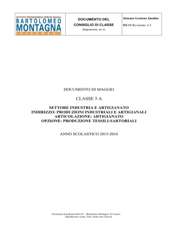 DOCUMENTO DEL CONSIGLIO DI CLASSE (Regolamento, art. 5) Sistema Gestione Qualità D2-11 Revisione n.3 DOCUMENTO DI MAGGIO CLASSE 5 A SETTORE INDUSTRIA E ARTIGIANATO INDIRIZZO: PRODUZIONI INDUSTRIALI E ARTIGIANALI ARTICOLAZIONE: ARTIGIANATO OPZIONE: PRODUZIONE TESSILI-SARTORIALI ANNO SCOLASTICO 2015-2016 Documento di proprietà dell’I.I.S.. “Bartolomeo Montagna” di Vicenza. Riproduzione vietata. Tutti i diritti sono riservati. Sistema Gestione Qualità DOCUMENTO DEL CONSIGLIO DI CLASSE D2-11 Revisione n.3 (Regolamento, art. 5) CLASSE 5A PTS anno scolastico 2015-16 Coordinatore di Classe Prof. GIADA TONIELLO Profilo educativo, culturale e professionale dello studente Il profilo del settore industria e artigianato si caratterizza per una cultura tecnico-professionale, che consente di operare efficacemente in ambiti connotati da processi di innovazione tecnologica e organizzativa in costante evoluzione . Il Diplomato di istruzione professionale nell'indirizzo “Produzioni industriali e artigianali” interviene nei processi di lavorazione, fabbricazione, assemblaggio e commercializzazione di prodotti industriali e artigianali. Le sue competenze tecnico-professionali sono riferite alle filiere dei settori produttivi e specificatamente sviluppate in relazione alle esigenze espresse dal territorio. L'opzione “Produzione tessili-sartoriali” è finalizzata a conservare e valorizzare stili, forme e tecniche proprie della storia artigianale locale e per salvaguardare competenze professionali specifiche del settore produttivo-tessile-sartoriale. Presentazione sintetica della classe a) Storia del biennio conclusivo del corso di studi La classe è composta da n. 19 studentesse; provenienti dalla 4 PTS dell'anno scolastico 2014/15 che era composta da 22 ragazze. Nessuna alunna risulta essere ripetente. Sono presenti una studentessa con diagnosi di DSA e una allieva con programmazione differenziata di tipo B. La documentazione relativa è a disposizione della commissione. b) Continuità didattica nel biennio Nell’ultimo biennio non si è mantenuta la continuità didattica; risultano pertanto sostituiti i docenti di -Lingua e Letteratura Italiana/Storia -Tecniche di distribuzione e marketing -Religione MATERIA LINGUA E LETTERATURA ITALIANA - STORIA TECNICHE DI DISTRIBUZIONE E MARKETING RELIGIONE MATEMATICA LINGUA INGLESE PROGETTAZIONE E REALIZZAZIONE DEL PRODOTTO LABORATORI TECNOLOGICI TECNOLOGIE APPLICATE AI MATERIALI E AI PROCESSI PRODUTTIVI SCIENZE MOTORIE E SPORTIVE 4^ ANNO Chiara Peretti 5^ ANNO Michela Mannella Annamaria Perazzolo M. Rosaria Callipo Enrica Ferrari Giada Toniello Bruno Luca Nadia Coltro Luca Vaiente Enrica Ferrari Giada Toniello Bruno Luca Carla Carletti Sabrina Pellizzari Carla Carletti Sabrina Pellizzari Daniele Fattori Daniele Fattori Documento di proprietà dell’I.I.S.. “Bartolomeo Montagna” di Vicenza. Riproduzione vietata. Tutti i diritti sono riservati. DOCUMENTO DEL CONSIGLIO DI CLASSE (Regolamento, art. 5) Sistema Gestione Qualità D2-11 Revisione n.3 c) Situazione di partenza della classe nell’anno scolastico in corso La classe globalmente si presenta disciplinata e attenta, anche se talvolta i rapporti interpersonali non sono stati del tutto sereni. La classe si è sempre comportata in modo rispettoso nei confronti degli insegnanti, evidenziando un atteggiamento disponibile verso le attività proposte. Nell’ultimo anno di studi la classe non ha però dimostrato interesse o entusiasmo particolari, il gruppo si è attenuto a una partecipazione scolasticamente adeguata. Gli obiettivi raggiunti dagli alunni sono diversificati in base alla diversa partecipazione al dialogo educativo. Sotto il profilo cognitivo e dell’apprendimento, un gruppo è riuscito, applicandosi con costanza, ad affinare le proprie abilità di base, a mostrare interesse per le discipline in generale e a raggiungere gli obiettivi prefissati conseguendo un profitto molto buono, mentre alcune studentesse hanno manifestato uno studio più superficiale e hanno conseguito una preparazione generalmente sufficiente. Nell’area tecnico professionale una parte della classe ha dimostrato interesse e motivazione raggiungendo discreti risultati. Obiettivi generali (educativi e formativi) Nel corso del presente anno scolastico la maggioranza degli alunni ha consolidato la capacità di: leggere, capire e riassumere testi relativi alle diverse discipline lavorare con metodo lavorare in gruppo raccogliere, classificare, rielaborare e rappresentare dati con disegni, schemi, grafici e diagrammi relazionare su interventi ed attività discutendo un argomento con sufficiente chiarezza espositiva e corretto utilizzo della terminologia specifica individuare sequenze logiche operando collegamenti, confronti ed astrazioni semplici all’interno di una stessa disciplina e tra discipline diverse Conoscenze, competenze e abilità Per gli obiettivi cognitivi specifici si rimanda alle relazioni finali dei docenti della singole discipline (All. A) Attività extra, para, inter-curricolari: ASL / ORIENTAMENTO Periodo stage : 08 giugno 2015 - 03 luglio 2015: 160 ore stage in aziende settore Moda 04 febbraio 2016 incontro con dott. C. Nardi ‘ La contrattualistica sul lavoro’ 08 marzo 2016 incontro con esperti ufficio politiche per il lavoro Comune di Vicenza 19 marzo 2016 incontro sulla formazione ‘Privacy’, tenuta dalla prof.ssa Francesca Nisticò 08 aprile 2016 incontro con il dott. Matteo Cozza titolare ditta TAM (progettazione di una collezione di moda) 09 aprile 2016 incontro con la dott.ssa Gelaini: curriculum vitae e colloquio di lavoro La classe ha partecipato alle iniziative della rete scolastica “Orienta-insieme”, nello specifico a lezioni universitarie tenute da professori degli Atenei veneti nella Cittadella degli studi. Le alunne sono state informate dei vari open day organizzati dalle università del Veneto e, a seconda dell’interesse personale, incoraggiate a parteciparvi. Sono stati al